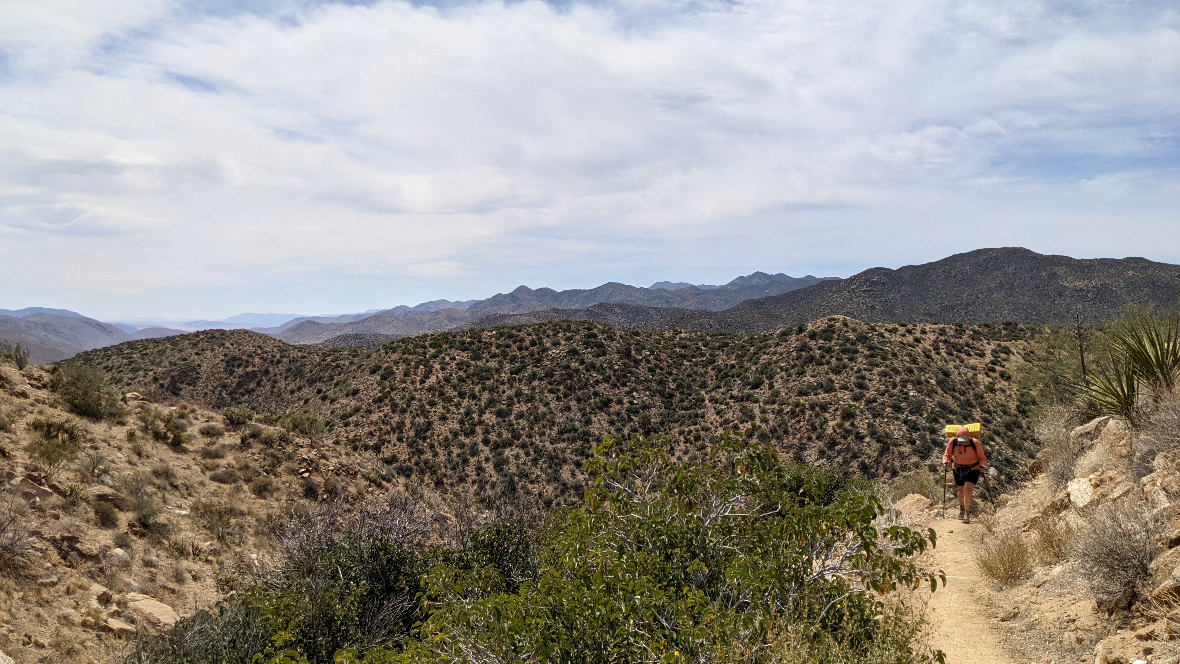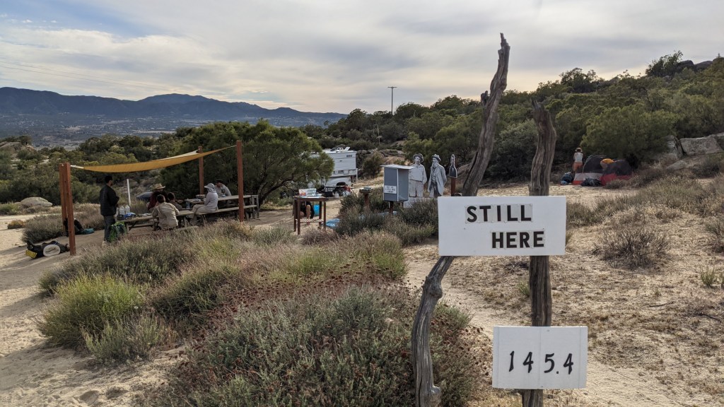 At some point last night, we both woke up to the sounds of an animal nearby, but didn’t realize what it was until the skunk smell wafted into our tent. Thankfully, it dissipated fairly quickly. We got up and on trail around 6:45. As usual, the morning has the best temps for hiking. We did 5 to our water source, which was a shallow pool in a tiny stream. We made it work though, and pressed on to lunch, 7 miles. Hunkered under a bush and intermittently napping and eating, we got back on trail around 2:30. Made it to Mary’s Hiker Oasis, which is aptly named. Mary is the most generous host. She cooked us big, healthy burritos, gave us a can of root beer, and a slice of pie with yogurt. Not to mention she has picnic tables under a shade, a hand-washing station, a little free library, free post cards she’ll send out for us, and, best of all, a giant water tank that we can use. Mary does this all for free, wouldn’t even accept a donation. Many thanks to Mary at mile 145.5! The trail angels out here are incredible. We headed back out feeling great and knew we only had to go another mile or so to find a campsite.