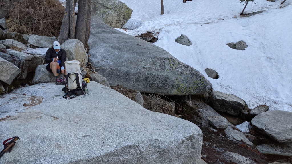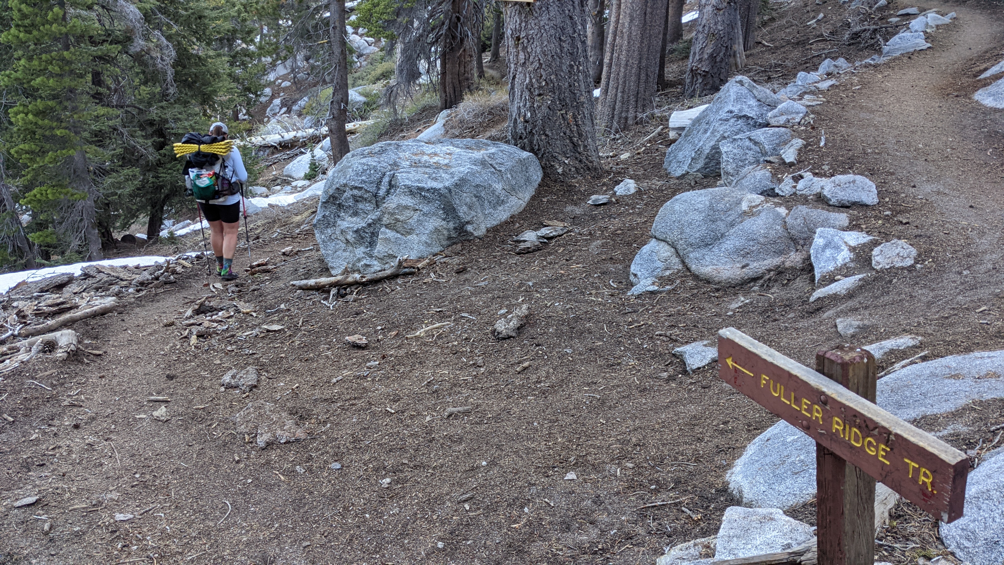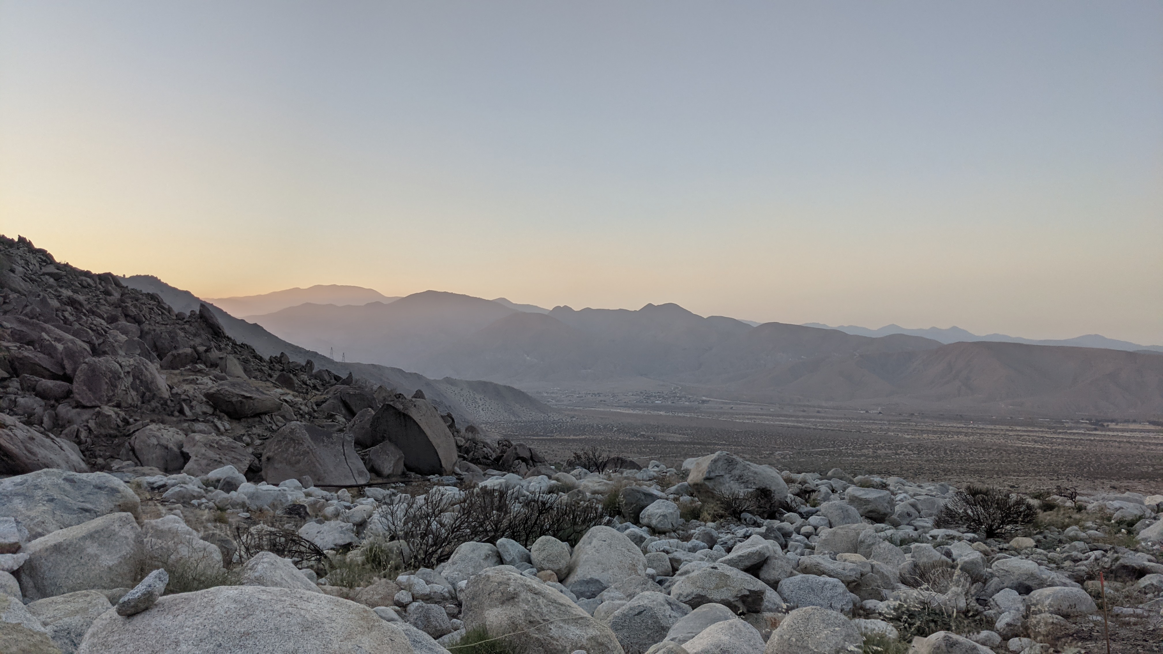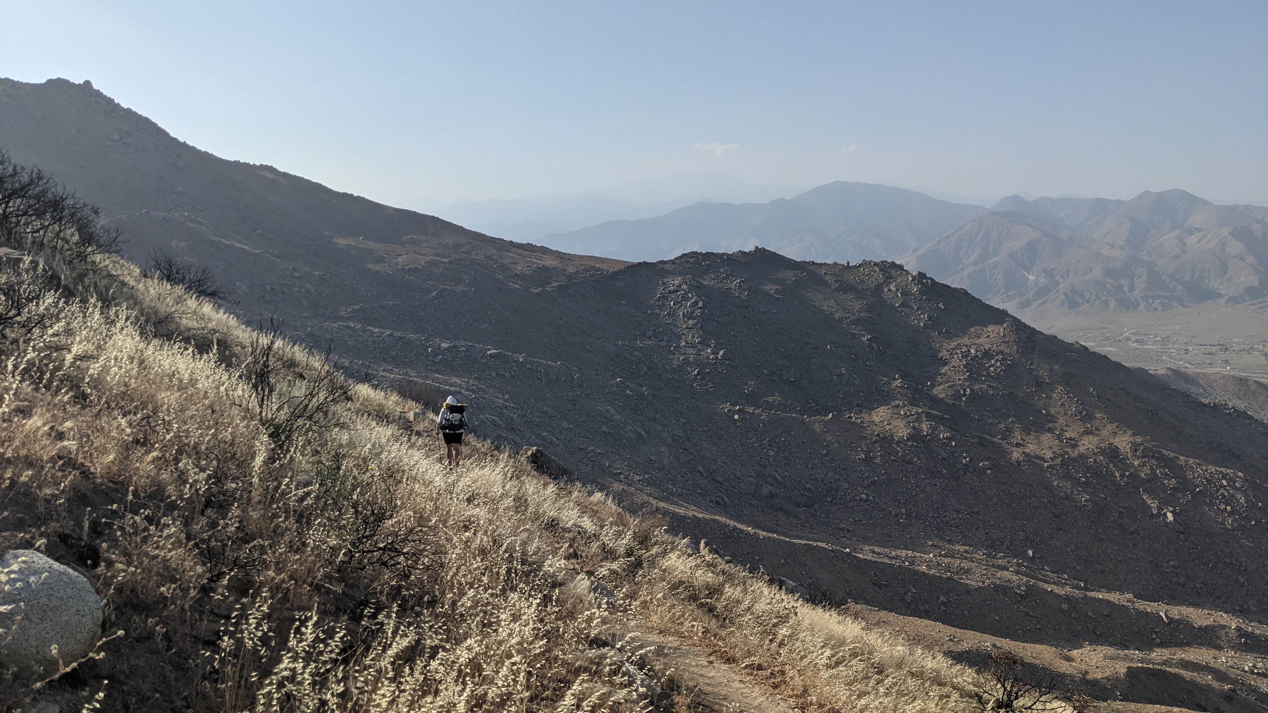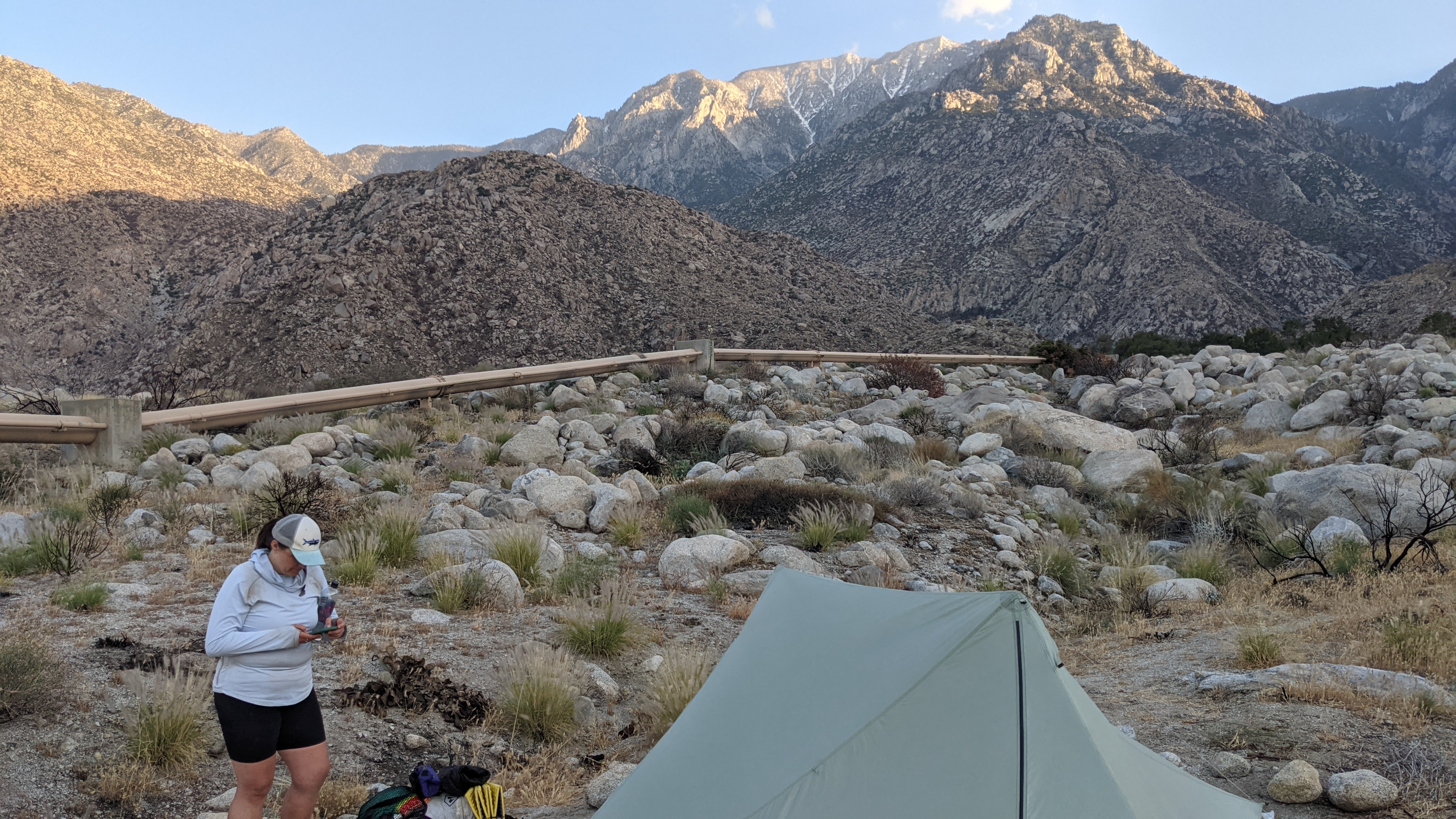 Up and on trail by 6:30, we got water from an ice cold stream. We made up the few miles we had intended to do last night, and then started the descent. All day long we descended Fuller Ridge. It took us about 12 hours, including a 1.5 hour lunch break. The trail drops about 7,500 feet as it winds down from Mt. San Jacinto. We did not choose to go bonus miles today, although Jim, Sophie, and Sam did. We met back up with them at the bottom. There is a water fountain here so there are a lot of tents & hikers around. I think everyone is planning the same 15 mile day tomorrow because it puts us at a river.