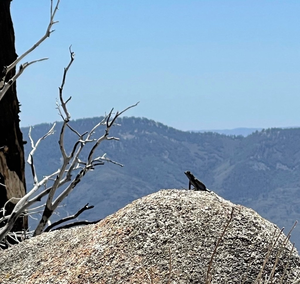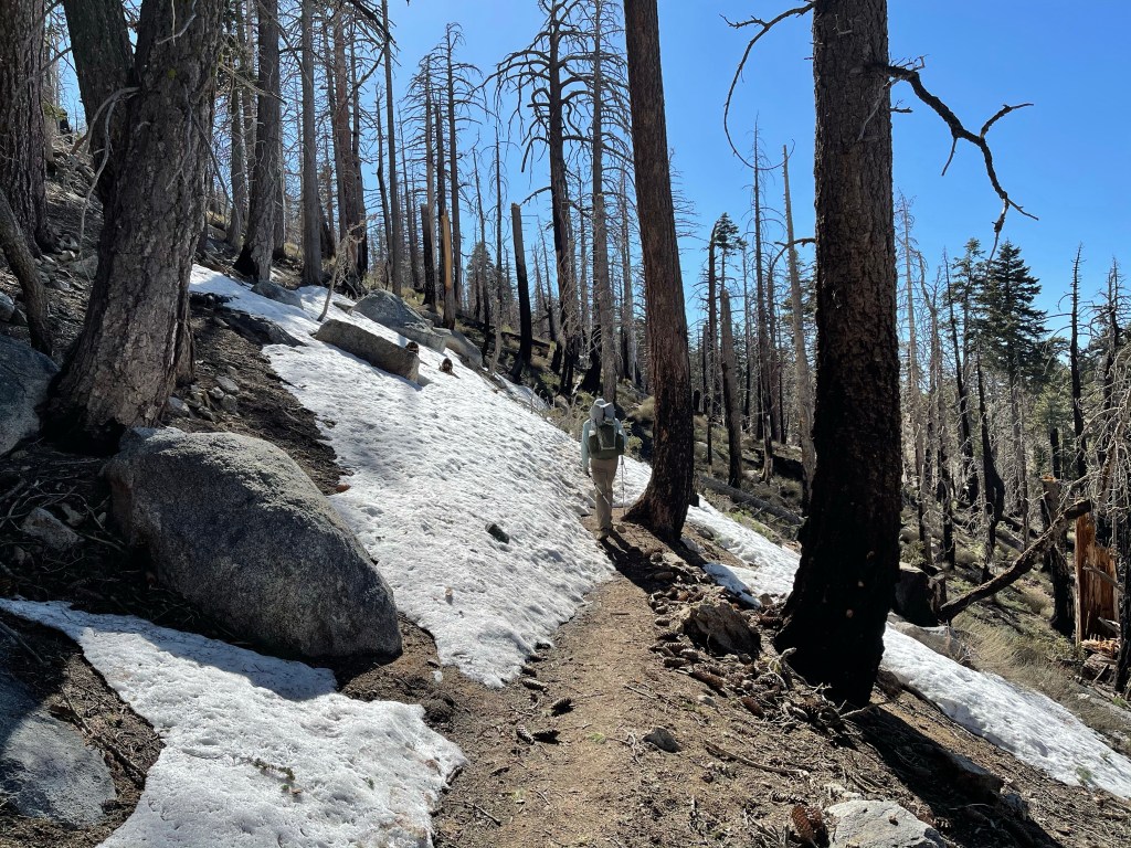 More climbing and obstacles were in store until we got to a more wooded area close to our next water source. There was also snow! Such a difference from what we’ve experienced all week. I stuck a snowball in my sleeve to cool me down. We got to the stream and I made myself drink an entire liter of icy water before we left. Only 4.5 miles to the trailhead where we could hopefully get a 2.5 mile ride to town.