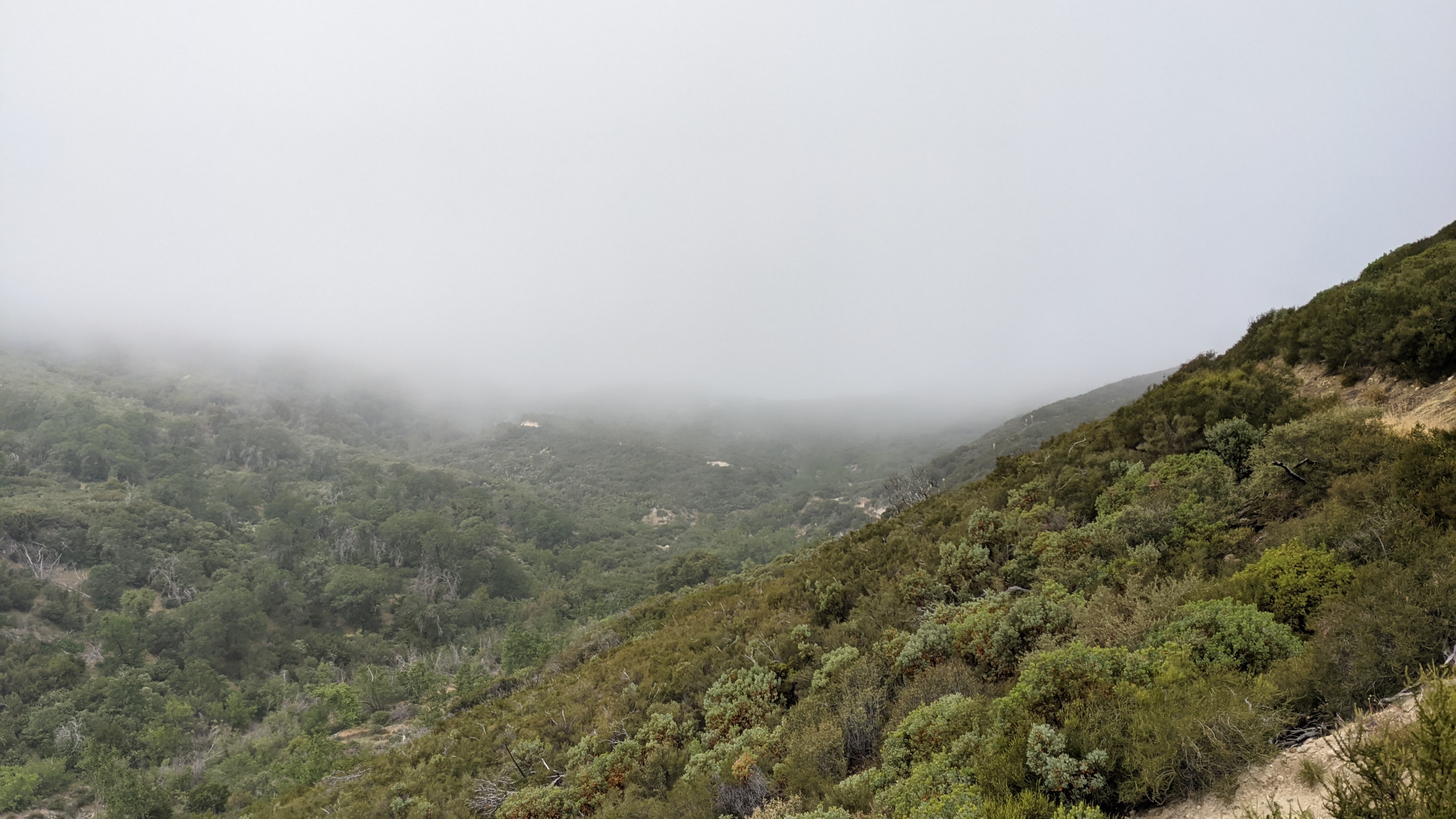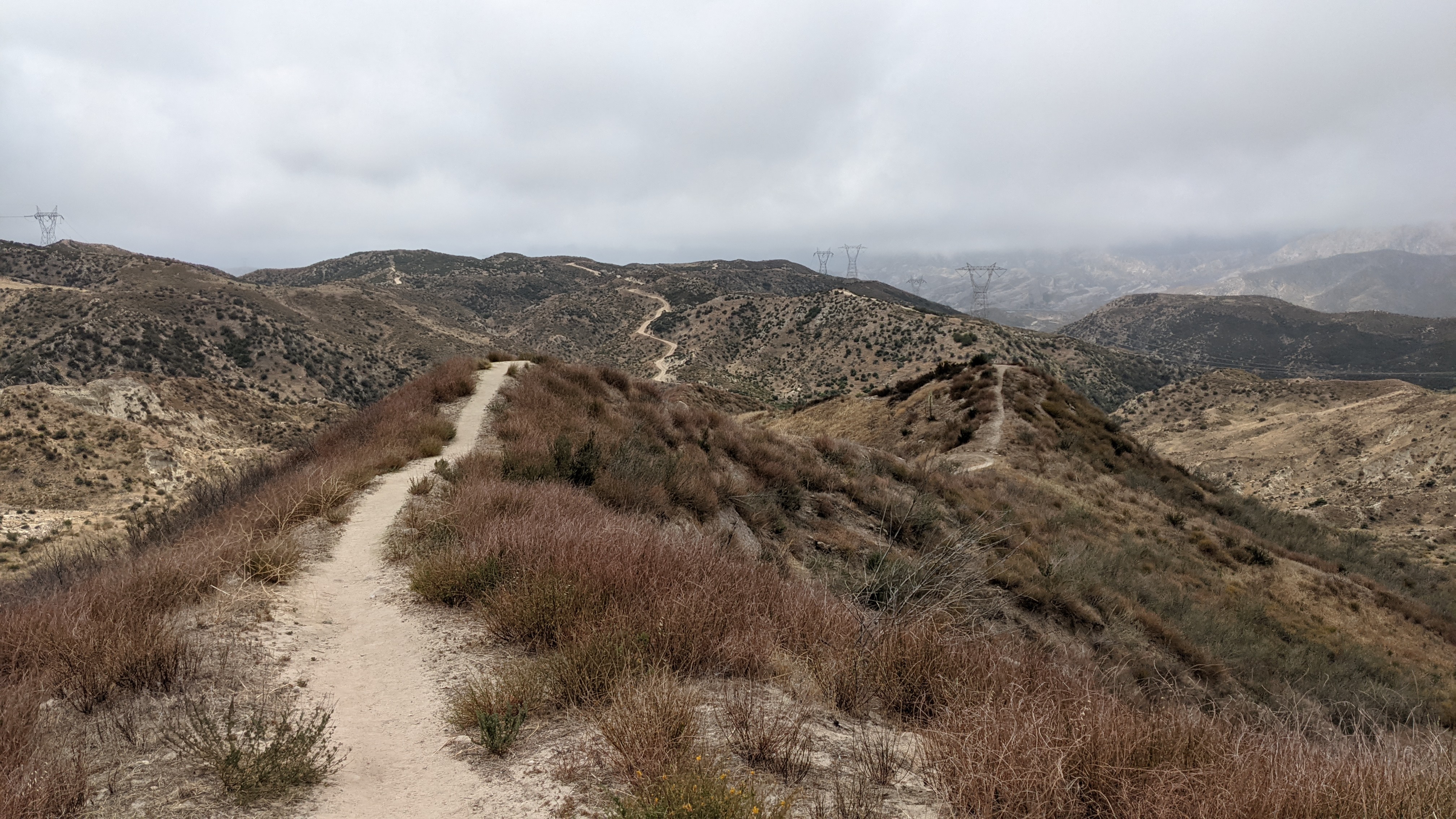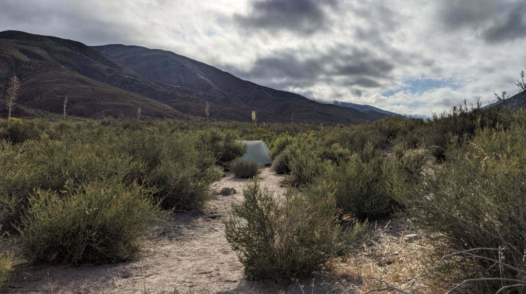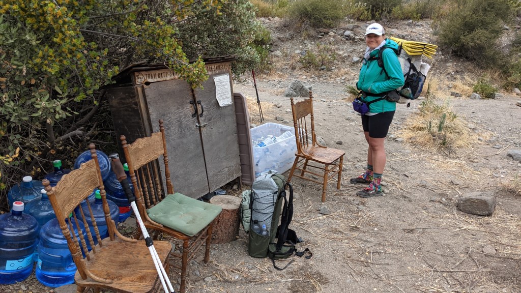 Wind was howling all night, but the tent held up great. The slight chance of rain didn’t materialize so we got lucky with the weather: cloudy, windy, and cool. Craving McDonald’s, we moved quickly hitting Mackas around 1. The hiking was fun, starting by climbing up into a misty cloud. Along the way we passed Flying, Snowflake, and Bill Nye The Hiking Guy. Then we came down to the highway over a series of ridgewalks and through a canyon. It was packed inside and out at McDonald’s, but we got our food fairly quickly. We sat in the shade of some trees at the end of the parking lot. Anywhere we go along trail, I find myself looking for other hikers. If you find one, there’s almost always a nod or waive. More often than not you learn a short story about them, talk about mileage and camp destinations, and exchange names. There’s usually a good chance you’ll see them again further up the trail. After I ate a Big Mac, large fries, large Dr. Pepper, and half of a 10-piece, we casually finished the last 5.5 miles to camp. One of the tips of my trekking poles bent after it got stuck between a couple rocks, and eventually loosened enough to fall out of the socket it was held in. I used a couple rocks to hammer it back in, but it doesn’t seem like it’ll hold forever. Tonight, camp was the Swarthout water cache. The trail angels in Wrightwood are great. They know we have a long water carry tomorrow and they restock it (I’m told) everyday during peak season. A huge help to us. There are three wood chairs next to the water where hikers can sit and eat while *not* sitting on the ground; luxury. Hoops and Forrest were already set up when we pulled in around 4:30, but we eventually were joined by Flying, Snowflake, Bill Nye, Dirty Knuckles, and (briefly) Nivil. Talk is of the fire closures (apparently, there are others now) and how to get around them, and, of course, food. The Acton closure is the main focus because it’s in our next section after Wrightwood, but that’s a problem we can figure out in town. A big climb tomorrow, but last trail day before our nero & zero. Ready for a shower! Oh, and we gave ourselves trail names. Hoops had made a comment that Marie and I know each other the best so we took that advice and Marie came up with Nose Drip for her (since she has a runny nose a lot out here) and Pole Drop for me (because every time we pause and I set my trekking poles against my hip belt, one of them falls). So, for short, we are Drip and Drop.