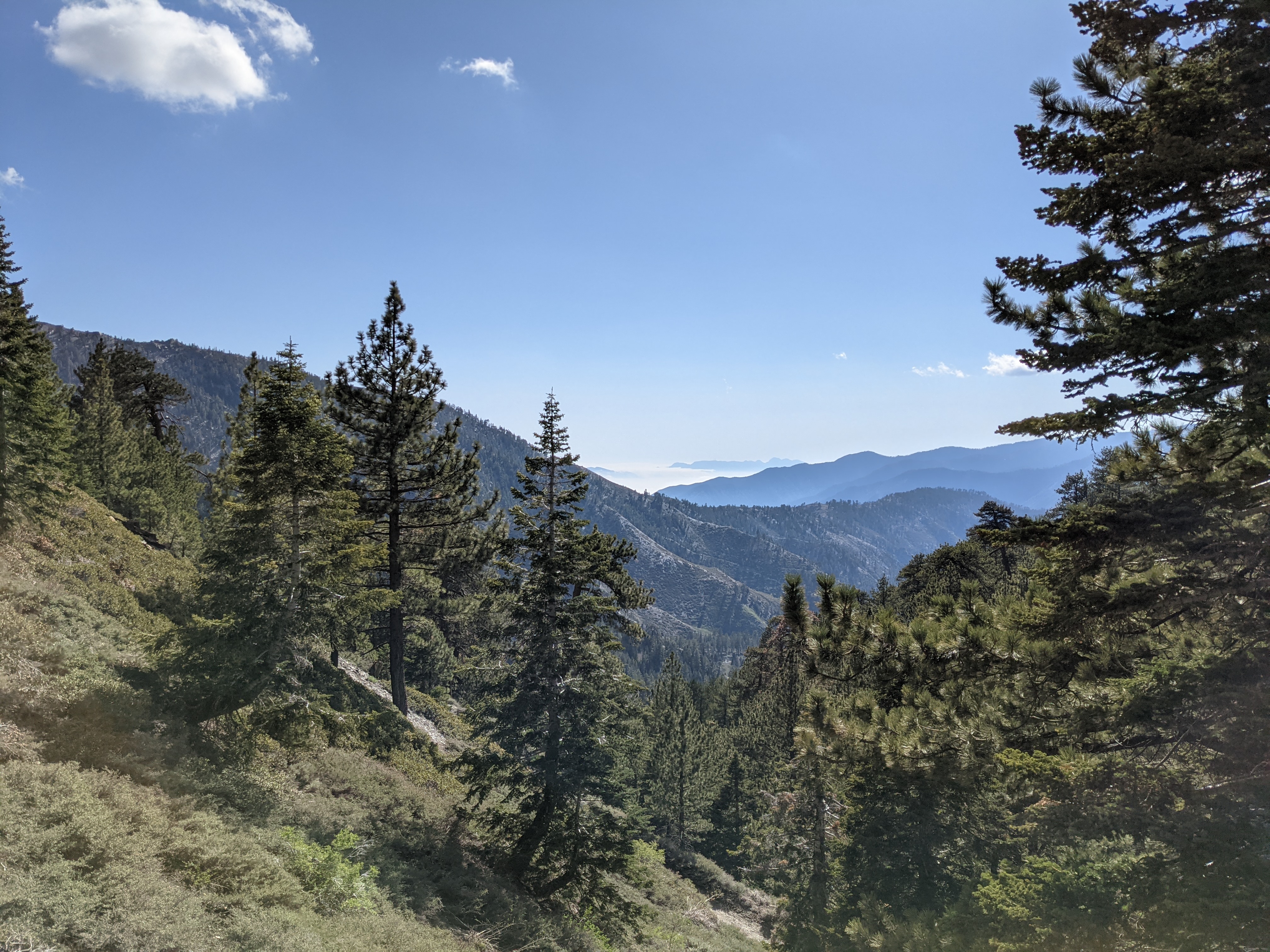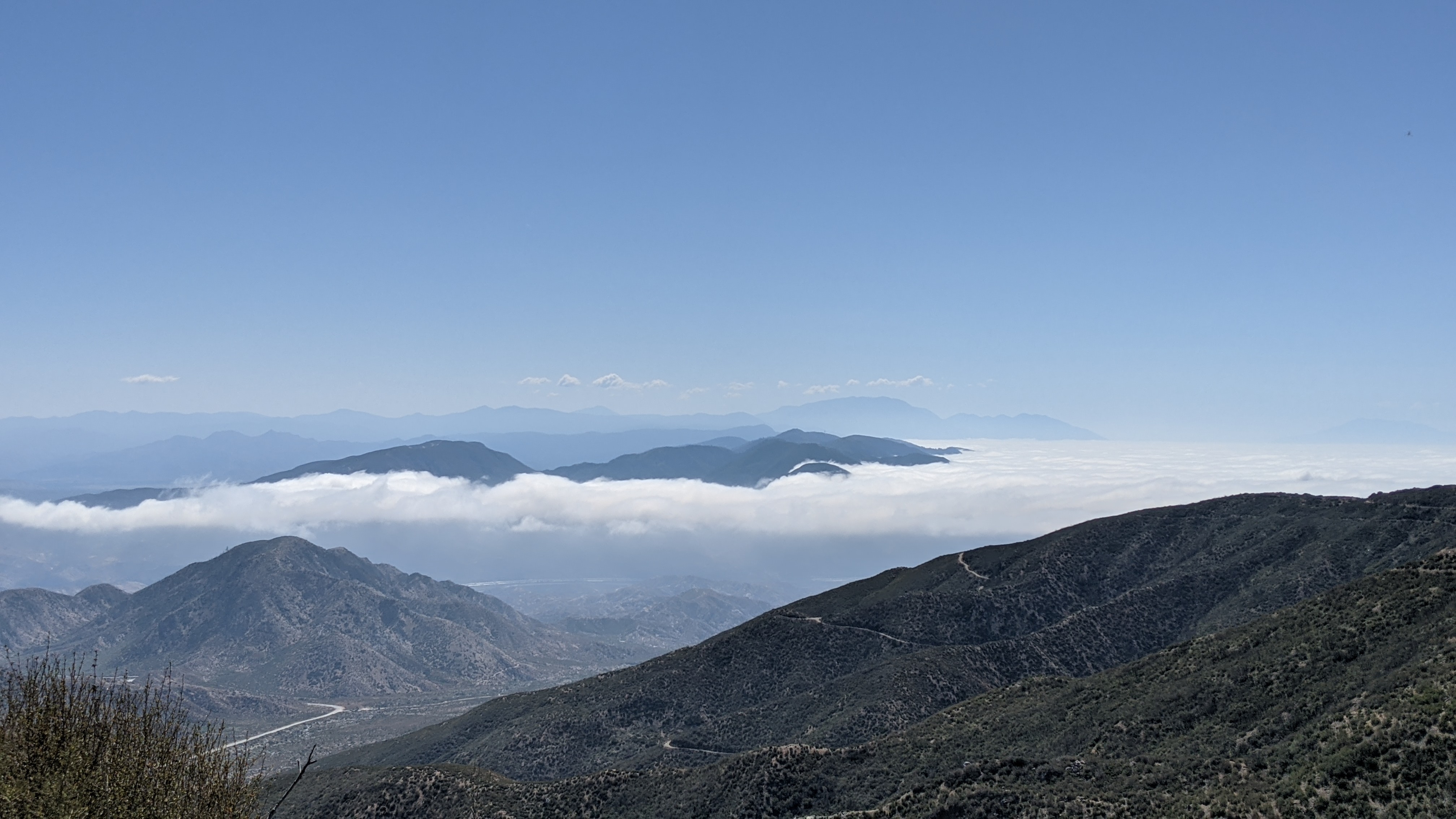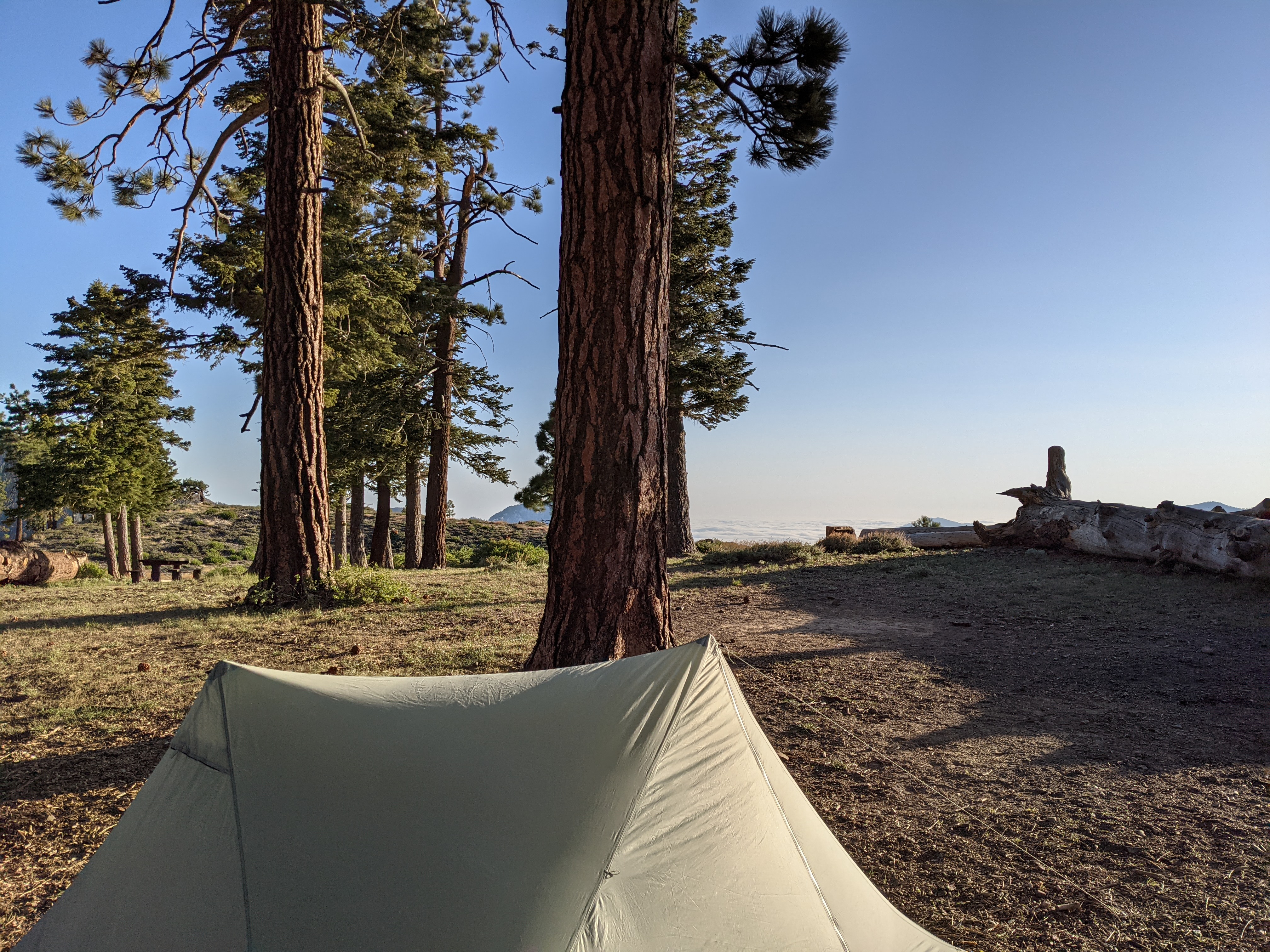 17 milesI could hear other hikers getting around in the morning before I wanted to be awake. Eventually we both sat up and started the morning routine. Topped off water at the cache before rolling out around 7. Hoops was still around, but took off while we filled up. We expected the same misty, shaded morning we had yesterday, but instead it only stayed shaded for a few miles before we were up above the clouds and in full sun. The views were great all day because of the way the clouds settled into the valley we hiked yesterday. We caught up to the whole group from last night while they were stopped for a break. The break was for snacks and booking rooms for the resupply in Wrightwood. It also seems that half the group is switching from taking a nero and a zero, to just a nero. We’re old, so sticking with the nero + zero. 5 miles tomorrow morning and then a hitch from Highway 2. We’ve heard that the road is closed, and we’ve heard it’s only partially closed. There may still be chances at getting a hitch, so we’re gonna try it. My trekking pole finally gave up on the bent tip so I will have to figure out some replacement tips in Wrightwood or maybe further up the trail/shipped. The metal that housed the tip will just get beaten up in the meantime before I can replace the whole tip. When we got done with the climb up to Huffy Campground, we found Bill Nye, Snowflake, and Flying. They were sticking with the nero + zero. Marie and I went down to get water from the spring, about 200 feet down a steep side trail. On the way I kept getting a stinging sensation near my ribs/back and thought maybe my pack straps were giving me chafe. While Drip was filling her water bottle, I took off my shirt to inspect the chafe only to find that it was some bug that was biting me. Looked like a caterpillar or mealworm thing, but it fell to the ground and I lost it in the duff before I could stomp the hell out of it. That jerk. We had a killer sunset tonight despite the wind that was testing the limits of our tent. It held up well, but we did have to restake a couple that got pulled. Looking forward to some quiet, uninterrupted sleep tomorrow in town.