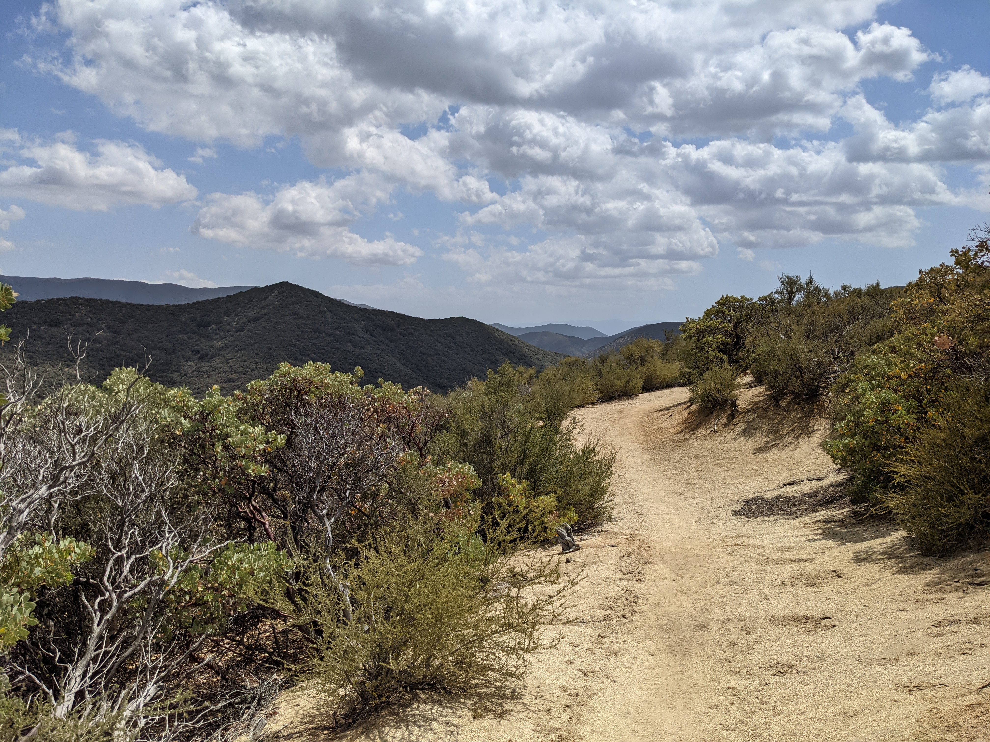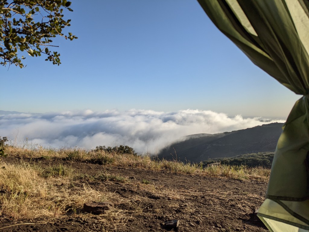 Woke up to an awesome view above the clouds. Simple Soul passed us as we were tearing down the tent. Caught up with him at the water source, and eventually Crackers joined him. There was a potential cache about 2 miles ahead so we only grabbed a little water before heading down to the road. Sure enough, the cache was well-stocked. We filled up and took a break for a snack. The next 5 miles were a mix of gradual climbs and some slight downhills. Easy rolling. We found a nice little tent site tucked off the trail that had some shade so we stopped to enjoy it. Ate lunch and watched people hike on by. Marie took a cat nap and I listened to some music on my phone. This is the first time I’ve done so on this hike. It took 471 miles to get me to crave music in the woods. I need some different songs to get stuck in my head all day. We started hiking again and knocked out the remaining few miles. We set up the outer part of our tent over the tyvek like we always do, but skipped the inner for awhile so we could stretch a little in shade. Sam later showed up and stopped for the day. A few other hikers joined us and our site filled up. We all ate dinner at roughly the same time and eventually hiker midnight arrived.