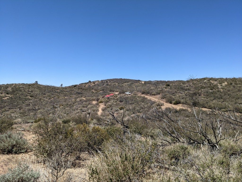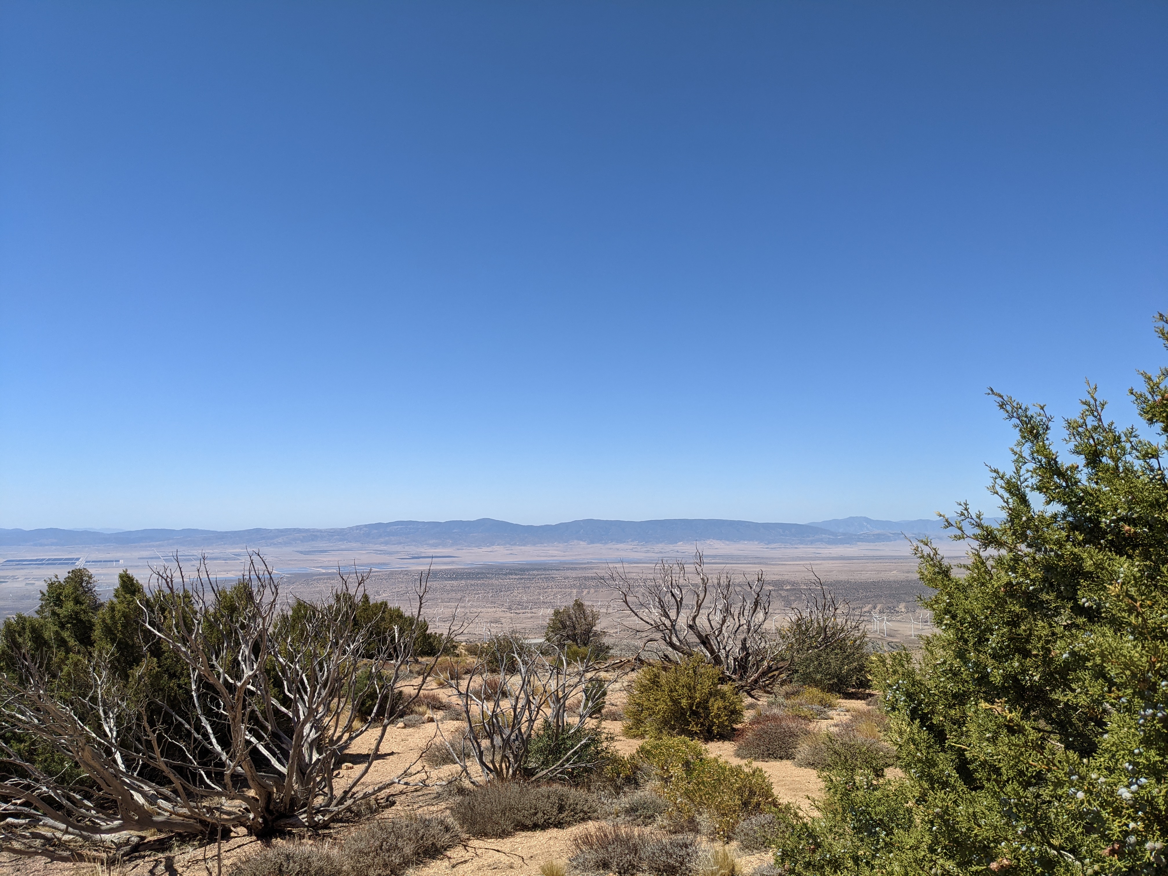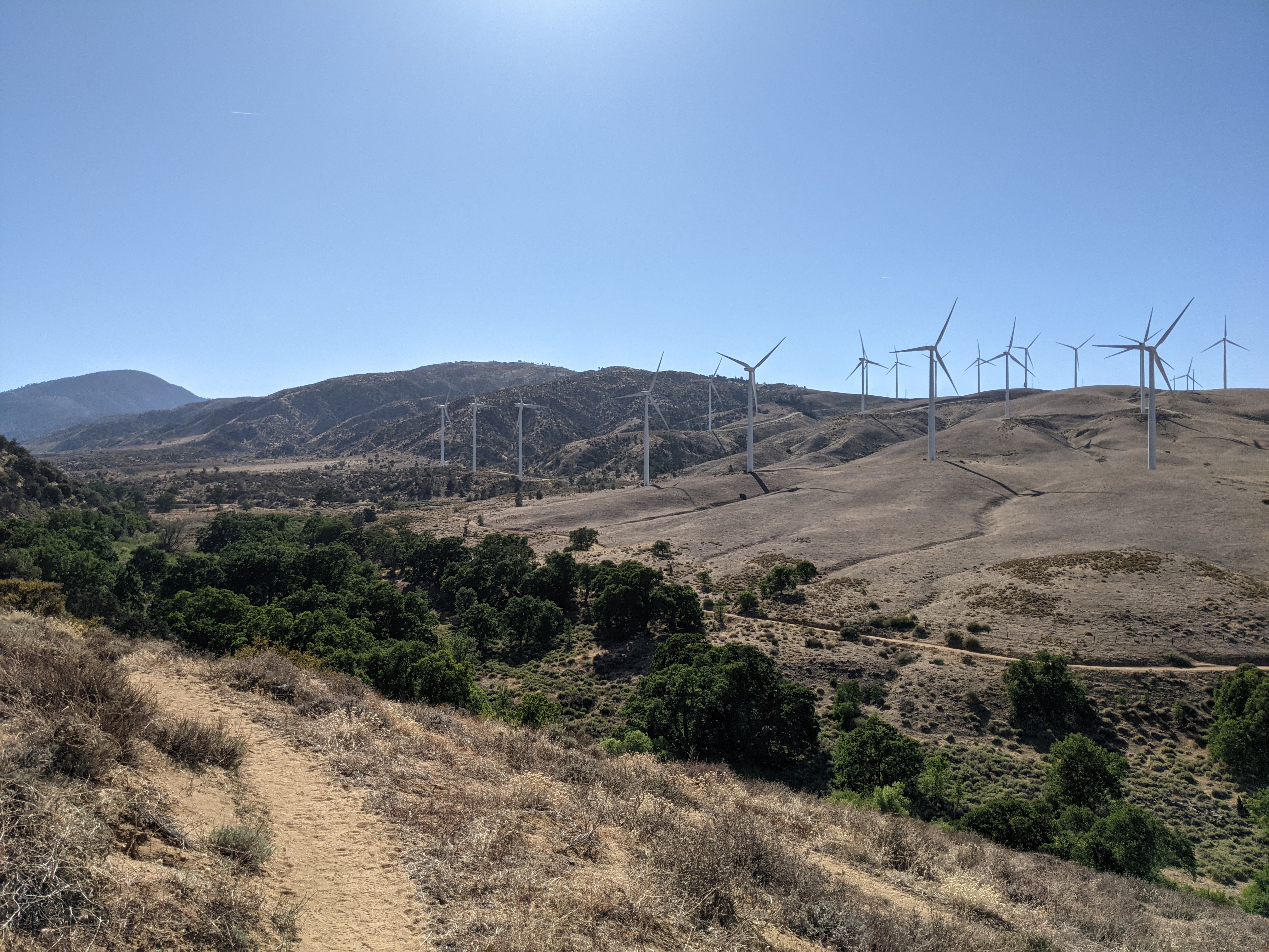 Not much sleep last night. The guyline that split back in week 1 has been tied back together a couple times, but usually holds just fine. Last night the line pulled through the tensioner around 11:30, and then split again at midnight. At that point we replaced it with a bit of cordage we had picked up in Wrightwood, but hadn’t used yet. I’m a dummy and should have done that already, but was going to wait for our zero in Tehachapi. Marie helped me get the new line run while frantically trying to keep the wind from taking the tent in the middle of the night. Oh, and a big spider decided to crawl on my foot during all of this so it was not a fun time. The wind went on for a while, but the new cordage held perfectly. In the morning we filtered water out of the dwindling flow of the creek that was beside our campsite. We carried out for 25 miles plus water for cooking because the water sources from here to the highway are dried up and the caches are not reliable. The climb up out of Tylerhorse canyon was fine. Sand isn’t fun to walk on because you always lose a bit with each step, and most of the climb was sandy. The grade wasn’t too steep though, so it went smoothly. At the top at mile 549 there was an oasis. Trail angel Daniel had set up two umbrellas for shade with chairs, had a fully stocked pantry of fresh fruit, and just refilled water jugs. It was a welcome surprise to every hiker that came through: Shortstop, A.L.W.A.Y.S (a long walk after years of software(hah!)), Tiger Blood, and Mosey. We thanked Daniel and headed up a bit further to find a spot for lunch. We found a little spot in the trees (the few that existed in this stretch) and ate. While we were there a little bug fell near me and I poked at it a little. It looked like a little rock with arms and would pull them in when threatened. Didn’t think much of it, but later at the hotel I found what might be a tick bite. I suspect that bug had bitten me and I hadn’t noticed. Of course, I started googling for ticks and such and I think it was a Pacific Coast Tick, and as long as it wasn’t carrying any diseases I should be fine. I’ll have to keep an eye on the bite the next few days to see if it develops into anything. Cruising down towards the highway, we passed a bunch of windmills and dreaded the night of wind-interrupted sleep we would surely endure. Instead, we chose the shorter path and took a hitch from Willow Springs Road. To my delight, Magic Man (trail angel from Lake Morena and again at Scissors Crossing), was there doing his thing. Was nice to see him and (very briefly) catch up. The hitch into town was from a guy paying it forward. He had done sections of the JMT so was into hiking and happened to be driving home from work. He dropped us off at our hotel, we checked in, and then browsed the hiker box. Ready for our double zero of relaxation.