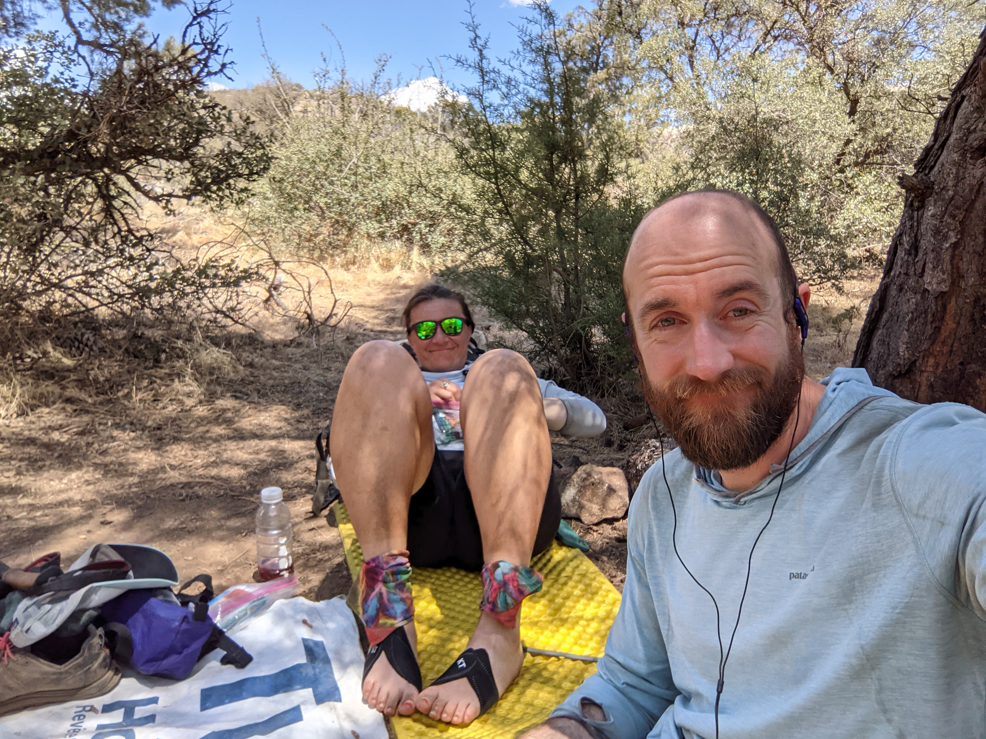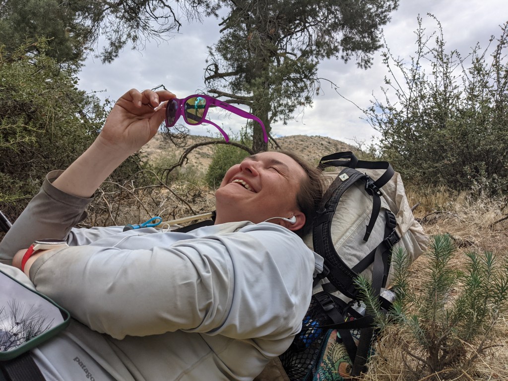 The tree served us well and we had a calm night. Gazelle passed by our tent as we were packing up. We later passed him on our way to the water source. He caught up while we were filtering. Two dudes on dirt bikes rolled in as well. They initially seemed alright, but eventually the louder of the two started making bad jokes. When he said, “Know why it’s good our bikes are black? Cuz black bikes matter! Haha!” I was done at that point so I joined Marie who had already walked away. We had planned to take a break at the spring so despite those idiots hanging out nearby, we still had a nice time off our feet. We walked a couple more hours then stopped for lunch. Shade was easy to find since we are getting more and more patches of real trees. We hung out for about 3 hours before starting back up. It was still blistering hot, but clouds on the horizon looked like rain. We got our hopes up for some rain, but none came. Still got to enjoy the shade though. We arrived at camp and I am now thinking I didn’t get enough water for tomorrow. I was thinking we had 6 in the morning, but we have 9 before our next spring. Cooler morning temps should make it okay. We’ll see.