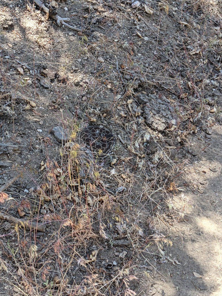 The morning was hot and I ran out of water so it was a slog to the water source. We passed the 600 mile marker! About 100 yards before the junction to the side trail to the water, I passed a rattlesnake that was beside the trail. Much too close for comfort. I stopped and warned the next hiker (Marcus from Wrightwood), and we used sticks and tree bark to get it awake and moving away from the trail. The water source was a typical pipe spring with trough, but the pipe was not flowing. Instead, we scooped water that was trickling under a barbed wire fence, right next to some cow shit. Yuck. We filtered it, and so far so good. Martin arrived as we were finishing up filling our bottles, but he did not like the scooping idea. He eventually pulled up the end of pipe going into the ground and found it packed with mud. I gave him one of our tent stakes to try to unclog it and sure enough, it started flowing again. We went ahead to break for lunch. The first shade spot was in some tall grass so we didn’t stay long. Ticks were showing up and I didn’t want to get bitten again. So we hiked a bit further. The next spot was on some rocks so we only had to brush off a stray ant from time to time. Around 3, we hiked on. The next water source was supposed to be good and it sure was! Martin was already there and he planned to stay at the campground across the road. We filled up on the cold, refreshing water and then pressed on to our campsite. It was nice being able to drink as much as I wanted at dinner because I had been so dehydrated all day after stretching one liter for so many miles. The more I drank the more calm and normal I felt.