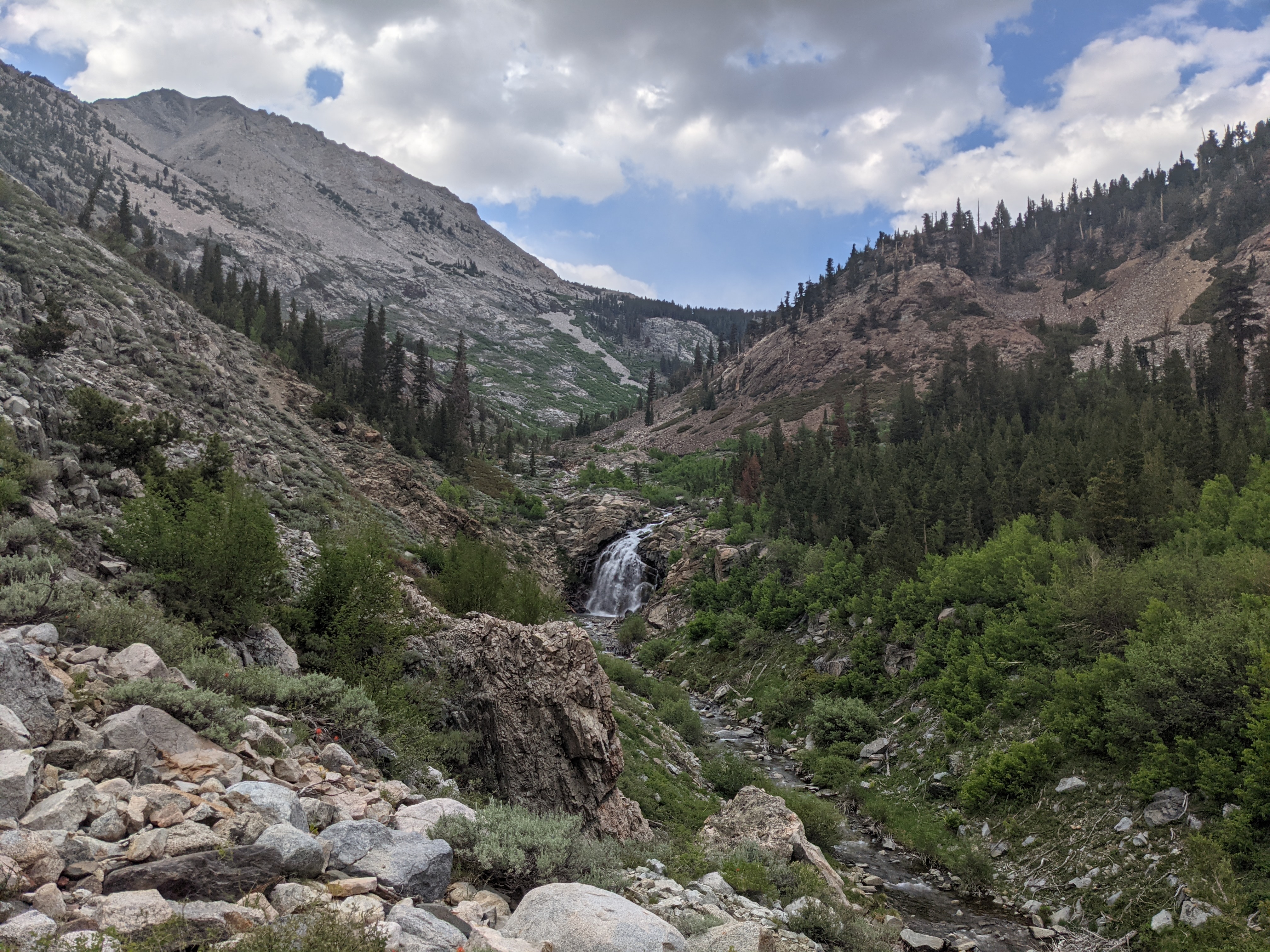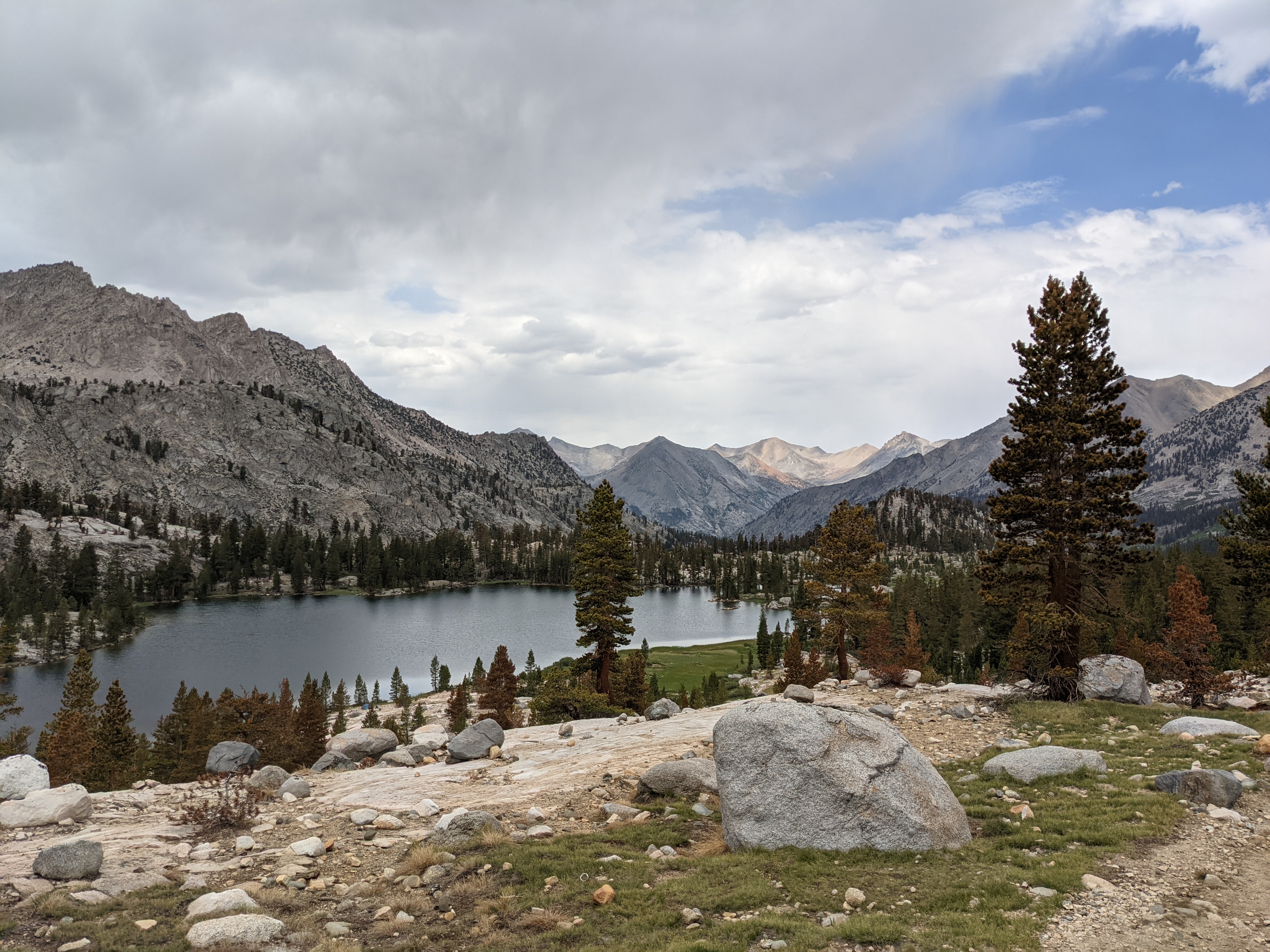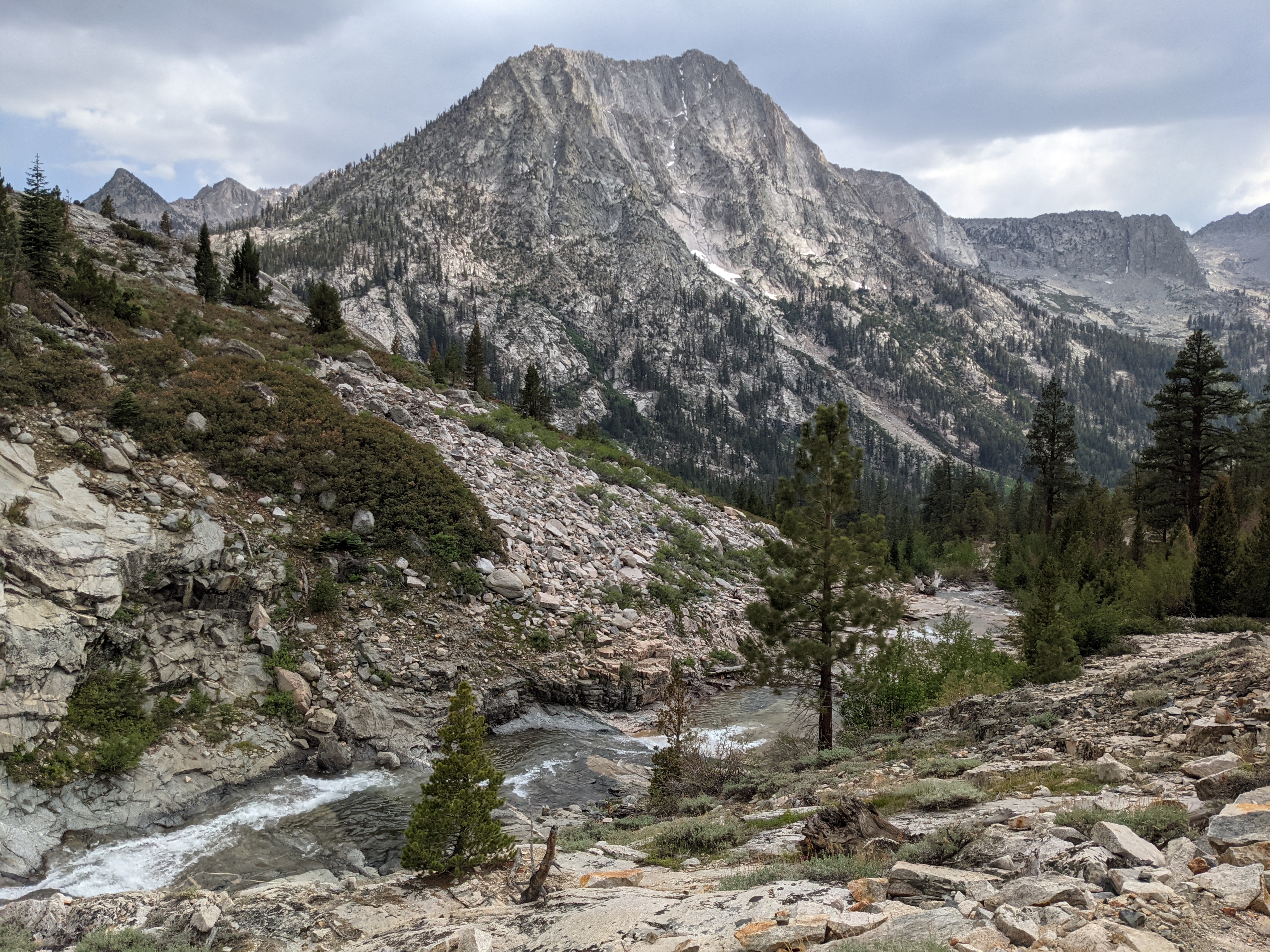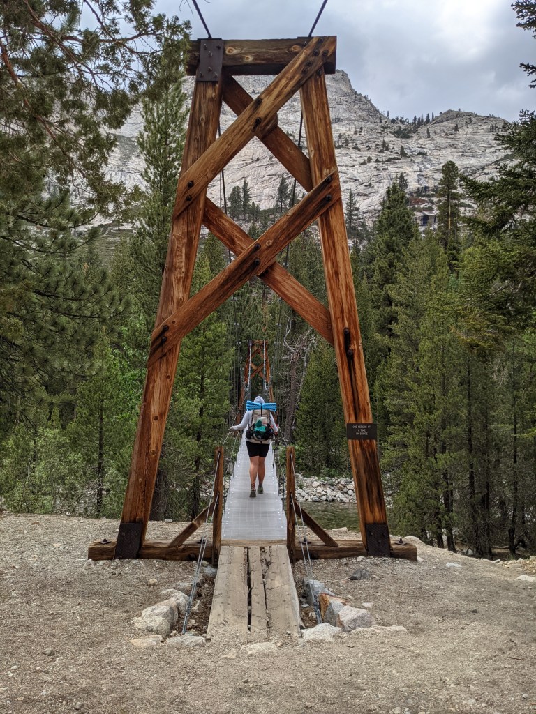Woke up to light drizzle and overcast sky. No one is moving fast this morning, but that’s okay. We got going around 9:15, super late. Climbed Glen Pass and went down the other side. Passed lots of people going up while we were descending. We figure they are probably out for a long weekend. They picked a great spot. The Rae Lakes area is top notch, even with the swarms of mosquitos. At one point I thought I heard a drone flying overhead, but it was just thousands of mosquitos nearby. We ran into Pepe, Shade, Studio 54, Lego, and Maverick at the first big lake after the pass. We stopped for a quick snack. We leafrogged Studio and Shade before stopping for lunch near a lower lake. Afterwards we finished descending and made it to a suspension bridge. It was wobbly, but seemed safe enough. The river below wasn’t too far down. A short climb later we saw the water slide, which looked fun although dangerous. More climbing to our campsite, but it means less that we’ll have to do tomorrow. We are going to shoot for two passes in one day.