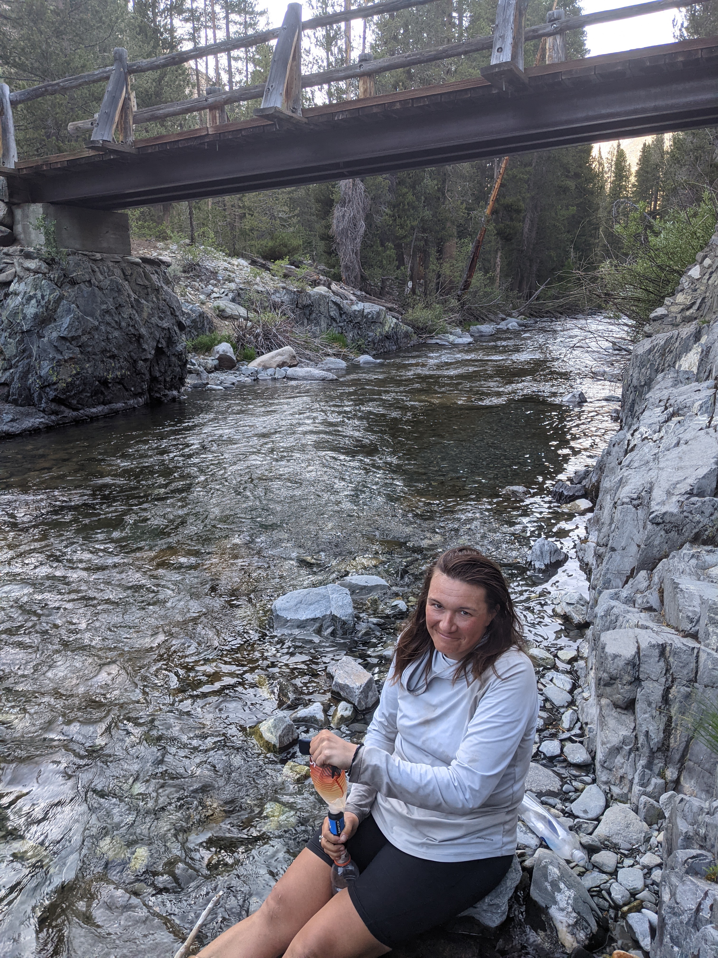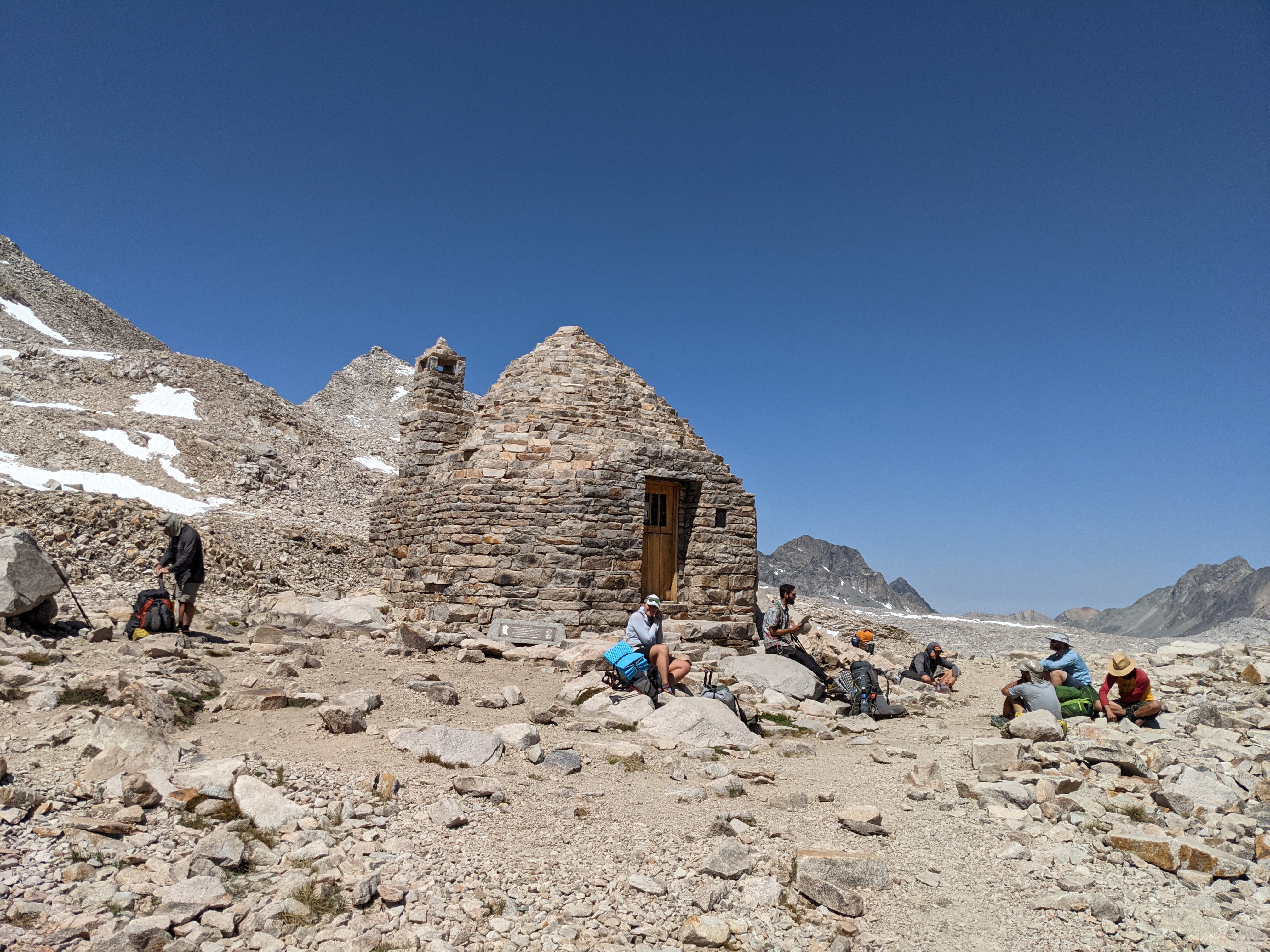 Muir Pass was the first part of the day. We got started around 8:15, and ran into Trashman at the first stream crossing. We filled up and talked about the next resupply in Mammoth Lakes. His group was going to skip VVR and push through to Mammoth by doing 17’s everyday. We had planned to hit VVR and do a quick nearo with a small resupply to Mammoth. Their plan sounded better. We just have to do a few extra miles each day and we’ll be in Mammoth by Thursday night. So, it was a great stop and chat because we wound up switching plans to get to town sooner. We have enough food to do it, so it should be good. We climbed on, leapfrogging with Trashman for awhile before reaching the pass/hut. Hung out with Shade, Studio 54, Trashman, Patches, and a few others I didn’t know. Good times up there. The rest of the day was descending. Right before we stopped for camp, we crossed Evolution Creek. Finally, the first river we had to ford. It was easy enough, even late in the day when flow would have been highest. This drought year has at least one advantage. We got to camp and saw Pepe was already here and a couple of older JMT hikers. We got water and soaked our feet in the ice cold river next to our campsite. The downhills are tough on the joints, and this river is glorious.
