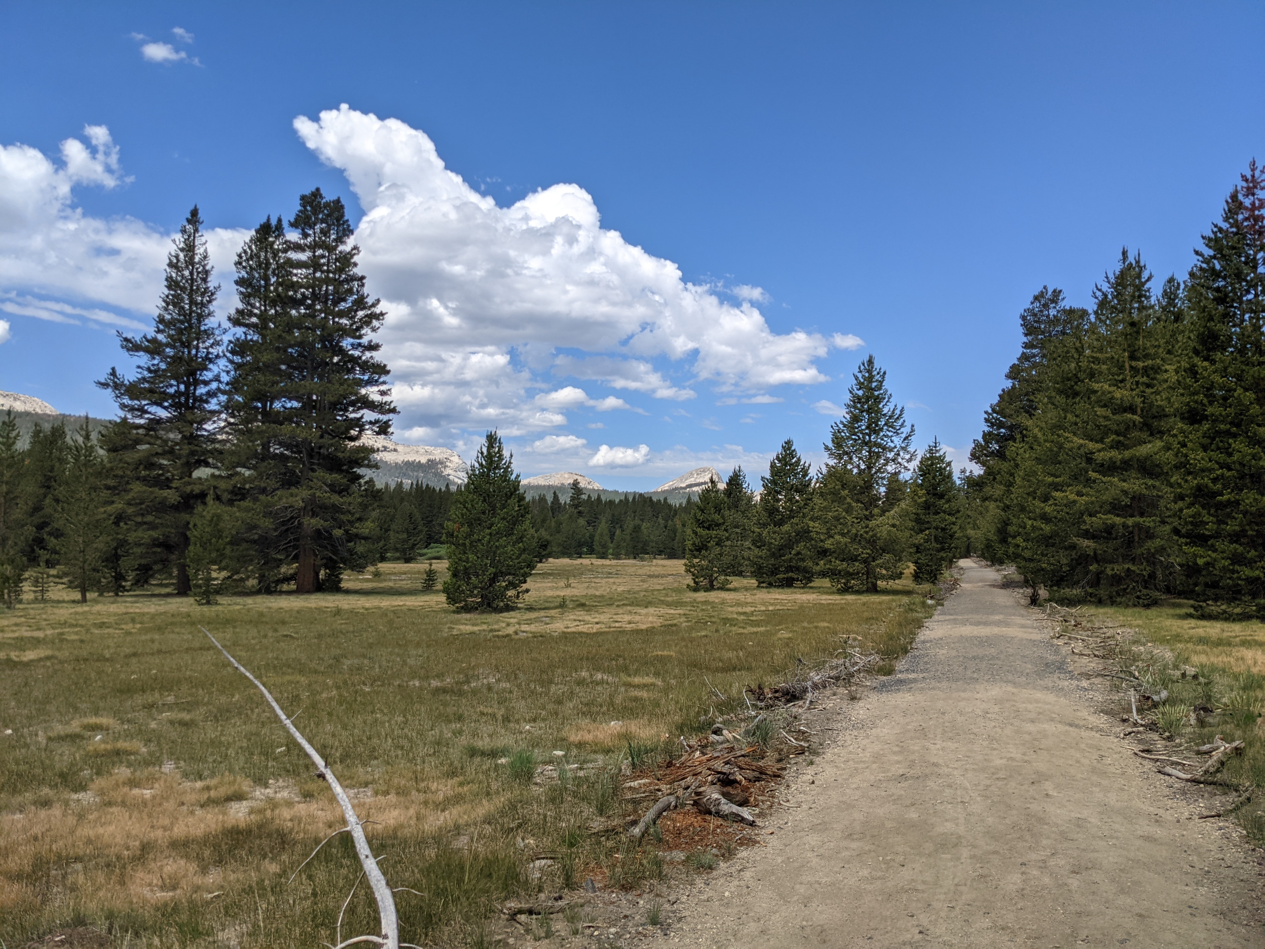 We broke camp with some still wet clothes, but not so wet to need immediate attention. It was a casual 7 miles to Tuolumne Meadows. So many tourists at the bridge about a mile from the trailhead. Can’t forget we’re in Yosemite during prime tourism season. Just weird to have massive areas of the park basically to ourselves and then become surrounded by lots of people that smell nicely. The general store was filled with hikers, but some day trippers as well. Trashman, Treetrunk, and Buckees (named after the shirt he wears that is from the well-advertised pit stop in Texas). were already there hanging out. Trashman was coming back from his solo trip down to the valley, which Shade and Studio 54 had skipped. He was about a day behind them now, but intended to do some catch-up as soon as he could actually leave the comforts of the store. The grill opened just as we arrived, perfect timing. We ordered food, chowed down, then decided to get ice cream too. Followed that with snacks and beers from the store. Some hikers started back out while the building clouds moved in. I hope they made it somewhere nice to ride out the storm. As soon as rain started hitting the pavement, everyone scattered to either their cars, tents, or huddled under the awning of the store. We huddled and waited for the storm to pass. It was taking awhile, so I grabbed more beers and snacks from inside, an excellent choice. Eventually, we decided the rain wasn’t going anywhere and we should start walking. We had to make it at least 4 miles away from Tuolumne before we could “legally” camp. We were better prepared for the rain this time; we were going to wear not only rain jackets, but also rain pants and rain mitts. We hiked for about two hours like that before stopping. The first tent site was a thin layer of dirt on a rock, so we couldn’t get a stake in. Learning this took time, which soaked the outer part of the tent and tyvek groundsheet. We continued on a little further scoping out spots along the way. Found one, started setting up, and the rain stopped. Of course. Got in the tent, started unpacking, and learned just how (not) water resistant the material is that our bags are made. Everything was soaked. Hiking clothes, sleep clothes, quilt, pad, extra socks, etc. We have pack liners, but didn’t think we needed them. Rookie mistake. Should have taken the time after the first two storms to get them out, but we didn’t. Now we were going to have to hope for some sun in the morning to dry everything out. Sleeping in wet clothes is crappy.