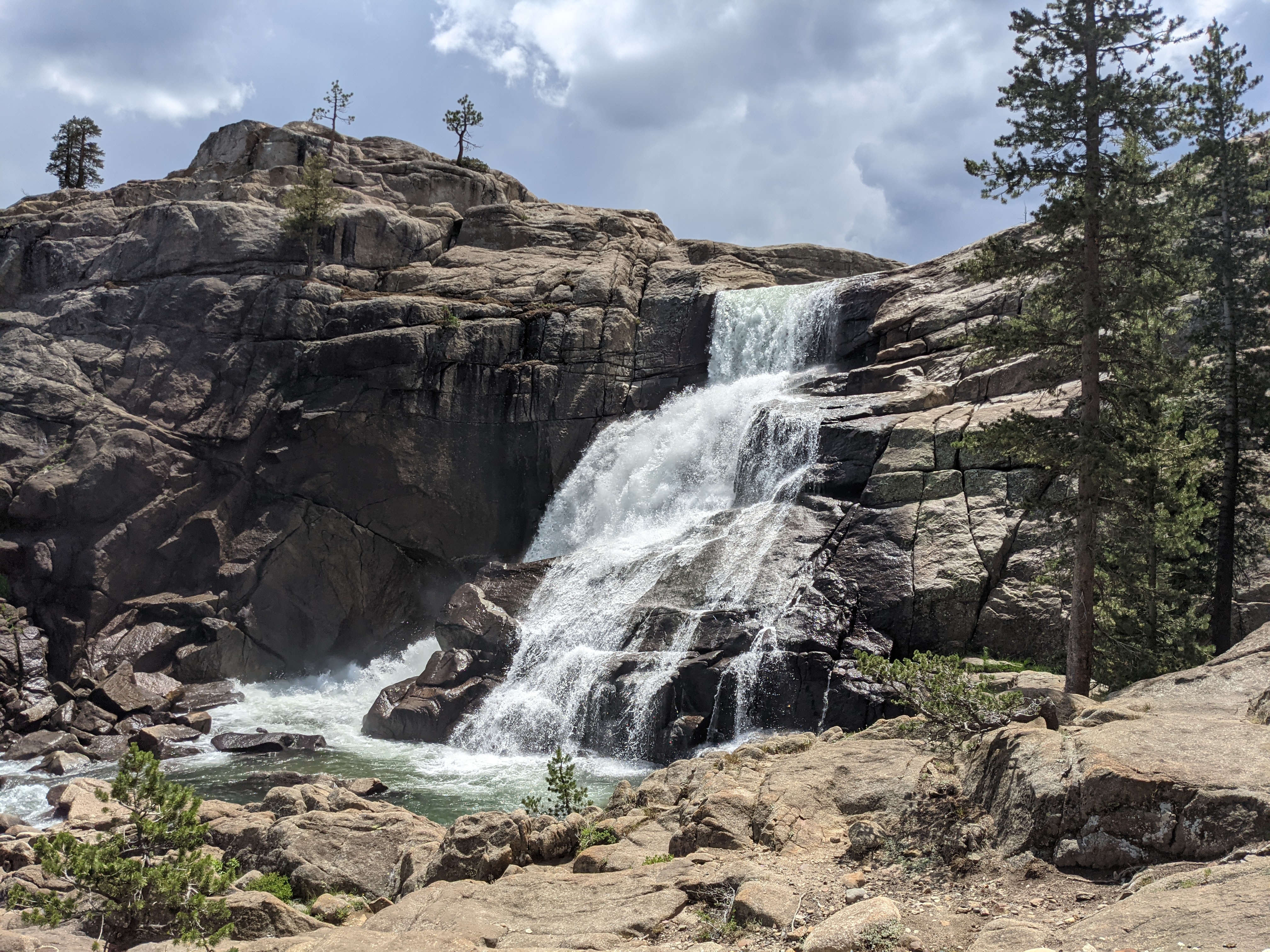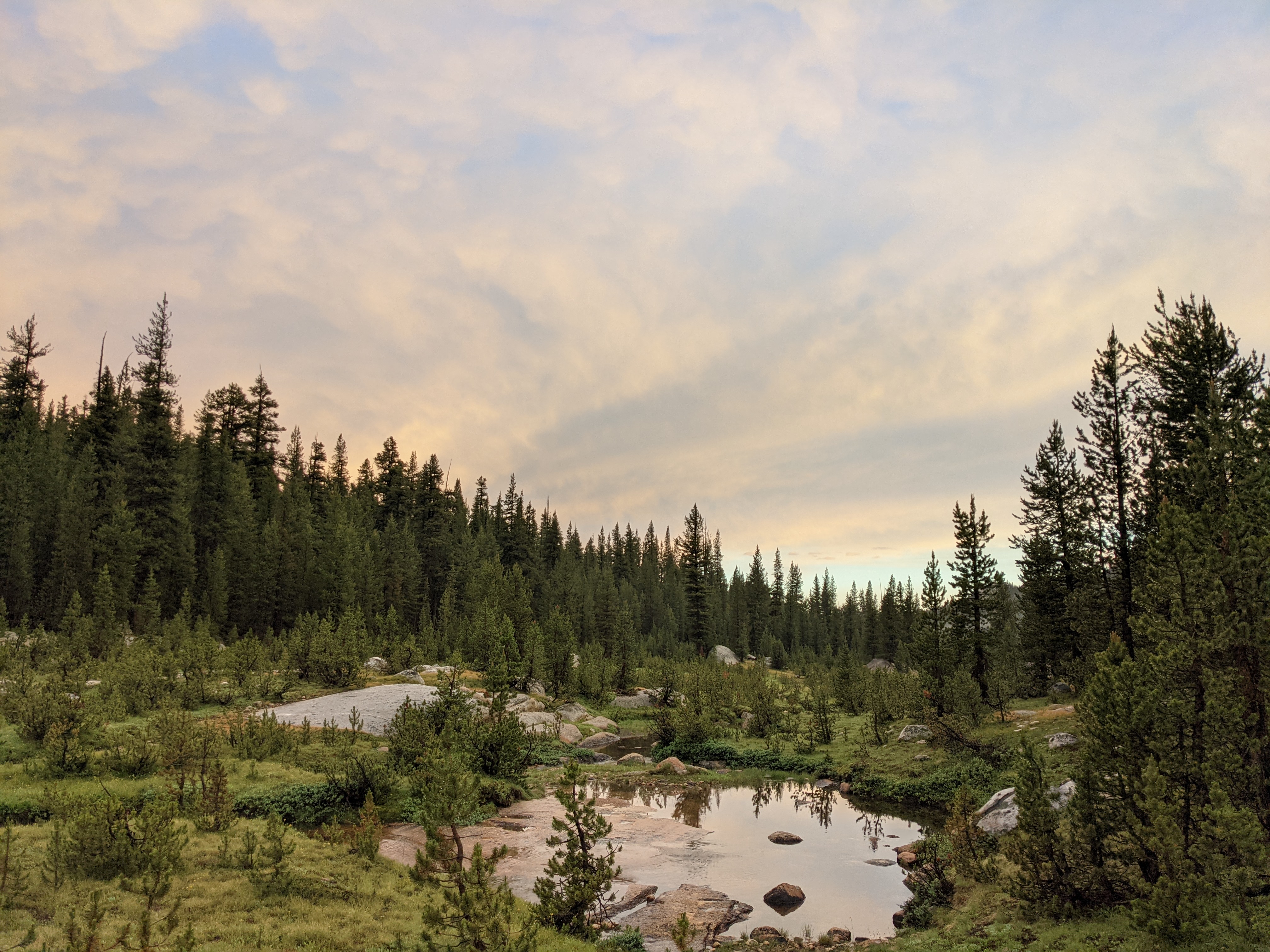 Needing to dry our stuff before we could keep going, we hung everything out on some rocks and let the sun work its magic. It took a few hours so we didn’t get hiking until around noon. We got about 5 miles before it started raining again. We strolled through a meadow that had a giant boulder with an overhang. A couple of hikers were underneath it yelling into it so that the echo would go across the valley. It was kinda neat to hear. The rain picked up as we reached the end of the meadow so we pitched the tent as soon as we found a spot we could use. No need to repeat yesterday’s mistake. We thought the storm would pass, but it didn’t. So, we just made that camp for the night. We had just gotten everything dry that morning and wanted to keep it that way. It was also the second night in a row of using a site that would be trouble if a park ranger found us. Not hitting our mileage for the day meant stretching our food one more day so that we could make up the difference. We decided to make a judgment in the morning to see if the sky looked bad. If it did, we would turn back. Otherwise, we would need to keep pushing forward despite any more storms.