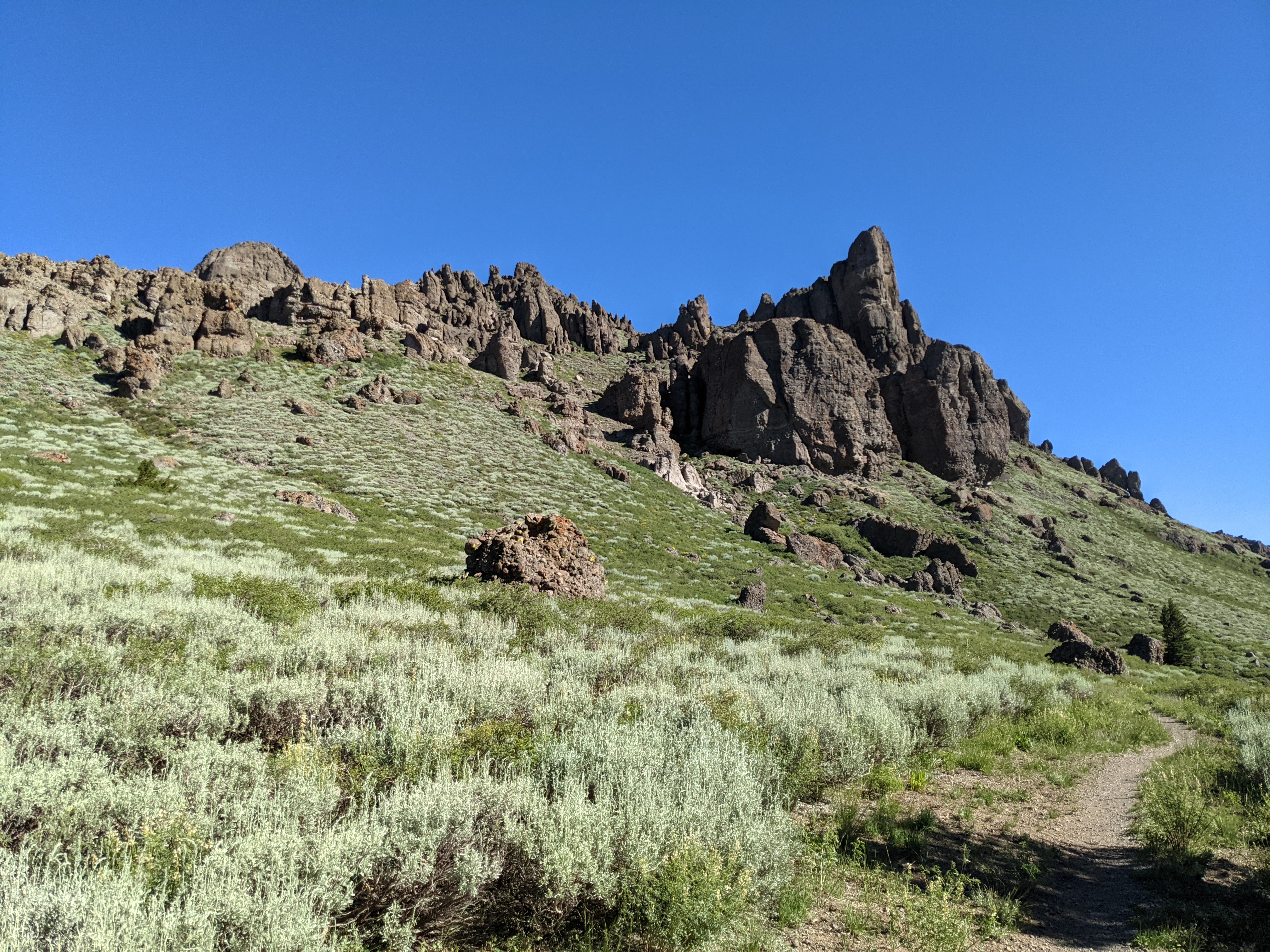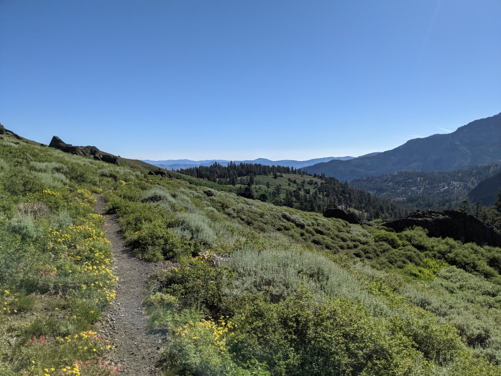 An animal must have smelled the rag I used to clean up my spilled dinner and came near the tent last night. I woke up to the sound of something rustling the bushes nearby. By the time I got my headlamp on and got out of the tent, it was gone. I didn’t see what it was, but I suspect a bear. I’ll have to clean the rag with some Bronner’s to get the food smell out of it; my rinse in the river was definitely not good enough. We’re also looking forward to replacement food bags because ours have lost their seals and are not odor-proof anymore. We have new ones in our bounce box, but that’s in Tahoe, so we have to wait a couple more nights. Pulled out of camp at about 8. Leapfrogged with a guy using real sticks for walking sticks. Also passed by a guy that works with the PCTA. He was with two forest service guys, and they were out clearing down trees on the trail. Many thanks to them. Right before we were going to stop for lunch, Marie spotted smoke two canyons over. We were on a ridge and getting near South Lake Tahoe, so we actually had cell reception. I called one of the ranger district phones and let them know what we saw. Hopefully, they can put it out quickly; it’s fairly windy today. Overall, the hiking was casual, no major climbs or descents, but plenty of elevation change to keep it interesting. We got a campsite that’s next to some tall boulders so we have a decent amount of wind protection.