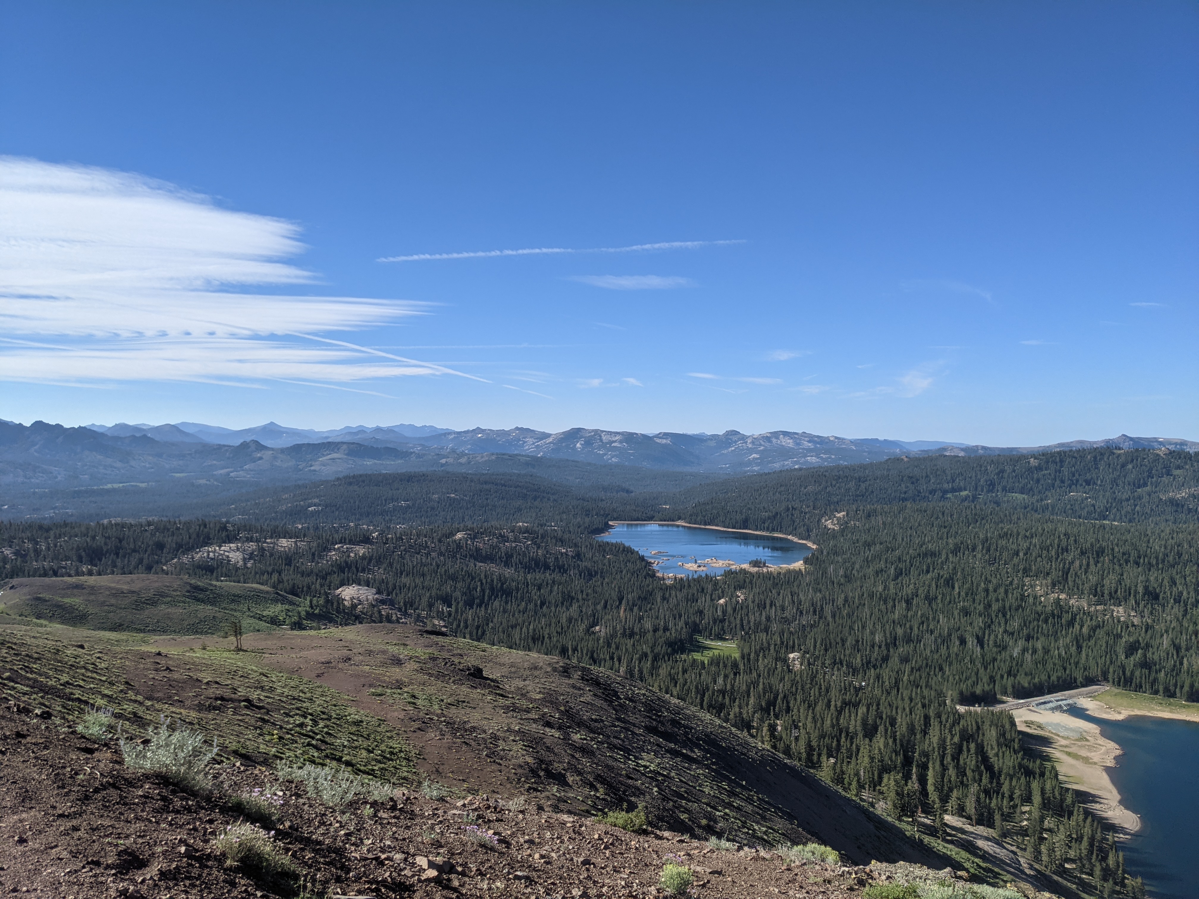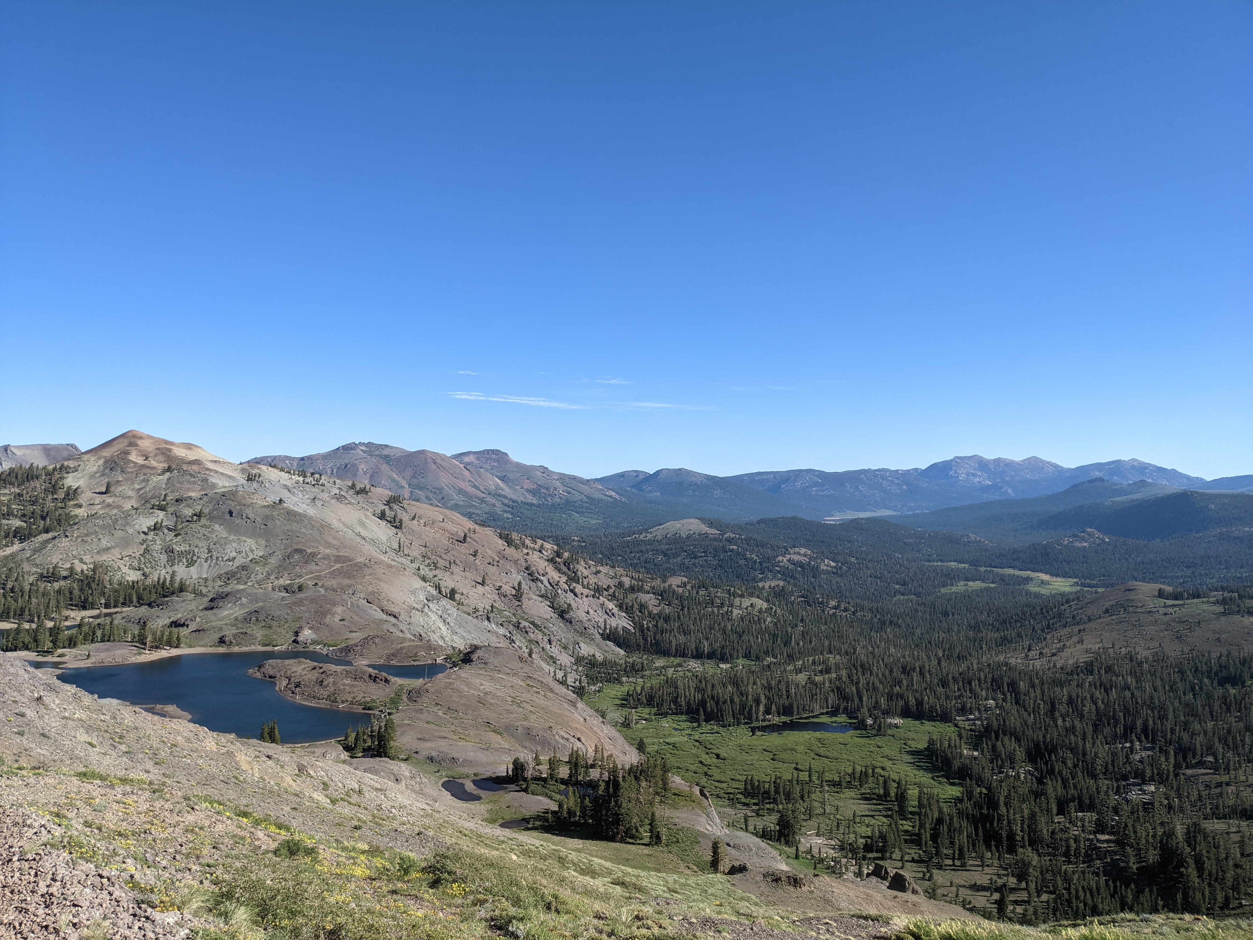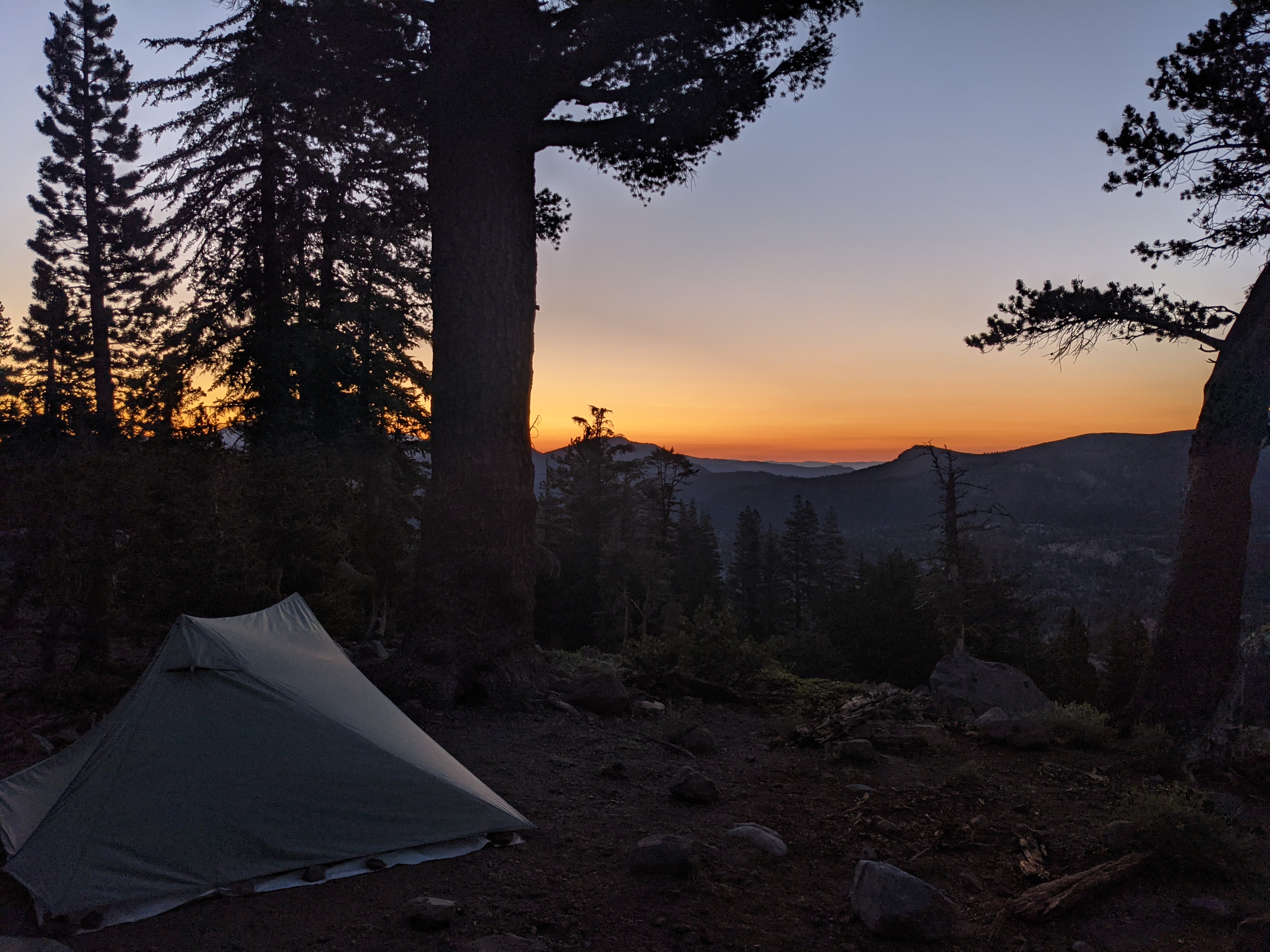 Sleep treated me well last night. The first few miles were smooth and uphill. On the descent, we ran into Slingblade. He’s hiking sobo from Crater Lake to Mammoth, where he lives. During our morning break, we had cell service and I got a text from Shade. They’re going to be in Tahoe until Saturday, which works out well since we’ll be in town tomorrow (Friday). We haven’t seen them since Mammoth, always a day behind, so it will be nice to finally (briefly) catch them. At lunch we stopped at Frog Lake. We took a dip and rinsed out some clothes in hopes we wouldn’t smell quite as bad for hitching a ride into Tahoe tomorrow. Ate lunch while our clothes dried. Earlier, Slingblade had told us to be sure to stop at the Echo Lake Trailhead and visit the information booth. He said they were giving out snacks and sodas to PCT hikers. We both got excited about the prospect of soda on this hot day. We walked the half-mile or so to the trailhead and found out that we were too late for sodas, booooo. They did have fresh fruit though! Woo! Thank you, volunteers at the trailhead! With another 2 miles to the next water source, we moved quickly to it. We should not have banked on those sodas. I don’t know why I’m using ‘soda’ instead of ‘pop’ like I typically do. On our way through a meadow, we started leapfrogging a group of TRTers. We would continue doing that until we reached camp. They had a dog with them who was clearly into the hiking. Reminded me of the infectious enthusiasm of my friend Matt’s dog, Otto. He’s always amped up when we go hiking. The campsite had a killer view. The Guthook comment that intrigued us to check it out said that it was a “baller ass campsite”. They were spot on.
