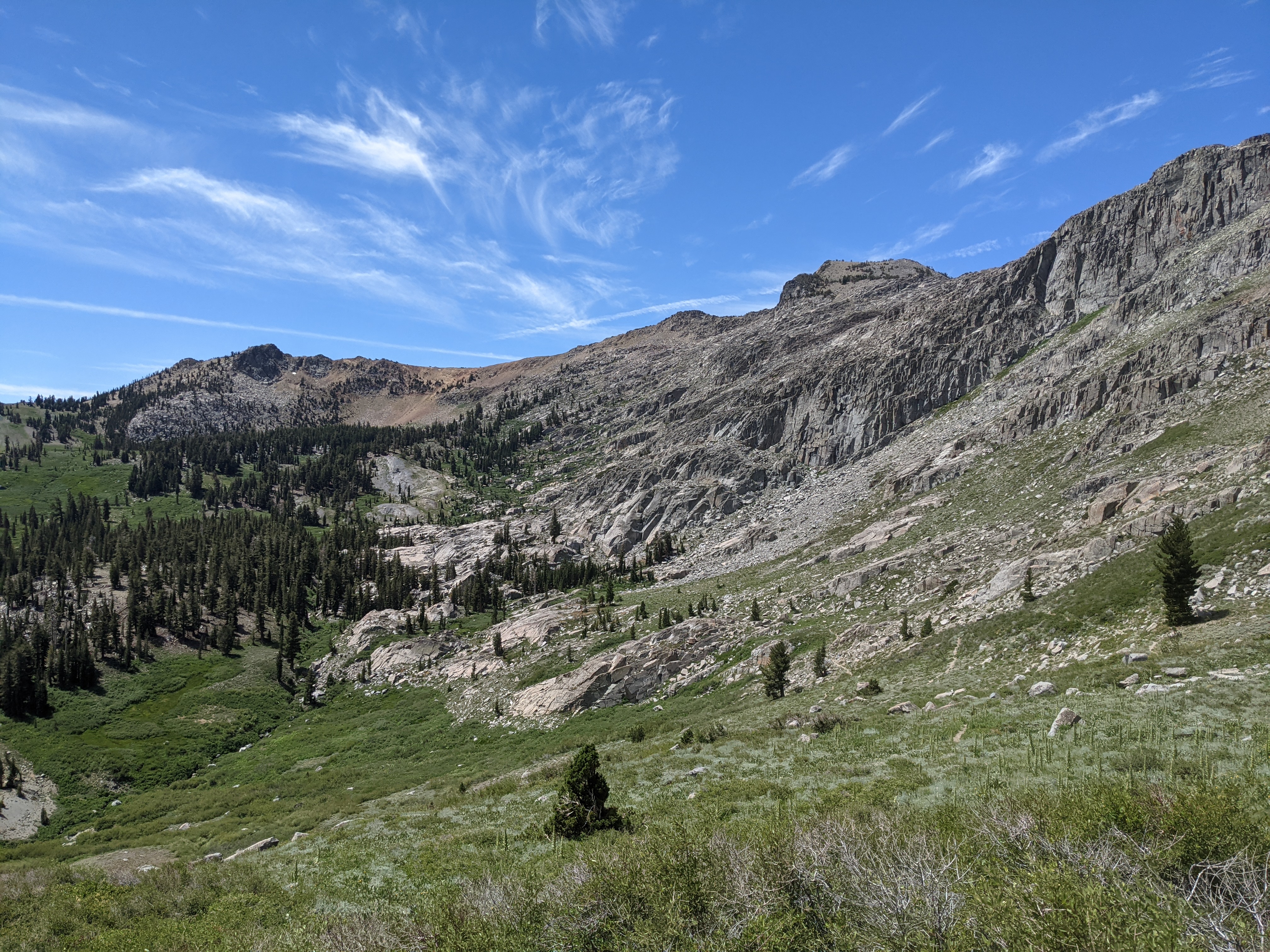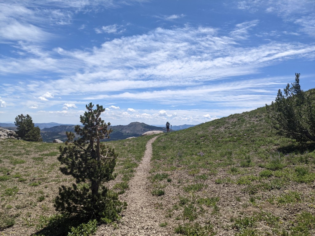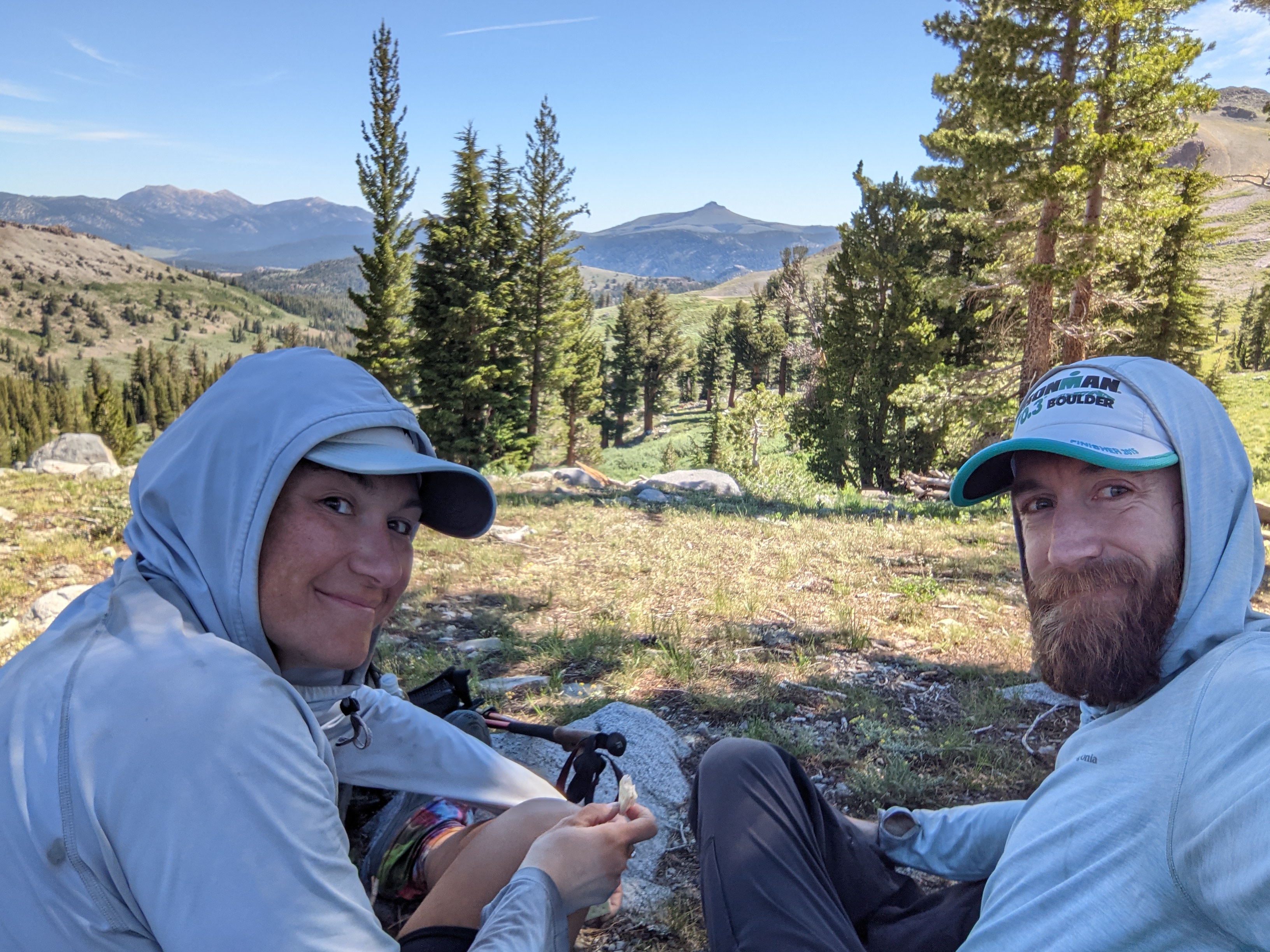Sleep treated me well last night. The first few miles were smooth and uphill. On the descent, we ran into Slingblade. He’s hiking sobo from Crater Lake to Mammoth, where he lives. During our morning break, we had cell service and I got a text from Shade. They’re going to be in Tahoe until Saturday, which works out well since we’ll be in town tomorrow (Friday). We haven’t seen them since Mammoth, always a day behind, so it will be nice to finally (briefly) catch them. At lunch we stopped at Frog Lake. We took a dip and rinsed out some clothes in hopes we wouldn’t smell quite as bad for hitching a ride into Tahoe tomorrow. Ate lunch while our clothes dried. Earlier, Slingblade had told us to be sure to stop at the Echo Lake Trailhead and visit the information booth. He said they were giving out snacks and sodas to PCT hikers. We both got excited about the prospect of soda on this hot day. We walked the half-mile or so to the trailhead and found out that we were too late for sodas, booooo. They did have fresh fruit though! Woo! Thank you, volunteers at the trailhead! With another 2 miles to the next water source, we moved quickly to it. We should not have banked on those sodas. I don’t know why I’m using ‘soda’ instead of ‘pop’ like I typically do. On our way through a meadow, we started leapfrogging a group of TRTers. We would continue doing that until we reached camp. They had a dog with them who was clearly into the hiking. Reminded me of the infectious enthusiasm of my friend Matt’s dog, Otto. He’s always amped up when we go hiking. The campsite had a killer view. The Guthook comment that intrigued us to check it out said that it was a “baller ass campsite”. They were spot on.