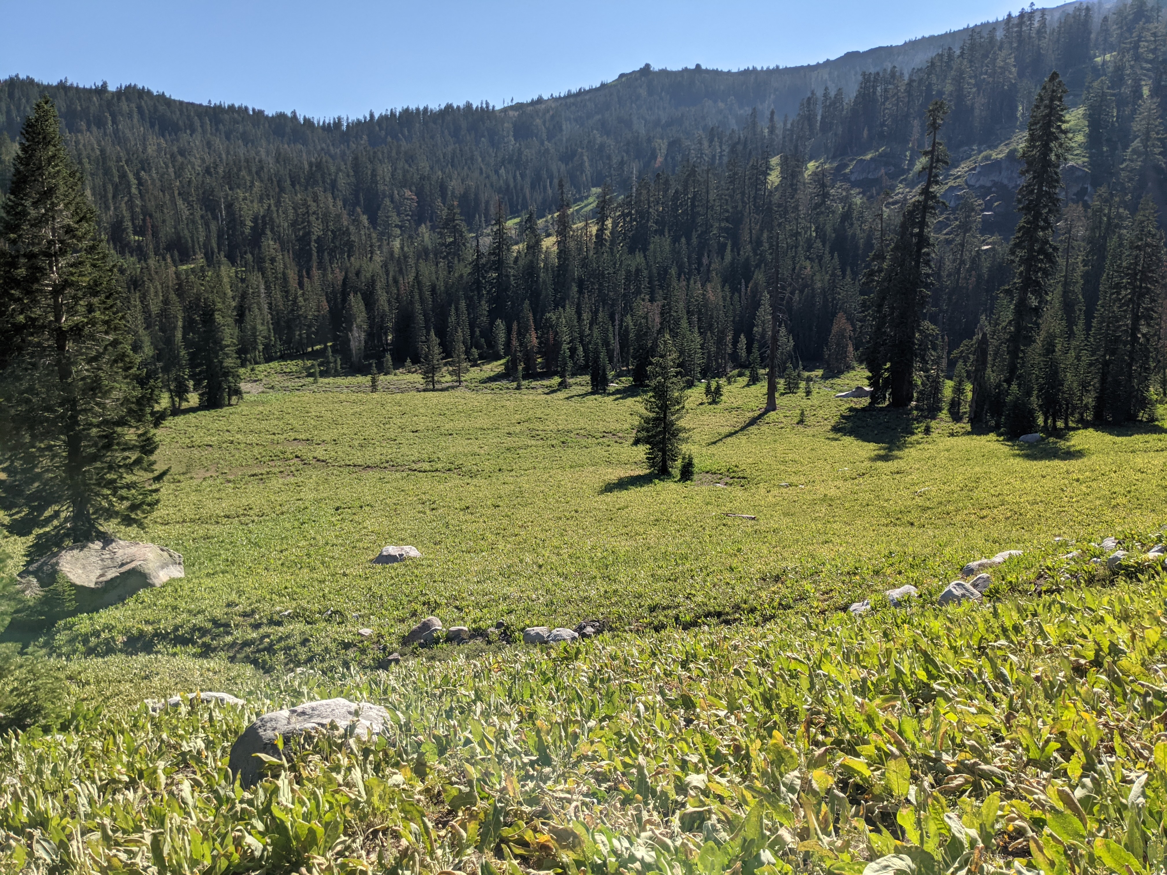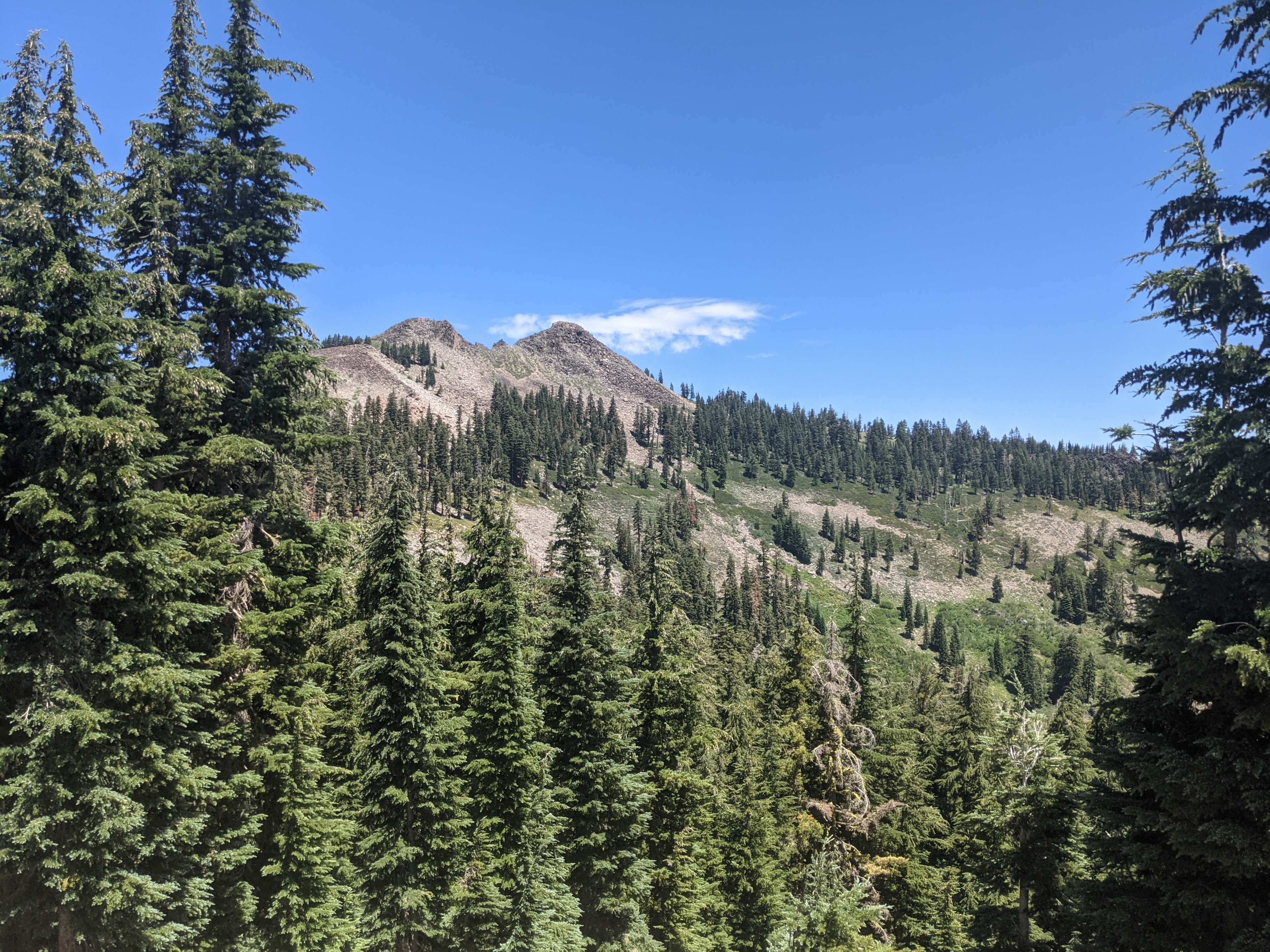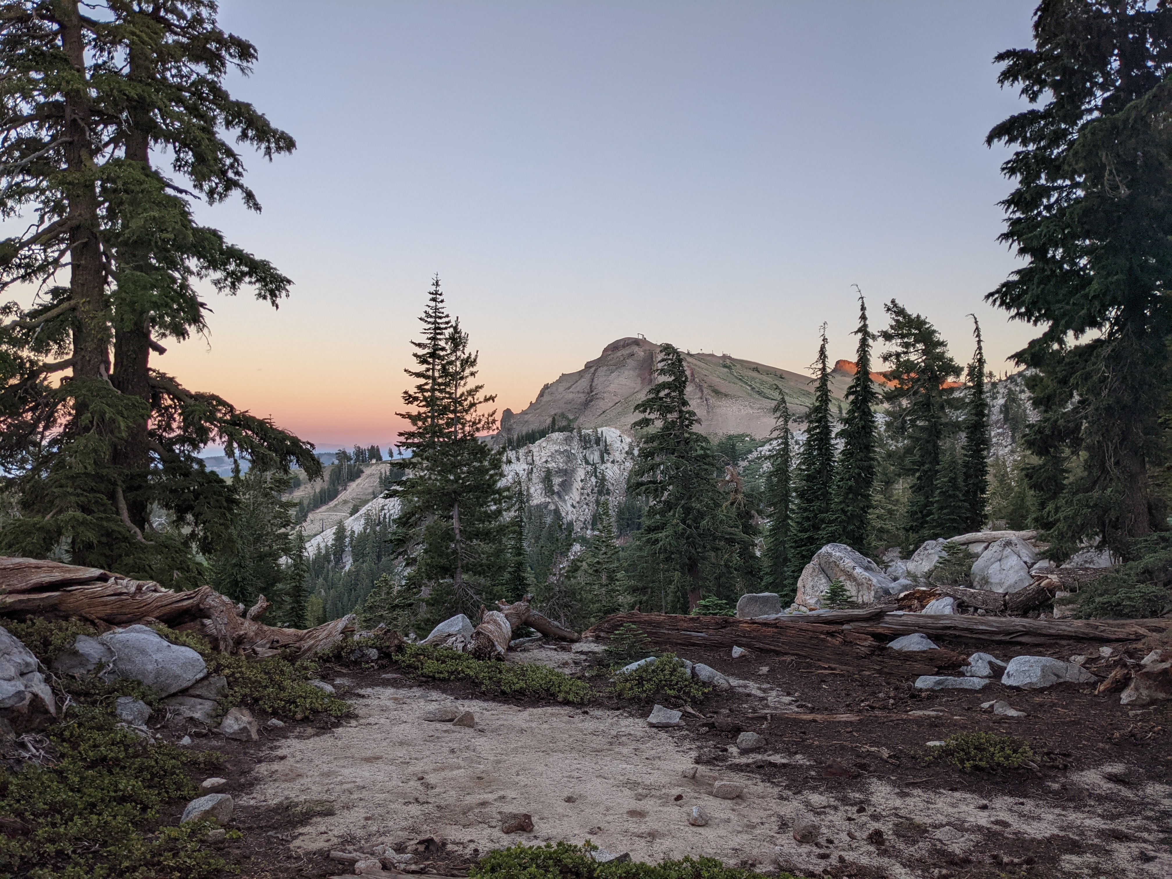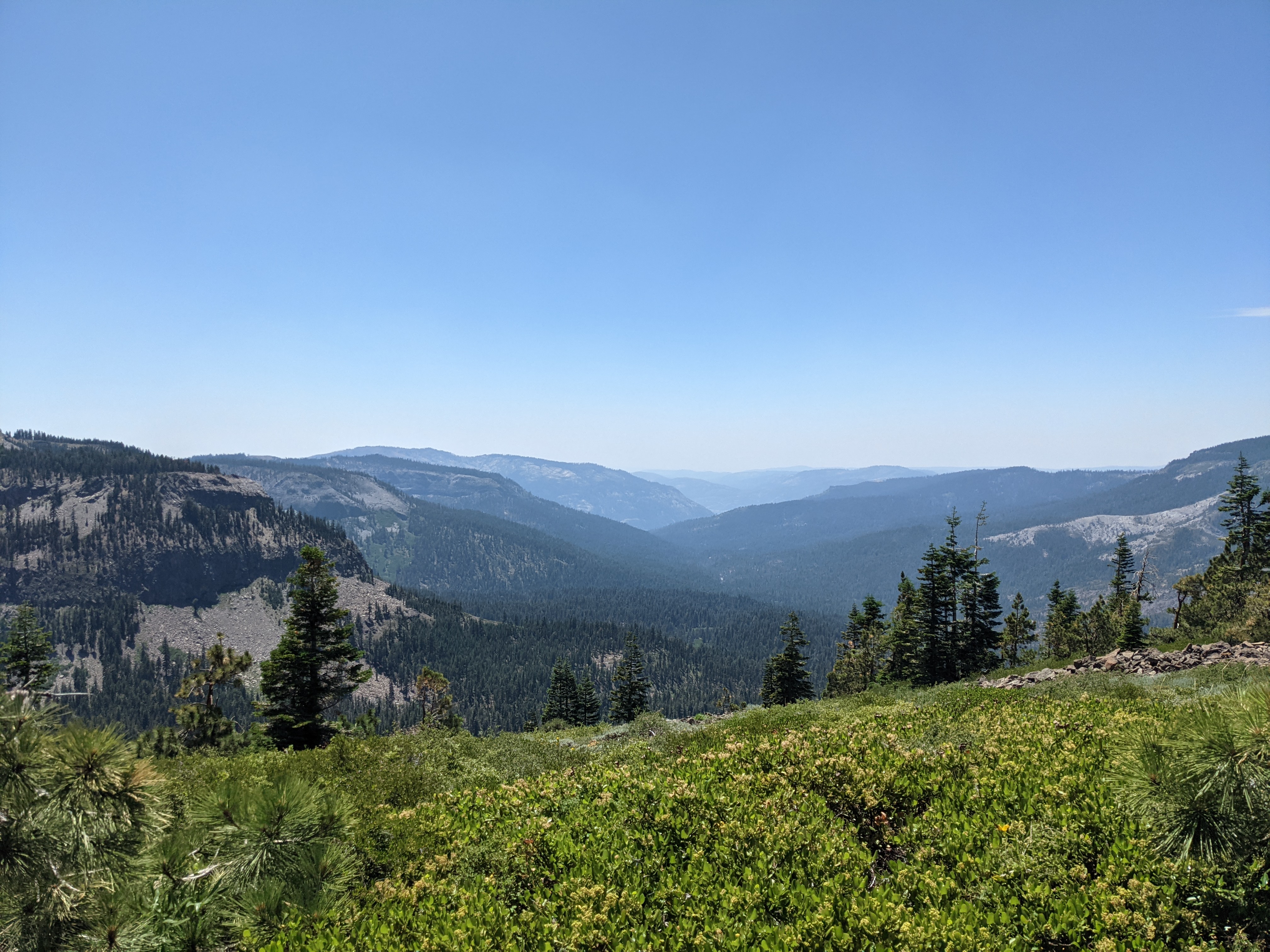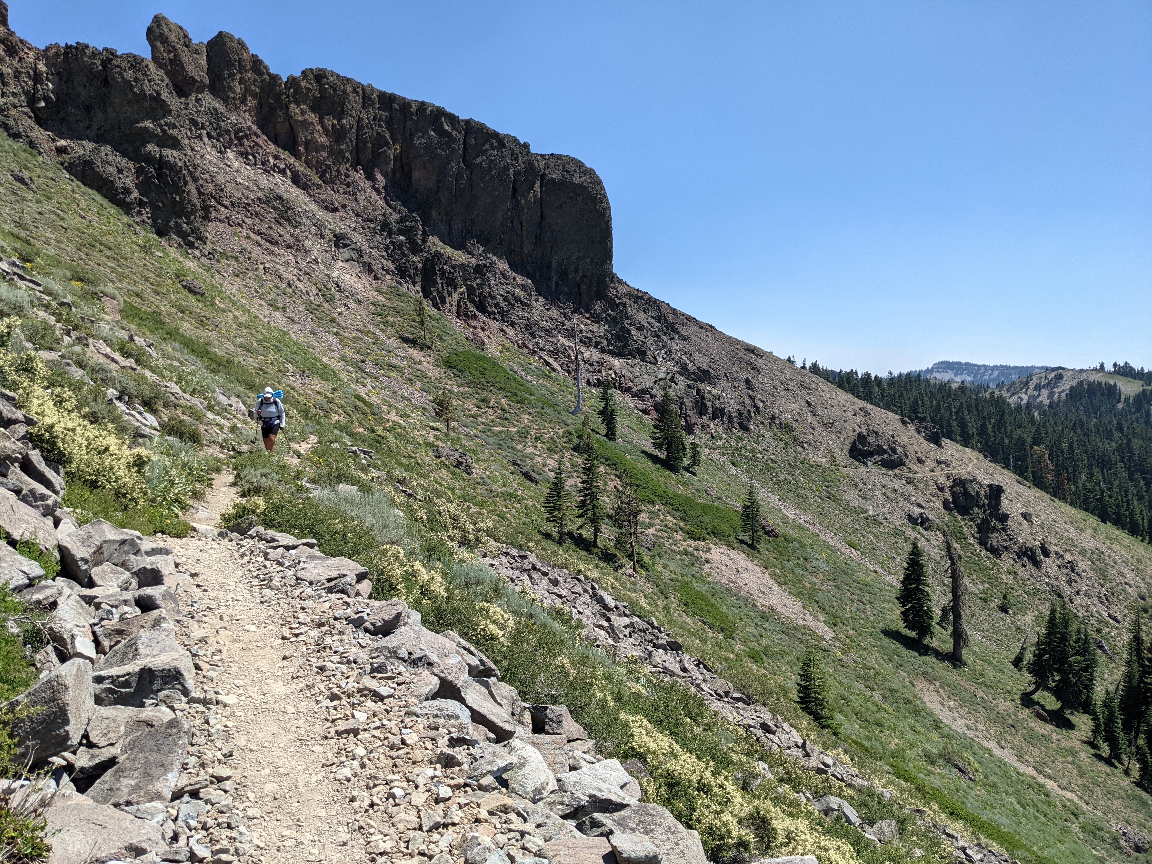 Three days in a row! We saw a small cub towards the end of the day. Never saw the mom though. It was hard to see it through all of the trees and boulders. Lots of trail magic this morning too. After the first 2 miles we arrived at a trailhead that had a surprising amount of cars for how remote it felt. One of the guys there, trail name: Bearicade, came up and asked if we were thru-hikers and then offered Cokes, which we took. About a mile or two later we passed some day-hikers who offered us their bag of grapes after we told them we were doing the PCT. Most of the hikers in this area are TRTers and these ladies were into what we were doing. So, we had fresh grapes at lunch. We leapfrogged Scooter today, who we’ve seen a few times the past couple days. She was unsure about the upcoming ridgewalk because of how bad the wind was blowing, but she was okay to go if she could go with us. There had been a long burst of wind, which likely hit her when she left the saddle. She was ahead of us at that point, and we were still crossing it. I had just assumed it was typical wind on a saddle since that happens regularly, but it must have been a long burst. Anyway, she turned back, chatted with us, and then we led the way. We all did just fine because the wind was much calmer as soon as we started walking. Figures.
