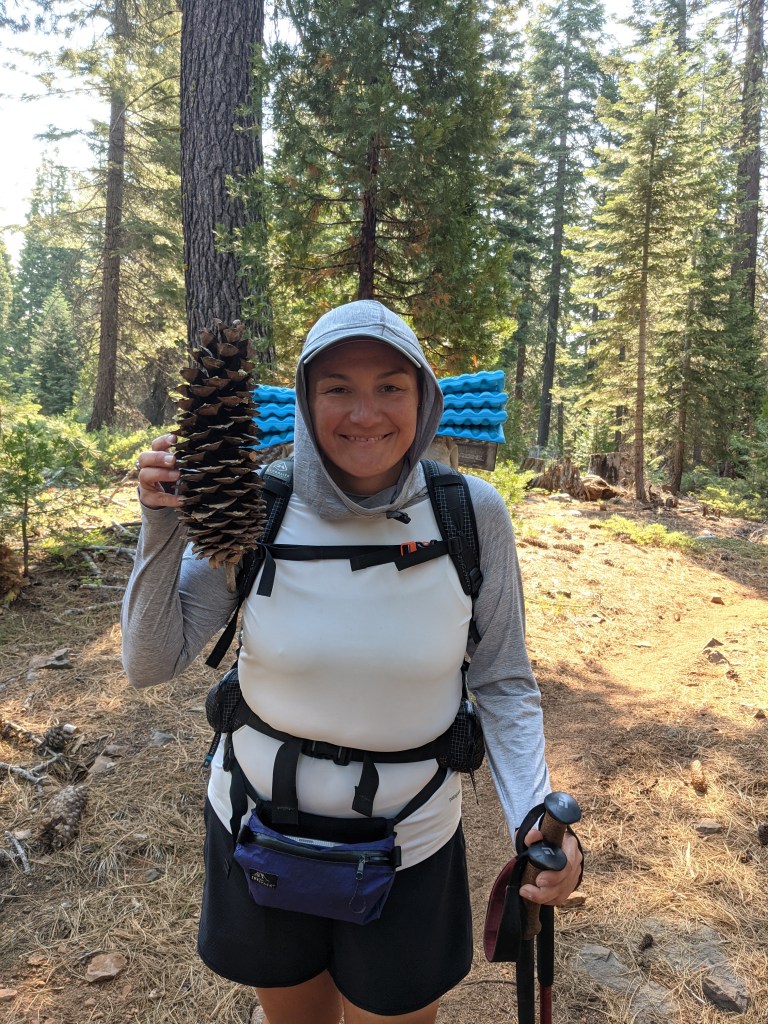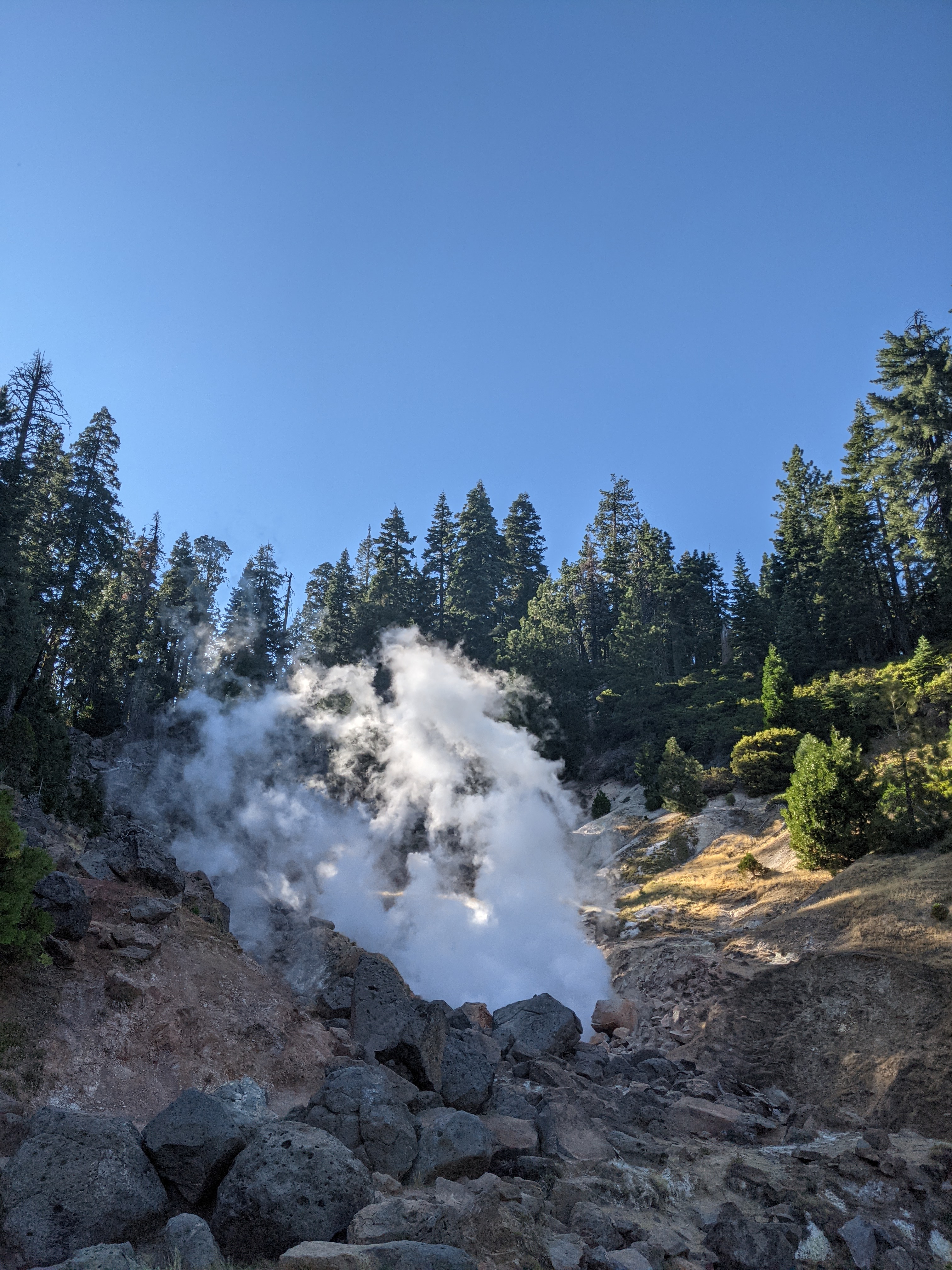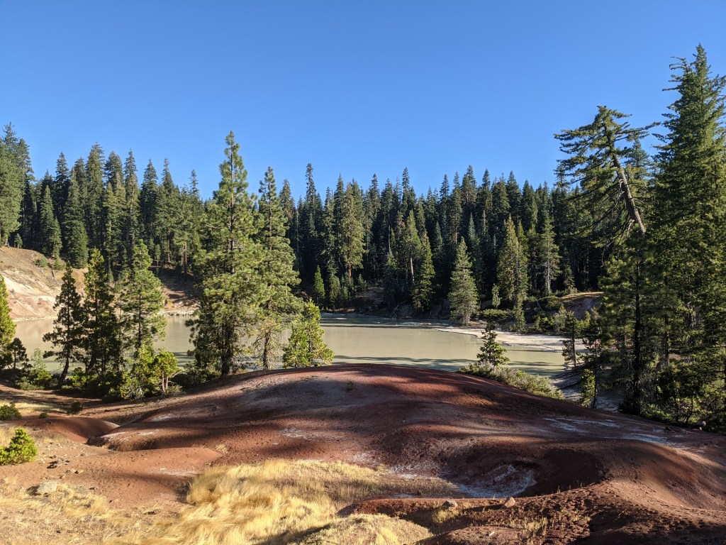 Our bus was scheduled to pick us up at 8:20, and we were at the stop by 8:10. It was right on time, and the driver already knew about the arrangement for dropping us at the trailhead. A smooth start. Once we got to the trailhead, we ate a snack because we hadn’t eaten breakfast and it was already 10am. The tricky part about today’s hiking is the bear can requirement that Lassen NP has in place. If we use backcountry campsites, we have to have a bear can. You can hike all the way through the park in one day. Or, you can use the bear boxes at a developed campground within the park. We chose the last option. We weren’t going to hike all the way through today because that would be a 34 mile day. If we hiked to the last campsite before the park boundary it would only be a 15 and we’d have a lot of time to kill at camp. And we’d still have to do the whole park tomorrow. Instead, we did 19 to the Warner Valley campground. As we were scouting an unoccupied spot, Sunny came up to us and offered to share their spot. Hikers helping hikers. A few hikers were already set up there: 700, Scenic Route, and another (I forget his name). We scraped out a flat spot near the road, but put large tree branches next to the tent for a barricade of sorts. Cooked dinner, chatted with Houdini and Stampede, stashed our food in the bear box, then went to bed.