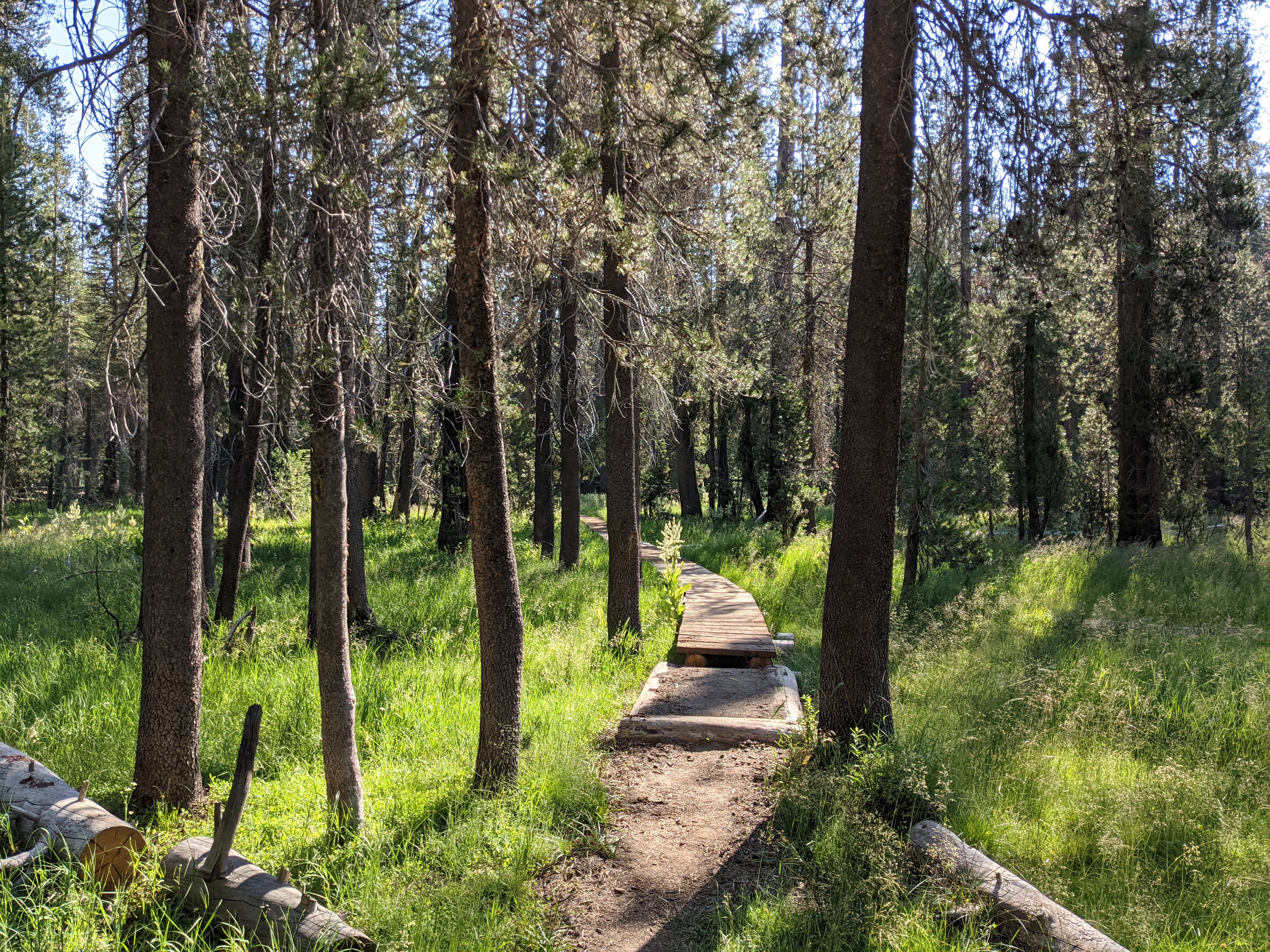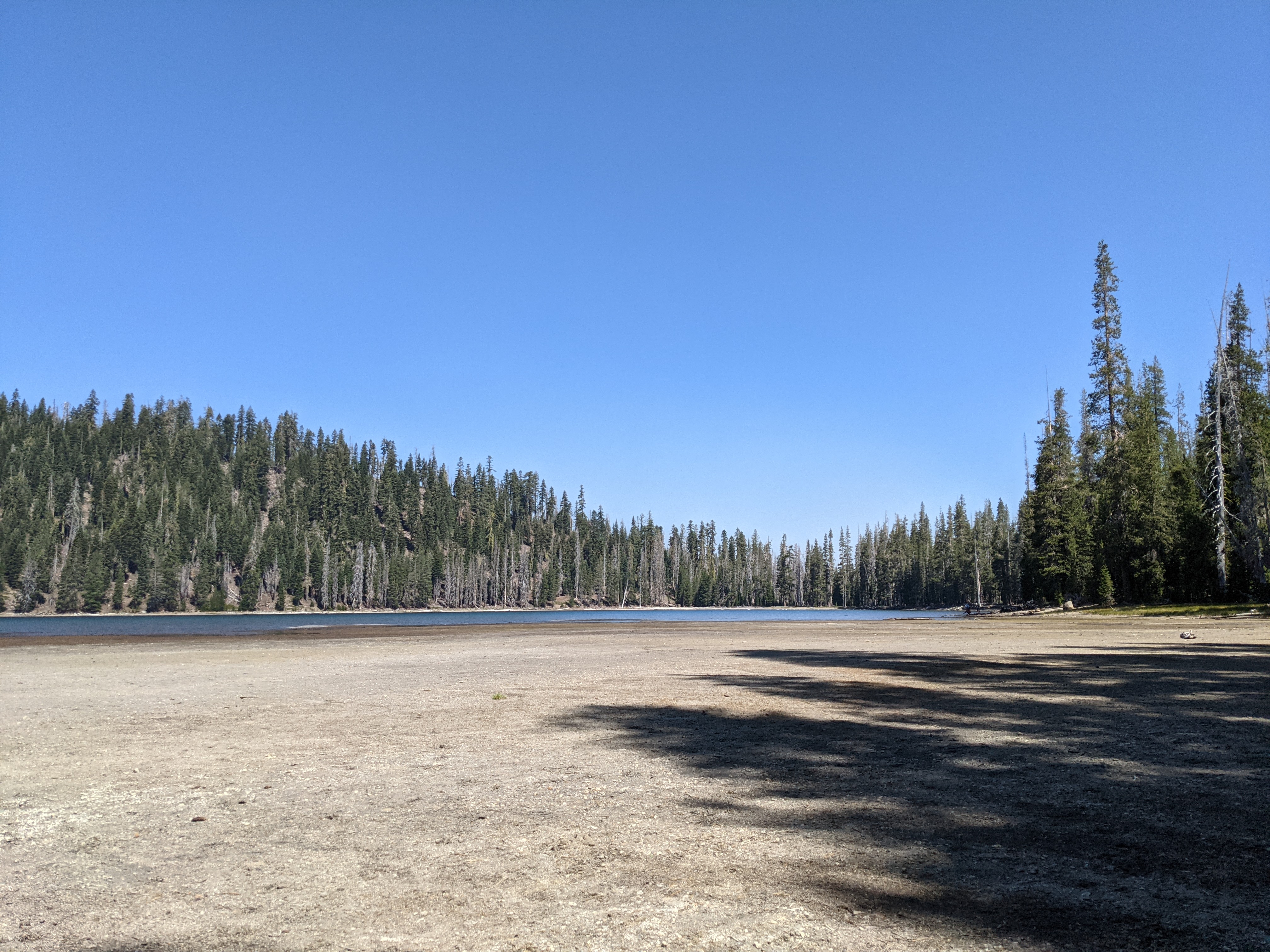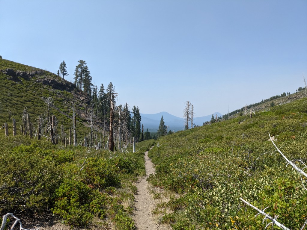 I could hear hikers walking past the tent in the morning, one by one. We eventually got up and packed. The first mile was the hardest of the entire day. We did a short climb out of the campground and then the rest of the day was practically flat. The miles came smoothly and we made good time. Lunch was early, around 10:45, but we had already gotten to the lake so we stopped anyway. Shoreline was huge, the drought obvious. We ate, collected water, then started rolling through the burn area before Hat Creek. The burn went on for miles, which made it hot and exposed. The silver lining was that the smoke from the Dixie Fire was hanging over the area so it blocked the sun a bit. Arrived at the river early, around 4:30, so we had plenty of time to soak our feet in the river. There was a fairly large group of hikers in this one spot, but everyone had plenty of space. 700, Scenic Route, Nugget, Beekeeper, Bluegrass, Spin, Hot Springs, and Sophie aka Magnet. We haven’t seen her since Hikertown, about a month and a half ago. Most of the group gathered while eating dinner and played a game of Villagers & Werewolves. I had never played before, but it was a fun game with no physical requirements like cards or dice: perfect for hiking. After we, the villagers, won, we all started either turning in for the night, or taking off for a night hike. Hiker midnight was going to come early.