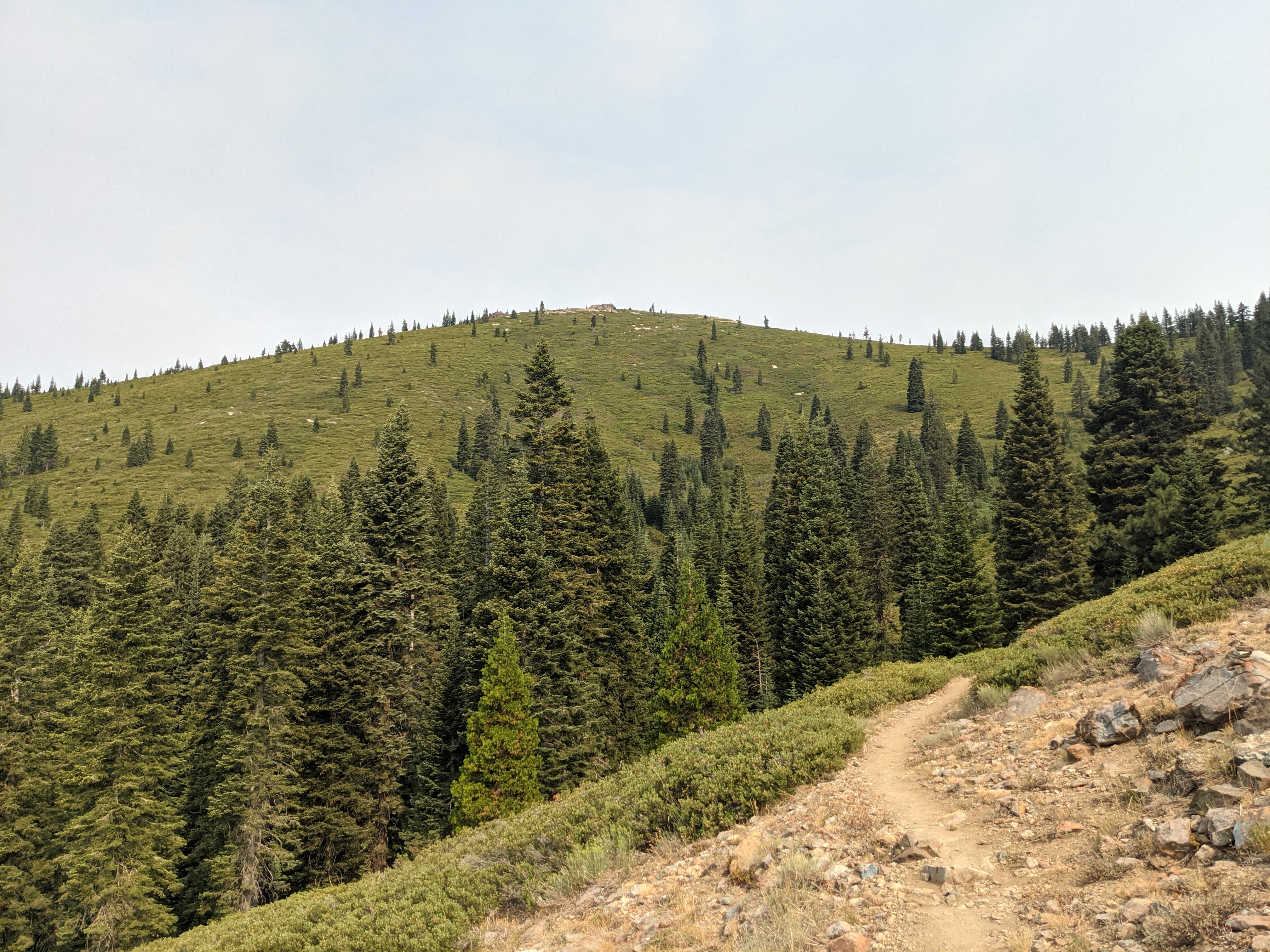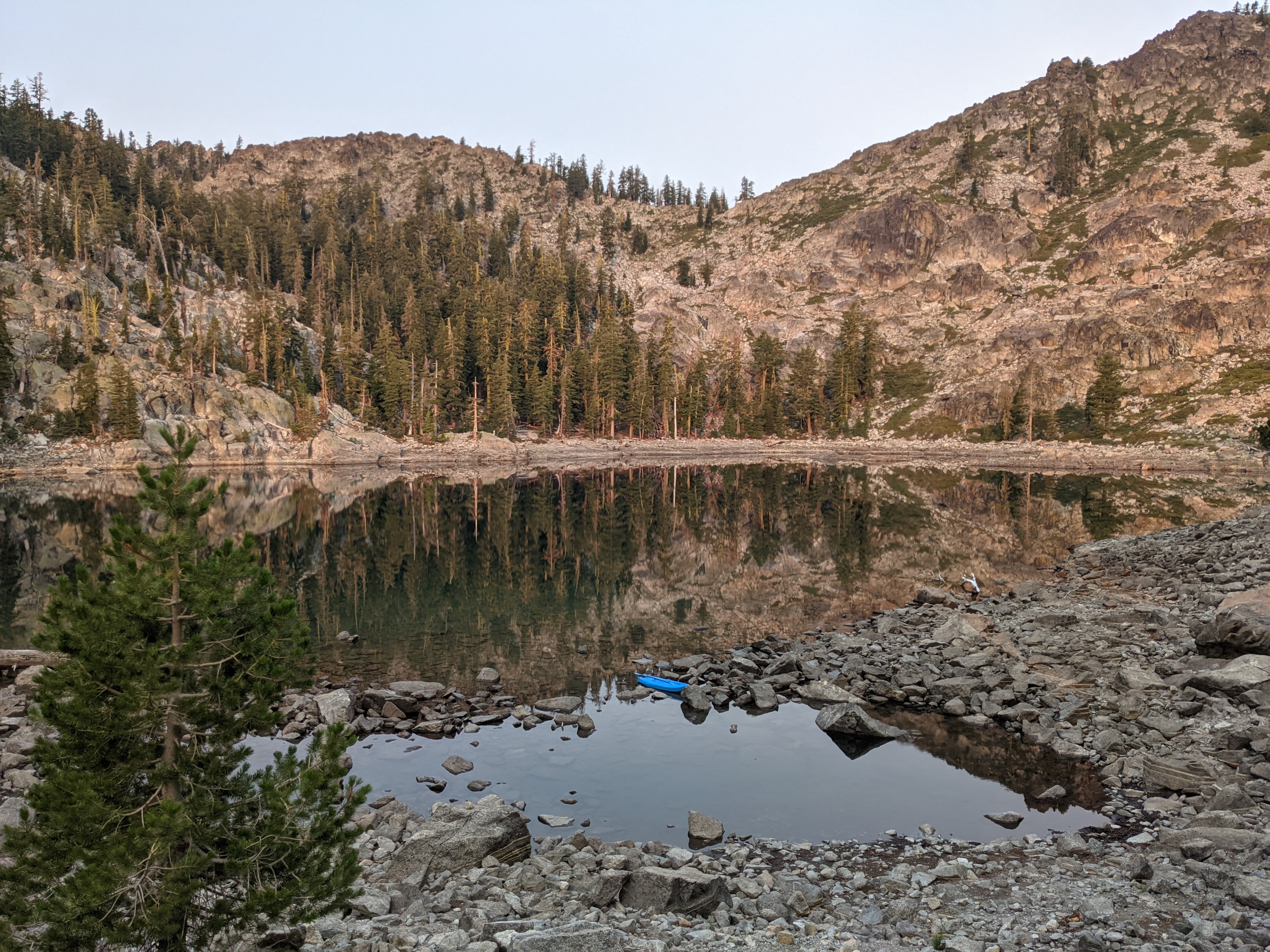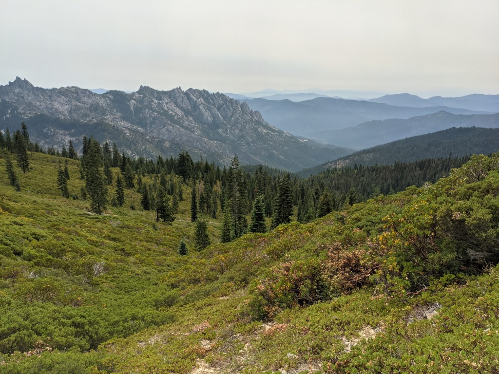 The first water source of the day had pitcher plants growing along the seepage around the stream. Syn The Bouge, Poppins, Stoked, Right On Time, Flash, and Nope were already there filling up when we got there. We leapfrogged with them most of the morning on the climb. Our lunch stop was on a ridge with smoke filling the valley below. Leapfrogged Flash and Nope, and Shorts and Pepperjack most of the afternoon. We camped above a lake that had a kayak that was free to use. We didn’t, but if we had gotten there early in the afternoon I would have taken it for a spin. Shorts and Pepperjack camped nearby, but had to arrange some swap of spaces with a couple ladies who were just passing through, but eating dinner near the shore. At dusk, some sort of flute music was playing. Either someone hiked in and played a couple songs for everyone in the area, or they played songs from their phone. Regardless, it was pleasant.