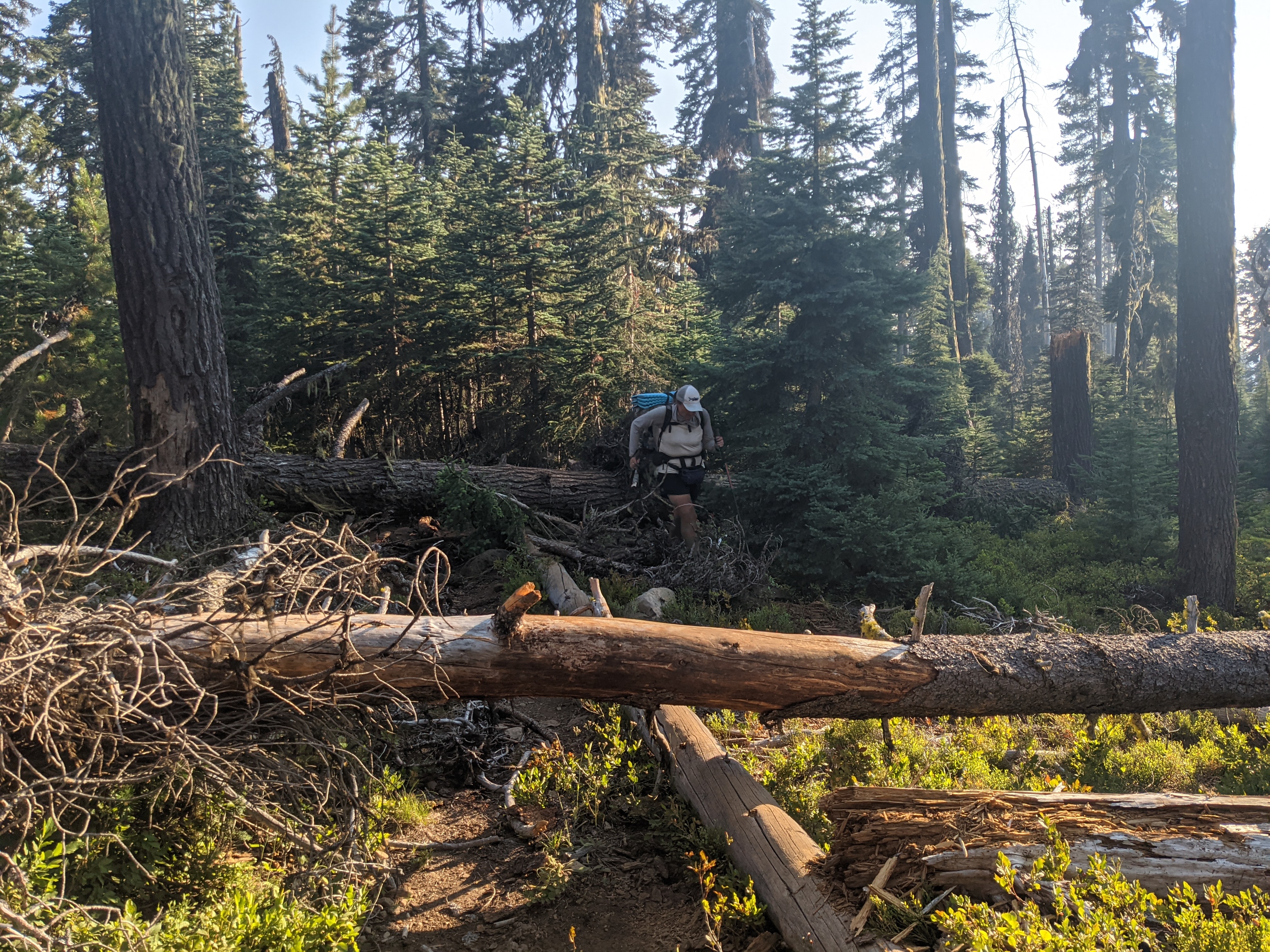 Yesterday’s big miles allowed us to take it easy today. We knew the resort didn’t serve breakfast until 9, so we had plenty of time in the morning to pack up. Since we now had two unplanned meals we dumped our food bags to see what that left us. We’d have plenty to get to Crater Lake and would likely have extra. Not a bad thing since it seems like our resupply at Mazama Village is going to be more convenience store than grocery store. Not a big deal, we can do 4 days of snacks. We could also find that it’s stocked well and it’ll be normal selections. We will find out when we get there. Bucket and Sage, who also camped in the designated PCT area, were already at the lodge when we got there. The breakfast burritos were good enough to get seconds. Did some more hobo laundry in the bathroom sinks. Hiked back up the side trail to the PCT then started on some actual trail miles. We got about 6 miles in, Scout and Bear told us there was cell reception. We did stop and catch up on some emails and check on this second Oregon fire closure. It extends the existing Lionshead closure another 20 miles, so not a huge amount of miles. Oregon will be over pretty quickly with such a big jump and we’ll miss the 2000 mile marker. If you’re keeping track, that’s right, we will have missed 3 major milestones in a row: halfway, CA/OR border, and 2000-mile marker. I am crossing my fingers for the OR/WA border at Bridge of the Gods. After our break we cruised to the water source where we caught up to Bucket, Sage, Scout, and Bear. Filled up and hiked on. We passed a southbounder named Max Heap who was on his way to his triple crown, which I thought was very impressive, especially for a guy his age. When we got to camp, Bucket and Sage were already there. We decided to skip cooking and just eat quick foods that we typically eat for lunch.