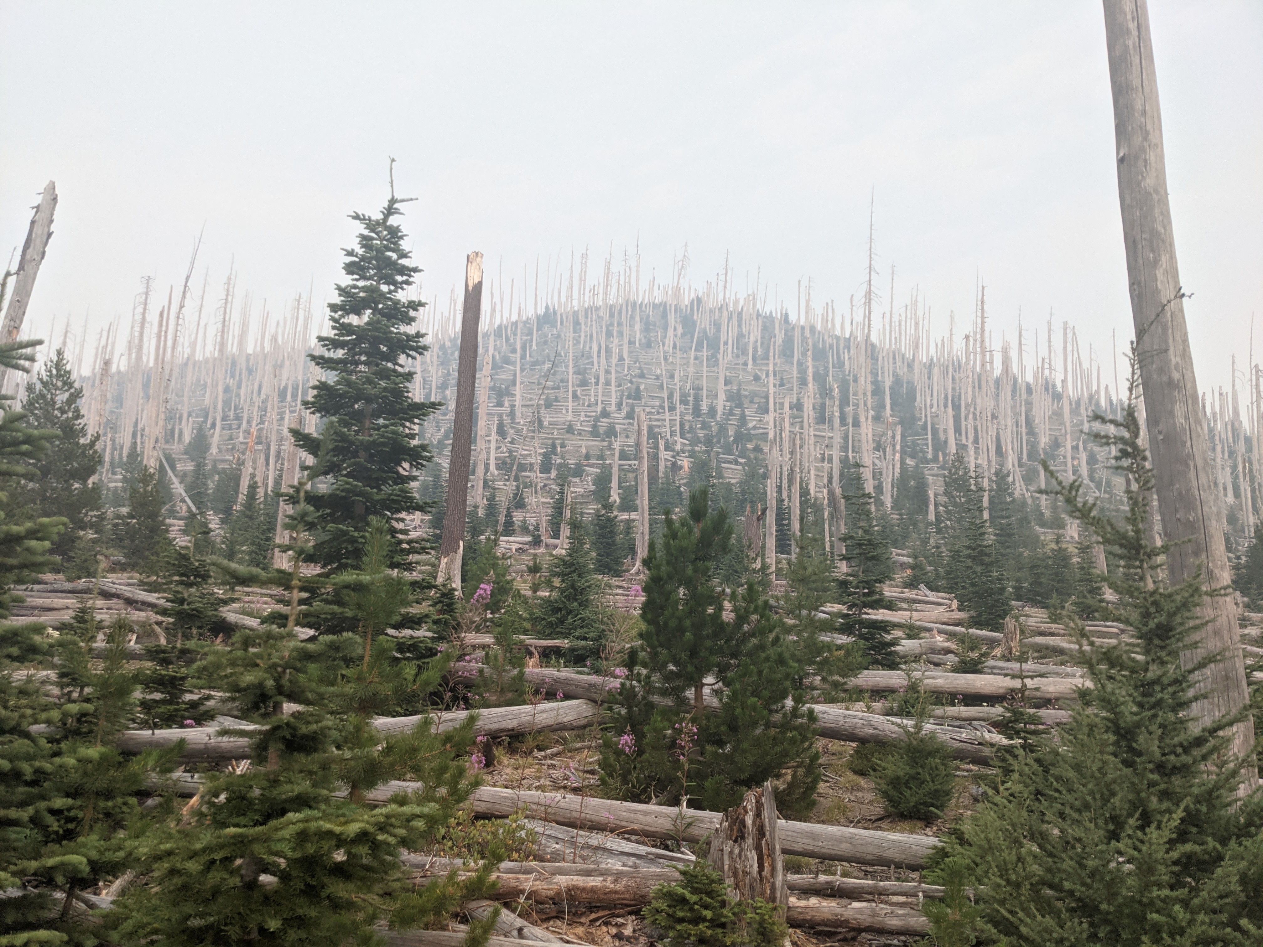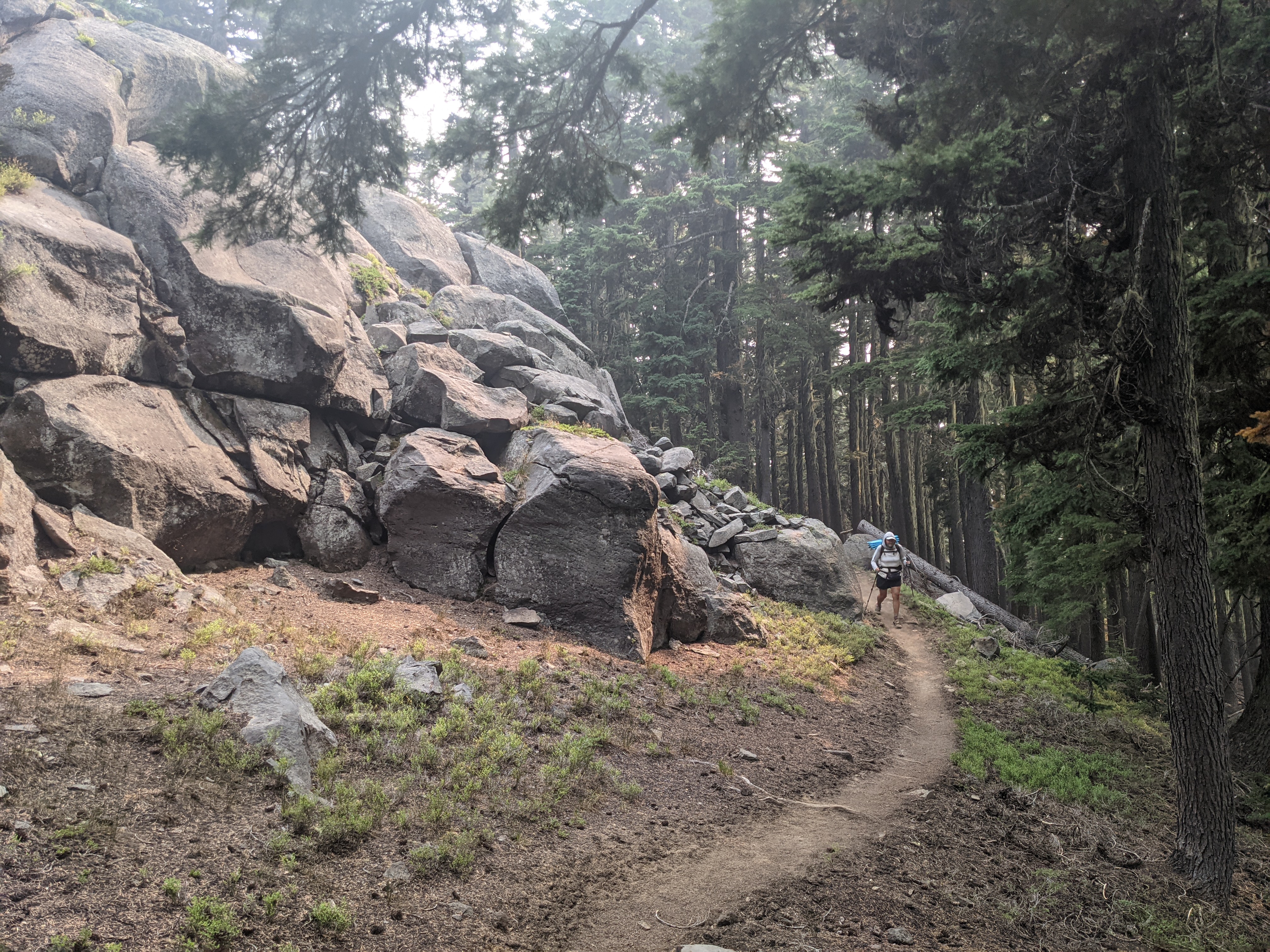 Up around 6:30 to be there for the restaurant at the resort to open at 7. Got breakfast burritos with Magnet and Flavortown. Sisyphus and Hermit also sat by us, and Hermit learned about OSU fans and O-H- ing. The trail out of Shelter Cove winds along near a paved road and a set of train tracks. There are 3 options for getting back to trail: (1) cross the tracks and take the side trail up to the PCT, (2) take the paved road and rejoin the PCT where it crosses the road a couple miles ahead, or (3) take the tracks all the way through the train tunnel and catch the PCT on the other side. Some people actually take the tunnel, and its 0.7 miles long with “safety alcoves” every few hundred feet. They’re active tracks and there are reports of hikers having to run to get out before the train caught them. We took the road because it was smooth grade, not dusty, and no trains to dodge. The hiking was typical Oregon, so gradual ups and downs. Cruiser miles. Hot and dusty and smokey. We ate lunch at Bobby Lake where we caught up to Sisyphus and Hermit (who O-H-ed us, to my chagrin). The next step was Charlton Lake to fill up for camp. We stopped for the night at a site that the PCTA wants people to use since it’s not right next to the trail. They’re LNT sites apparently, but it’s only a matter of time until they get used enough to be just as ugly as the ones next to the trail and less convenient to get to. Oh well, we’ll give them a go.