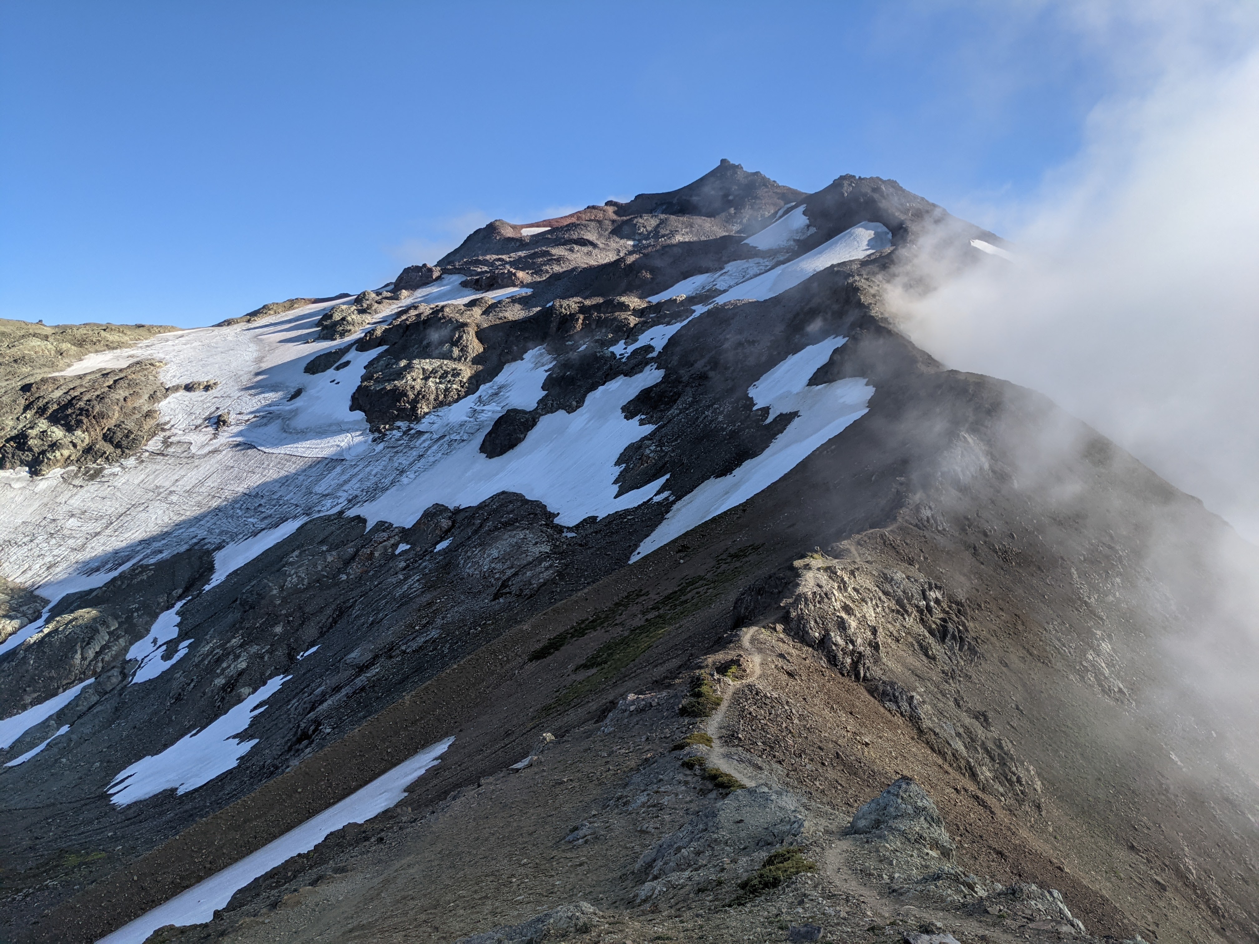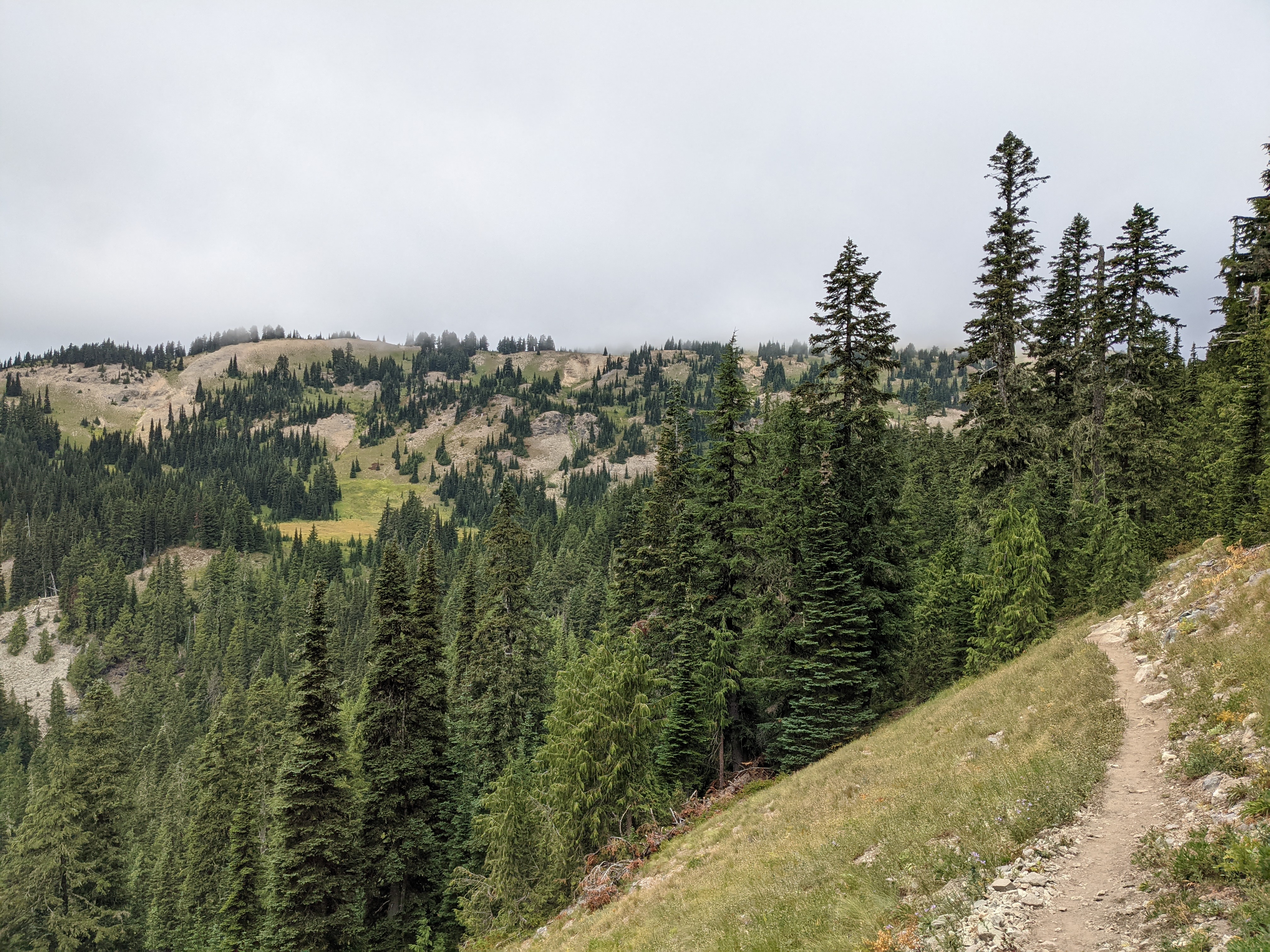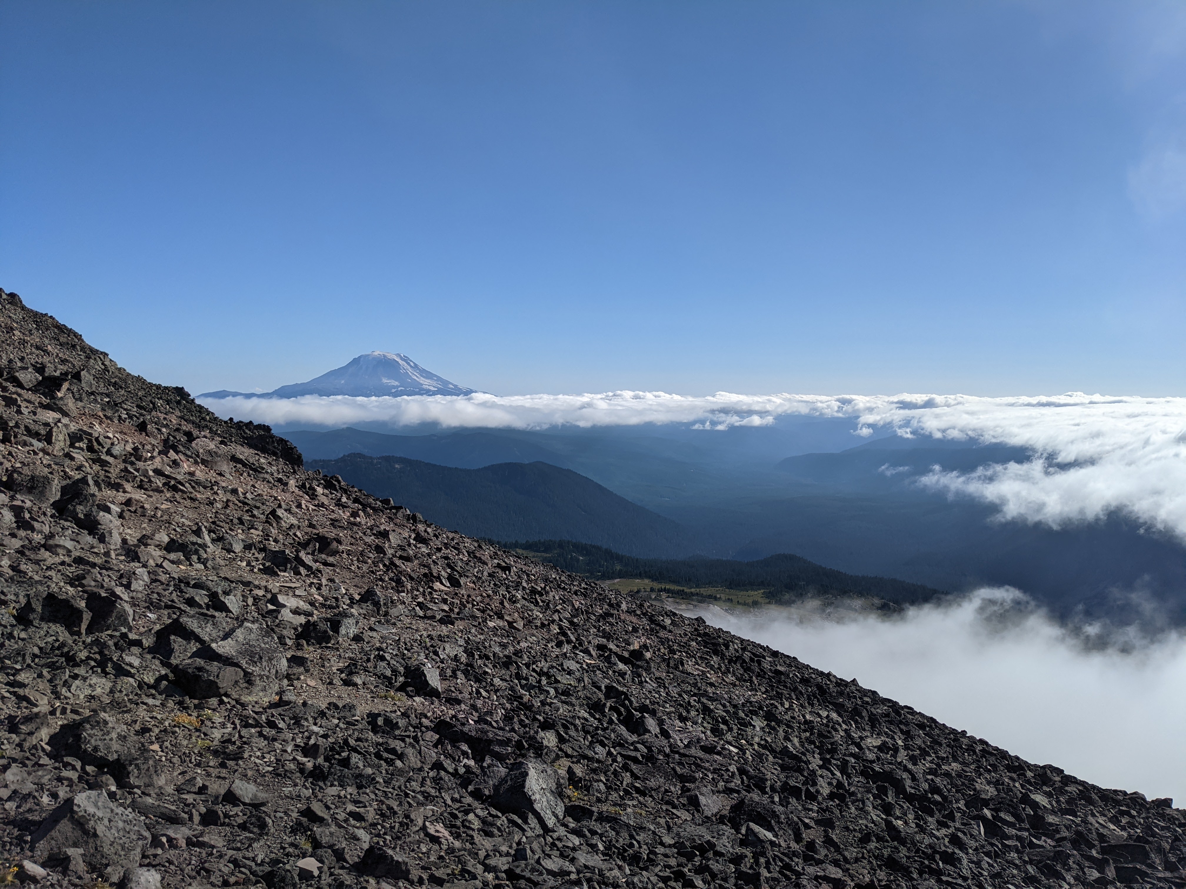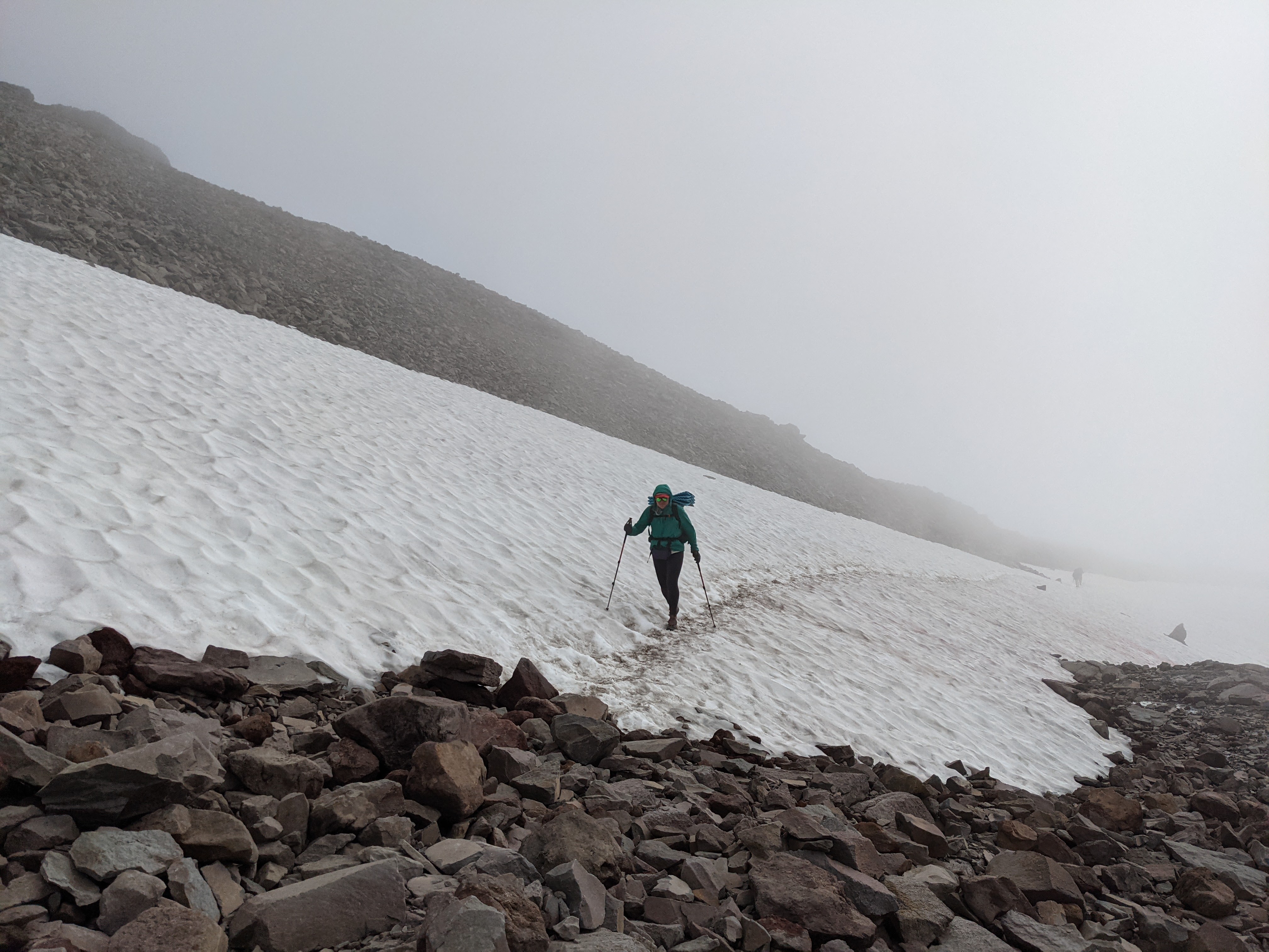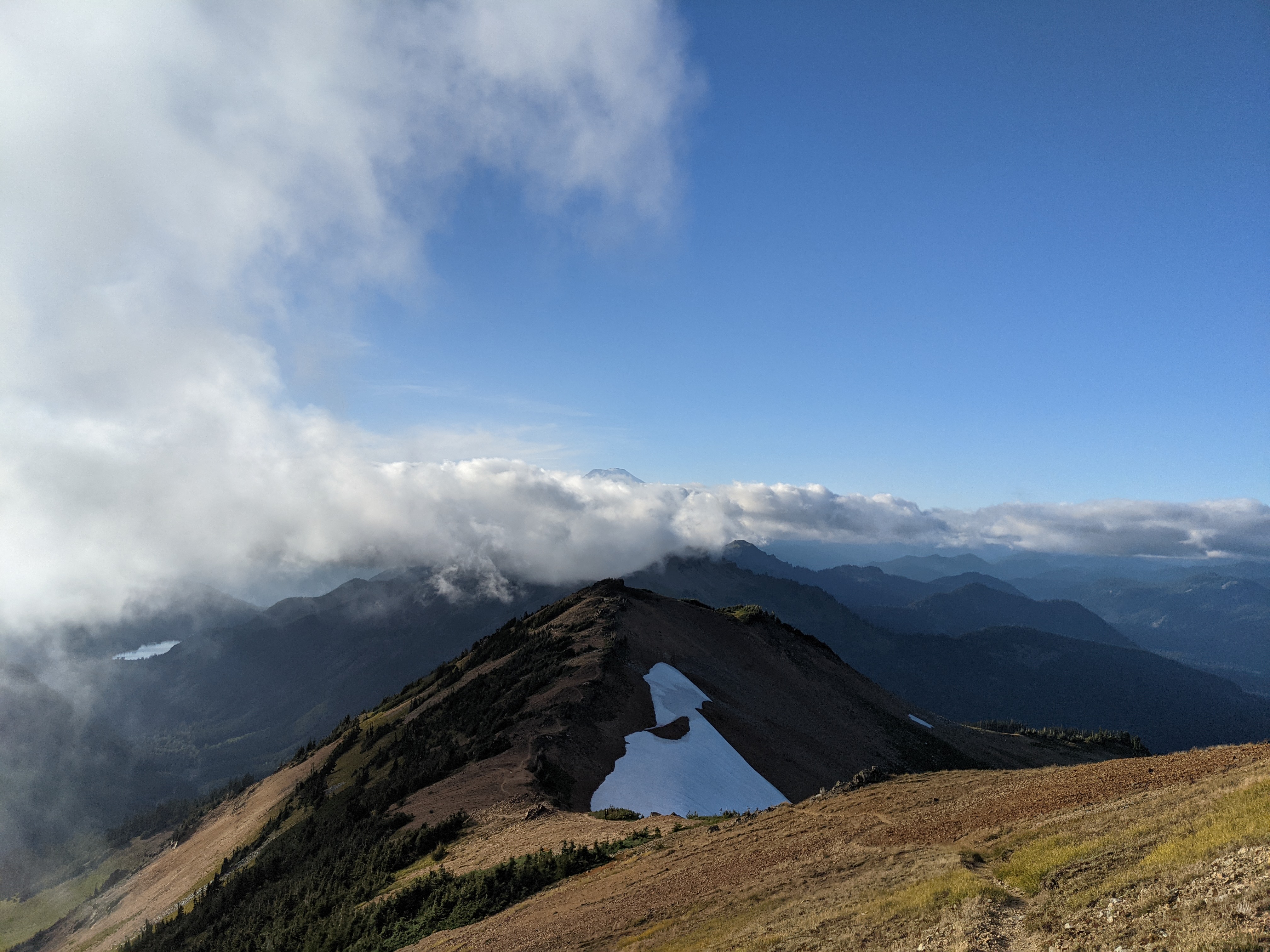 Tent was soaked in the morning from rain all night, and we had a slight dip in the ground that pooled some water that seeped through the tent floor and tyvek. A soggy mess. We checked the weather forecast again to see what the day looked like and it was promising. We could expect light rain in the morning, a cloudy day with light breeze from noon to 5, then 10% chance of rain. The knife’s edge was still 18 miles away, so it would be toward the afternoon/early evening. We’d have to move quick to make it there, and across, to avoid getting caught on an exposed ridge during a storm. We ended up with great weather. The morning was wet, passing through the overgrowth and the leaves transferring rain to pant legs. We saw what I think was a mountain lion. I mainly saw movement through the brush, but got a glimpse of its ass. Hah! A long tail and it seemed to have greyish fur. About hip height because the huckleberry bushes were about knee height. After 6 miles we briefly stopped for a snack. We cruised through the early miles and even part of the climb. Our plan was to eat lunch at the top of Cispus Pass, and hoped to get great views. It was incredible! The whole rest of the day was full of amazing views. We took a very long time working our way through Goat Rocks taking picture after picture. One of the water sources was a big waterfall right on trail. A large patch of snow was probably the longest section of snow that we’ve encountered the entire trail. Mt. Adams peaked out above the clouds. Walking across the knife edge was a thrill. Our water for camp came from glacial melt. We even got fresh nectarines from a group of hikers that were hiking with llamas! I was excited for today’s section and it fully delivered. A wonderful day on trail.