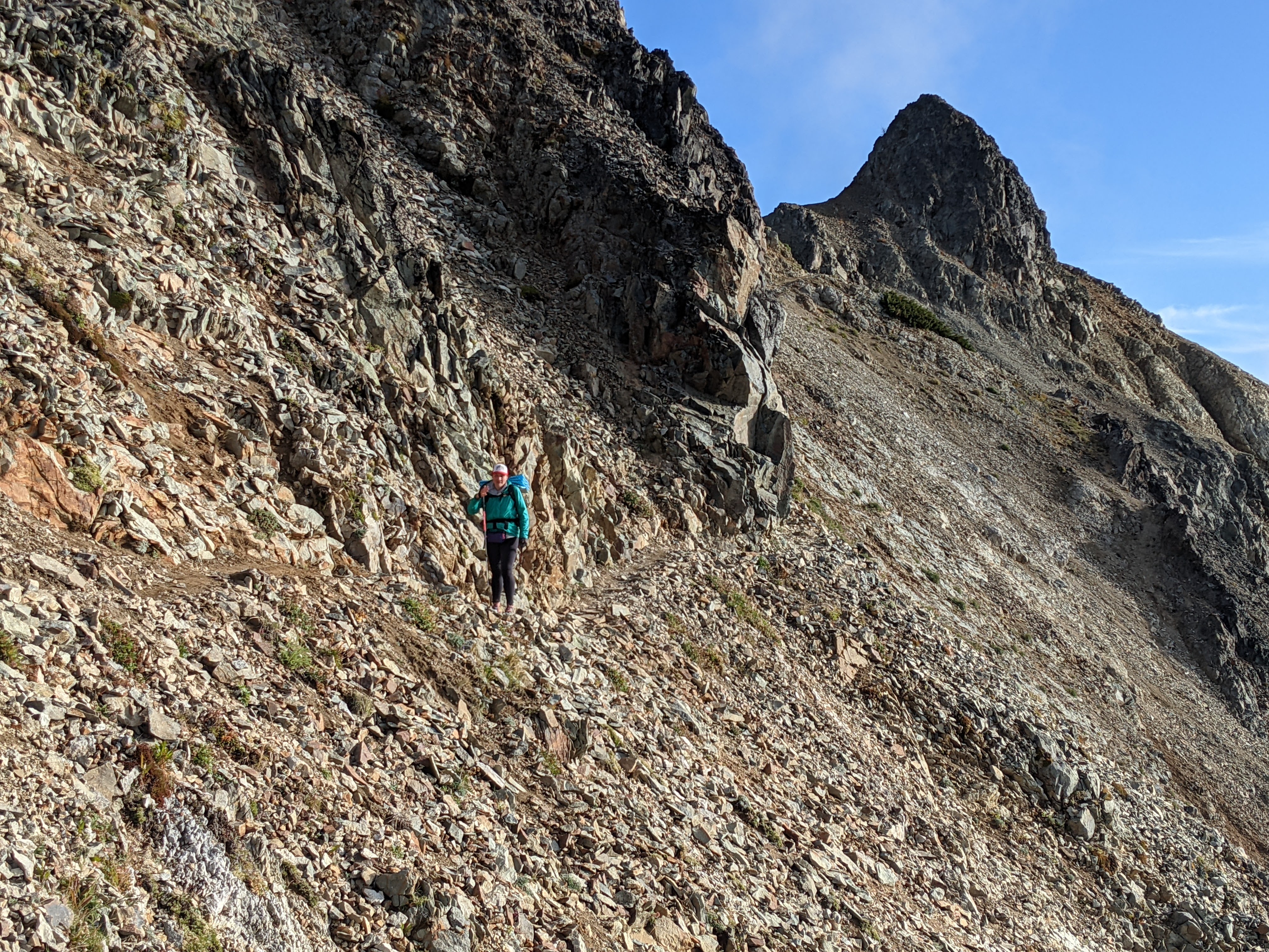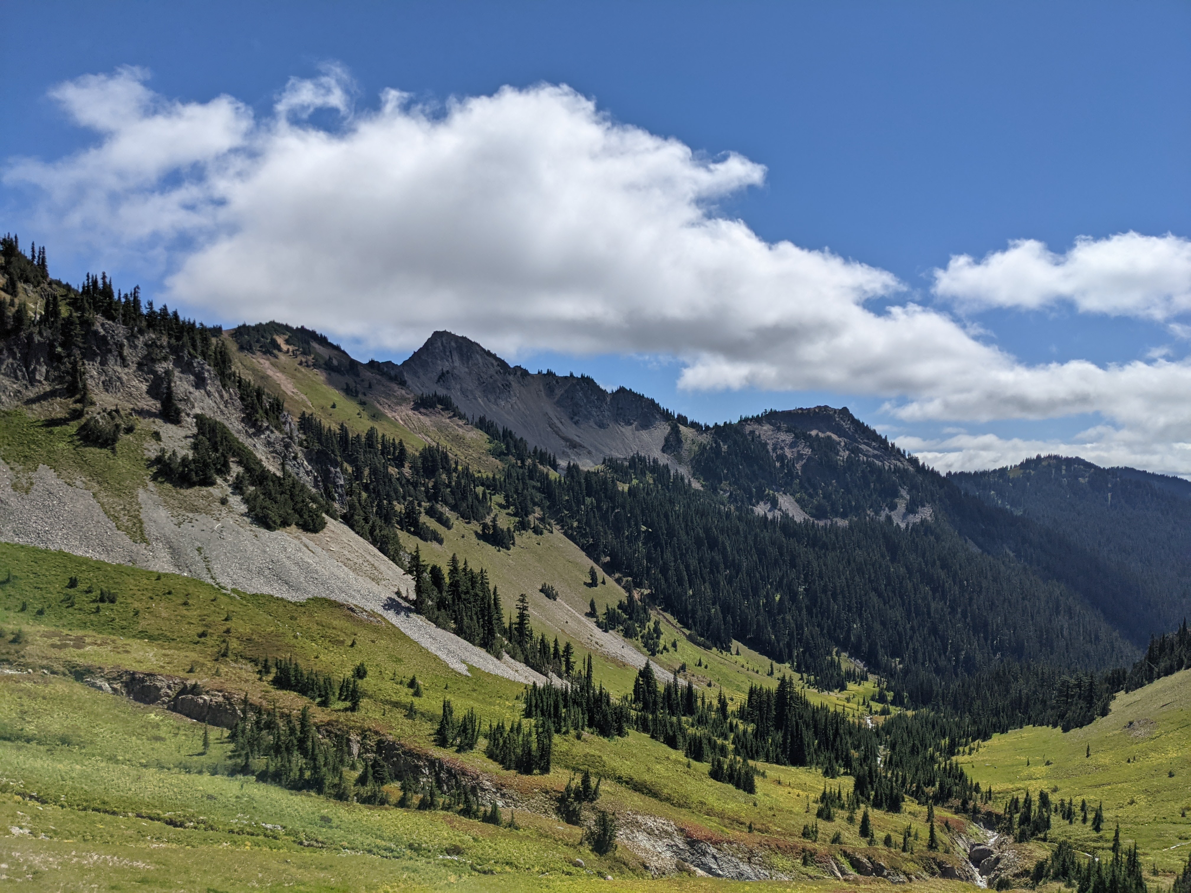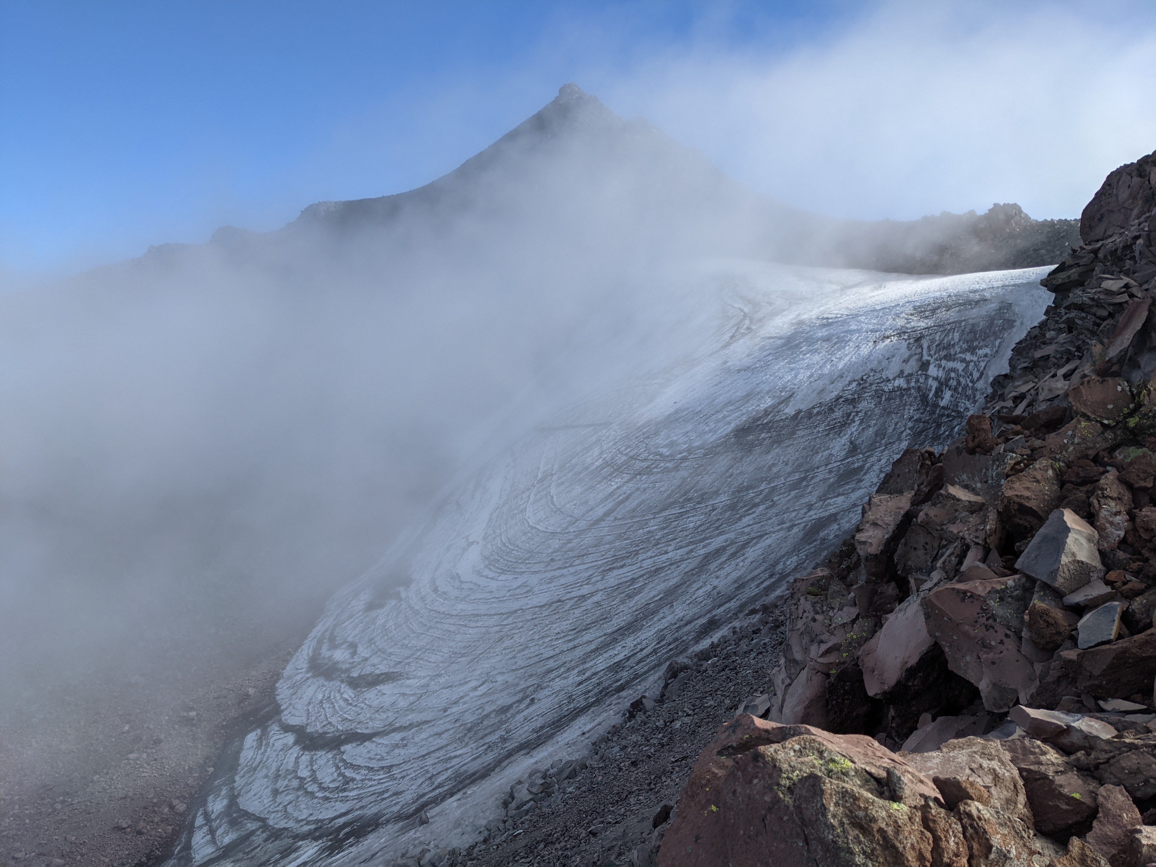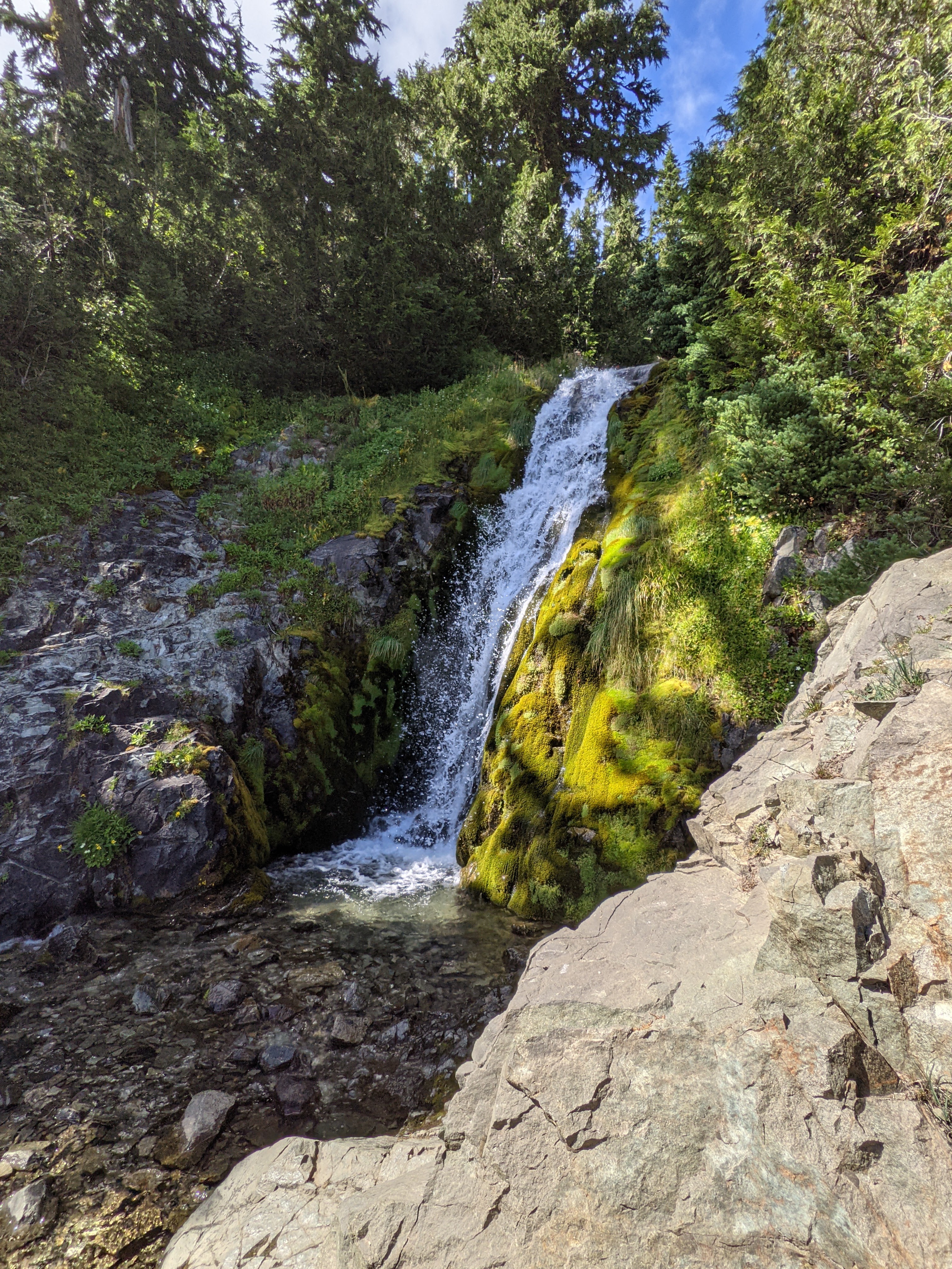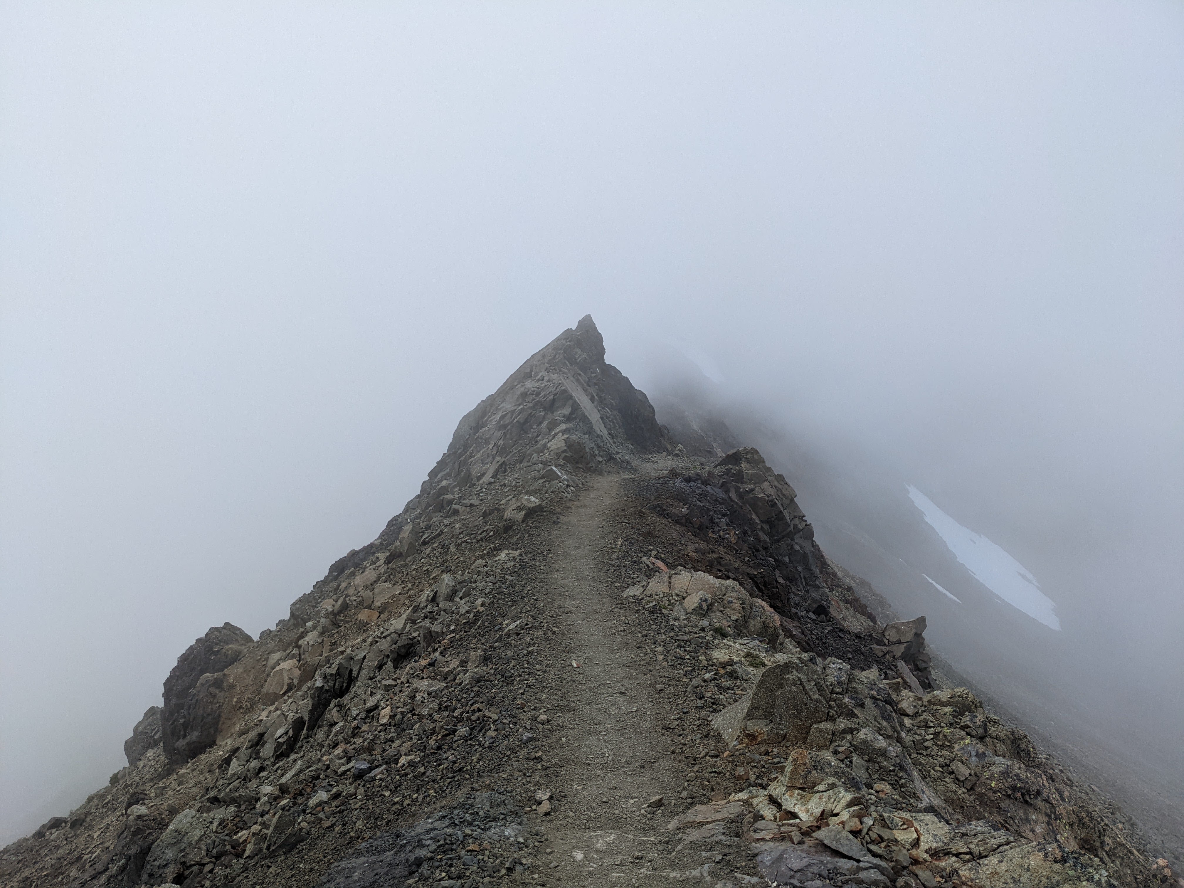 Tent was soaked in the morning from rain all night, and we had a slight dip in the ground that pooled some water that seeped through the tent floor and tyvek. A soggy mess. We checked the weather forecast again to see what the day looked like and it was promising. We could expect light rain in the morning, a cloudy day with light breeze from noon to 5, then 10% chance of rain. The knife’s edge was still 18 miles away, so it would be toward the afternoon/early evening. We’d have to move quick to make it there, and across, to avoid getting caught on an exposed ridge during a storm. We ended up with great weather. The morning was wet, passing through the overgrowth and the leaves transferring rain to pant legs. We saw what I think was a mountain lion. I mainly saw movement through the brush, but got a glimpse of its ass. Hah! A long tail and it seemed to have greyish fur. About hip height because the huckleberry bushes were about knee height. After 6 miles we briefly stopped for a snack. We cruised through the early miles and even part of the climb. Our plan was to eat lunch at the top of Cispus Pass, and hoped to get great views. It was incredible! The whole rest of the day was full of amazing views. We took a very long time working our way through Goat Rocks taking picture after picture. One of the water sources was a big waterfall right on trail. A large patch of snow was probably the longest section of snow that we’ve encountered the entire trail. Mt. Adams peaked out above the clouds. Walking across the knife edge was a thrill. Our water for camp came from glacial melt. We even got fresh nectarines from a group of hikers that were hiking with llamas! I was excited for today’s section and it fully delivered. A wonderful day on trail.