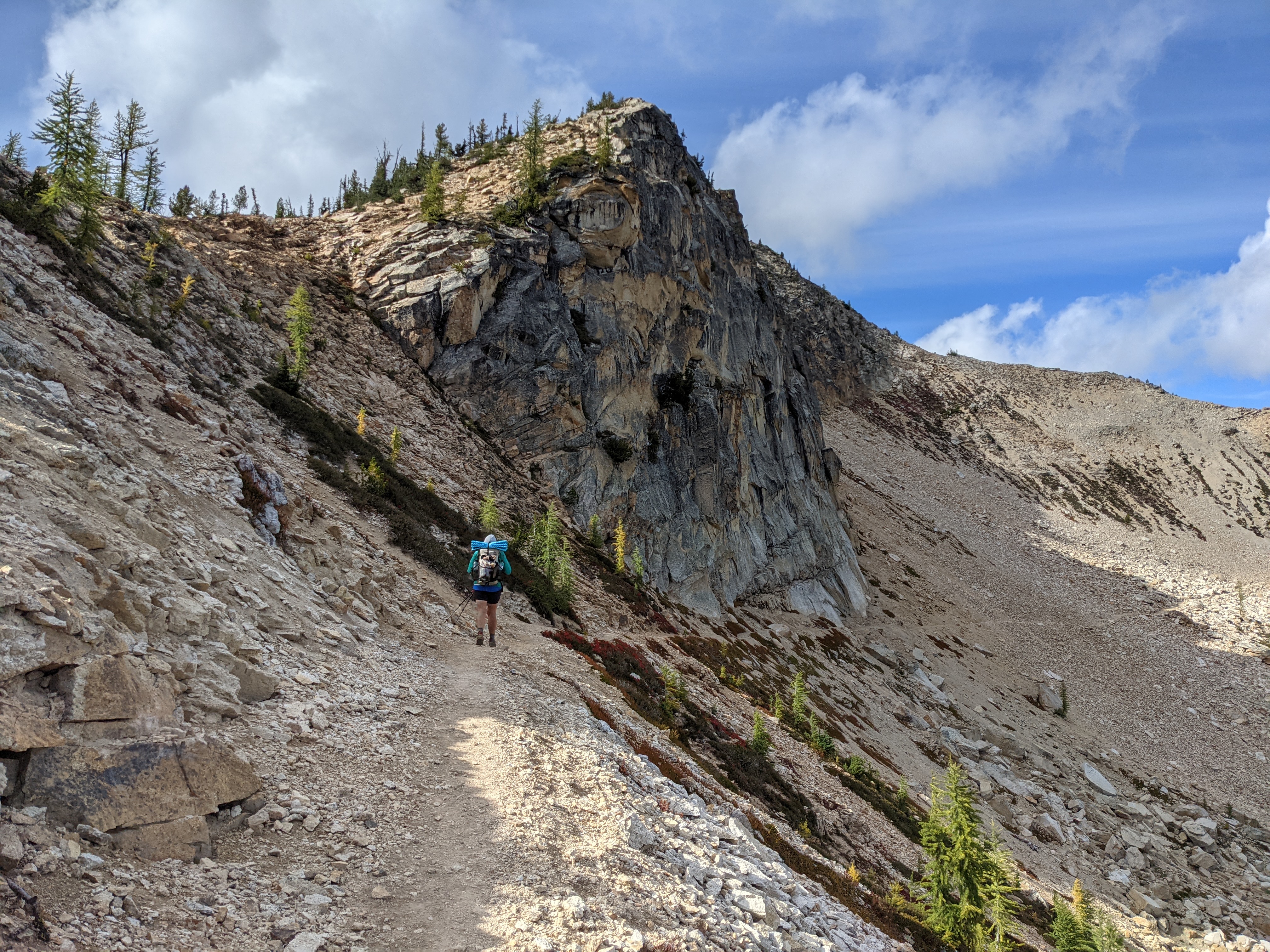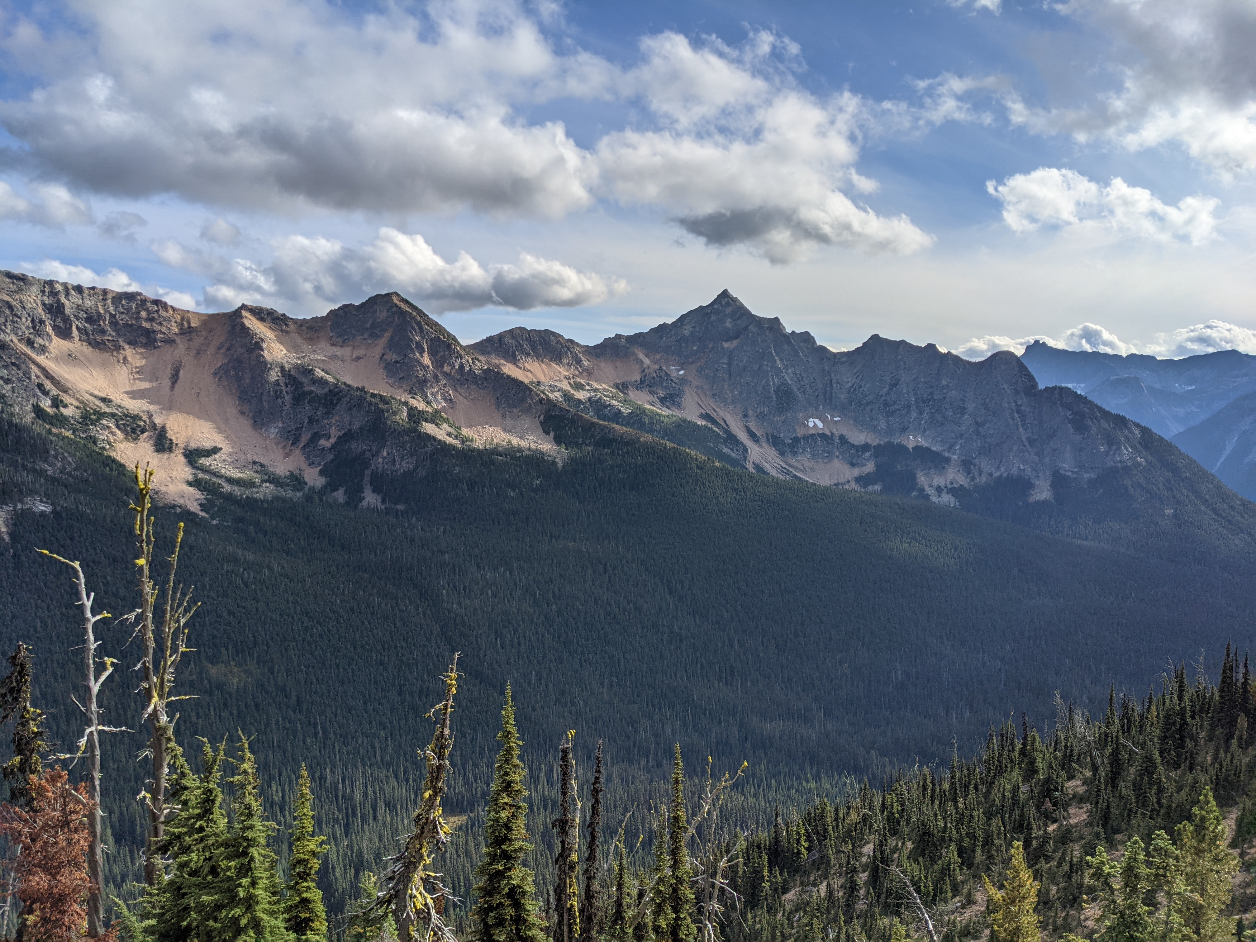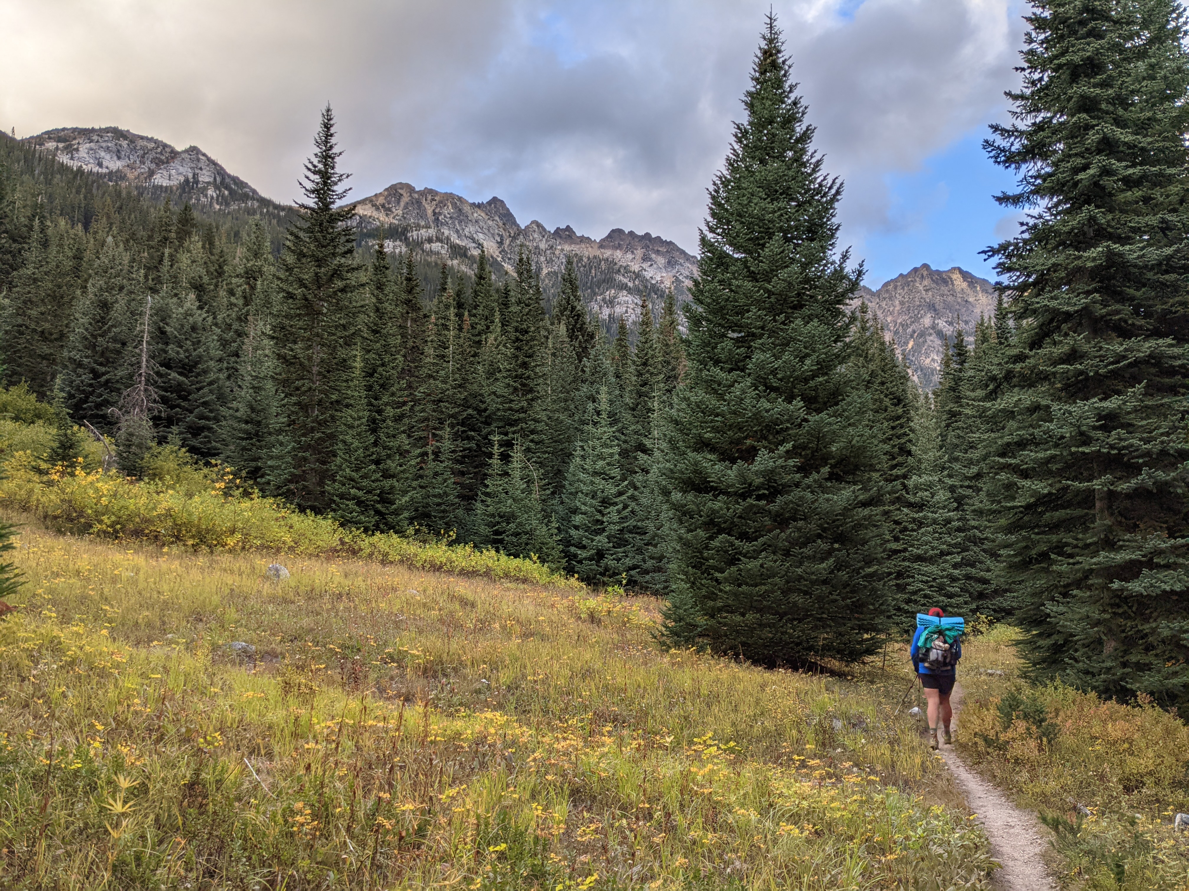 Most people had cleared out of camp before we got up, but not all. There was even a line to use the privy. A trekking pole stuck in the ground indicating it was in-use seemed to be the unspoken, but obvious sign. As we packed up, we saw Flavortown was camped here too. She must have hiked further than the rest of her group since she had gotten an earlier bus. The first push was up to the highway at Rainy Pass. Narrator passed us, but we caught up to her just before the road. The morning had been cold and damp from yesterday’s rain, but the sun was shining at the road. We sat in front of the trailhead sign, eating a snack, and warming up. Magnet, Sunshine, and Flavortown eventually showed up. We wished Magnet a happy birthday and then she started thumbing for rides. With 4 female hikers, it didn’t take long for a guy in a Prius to stop for them. Piled in and seemingly excited to get to town, they took off for Mazama. We continued across the road and up to the next trailhead. Before we got there though, we were greeted with trail magic from Germanator (’18) and his mom. Another hiker said there were hot drinks so we were quickly sold on stopping for a cup of coffee and to chat. The trail angels were great hosts with a huge spread of food and drinks. Being this close to the finish, none of us expected there to be anymore magic, but here it was. It really can turn your day around. After round 2 of snacks, we actually started hiking again. We needed to finish the climb and eat lunch yet. So up we went to the top of Cutthroat Pass. Incredible views and a nice spot to eat lunch, it was worth the effort. It was windy and cold, however, so we didn’t stay long. We started the descent to camp, but didn’t reach the river until about 7:30. It was getting dark and we had to make do with the worst site we’ve used all trail. The group that was already here helped us find it though, and not wanting to look anymore, we made it work. Let’s hope the weather is in our favor tonight because this pitch is awful. About 3 miles before camp, we came up on another bear. It seemed smaller, but then we saw a cub nearby and realized it was a mama bear. We yelled, it dropped down off the trail into some brush, but the two walked parallel to the trail for a while before we could pass safely. Gotta be extra cautious with mother bears. That makes 7 bears for us so far.