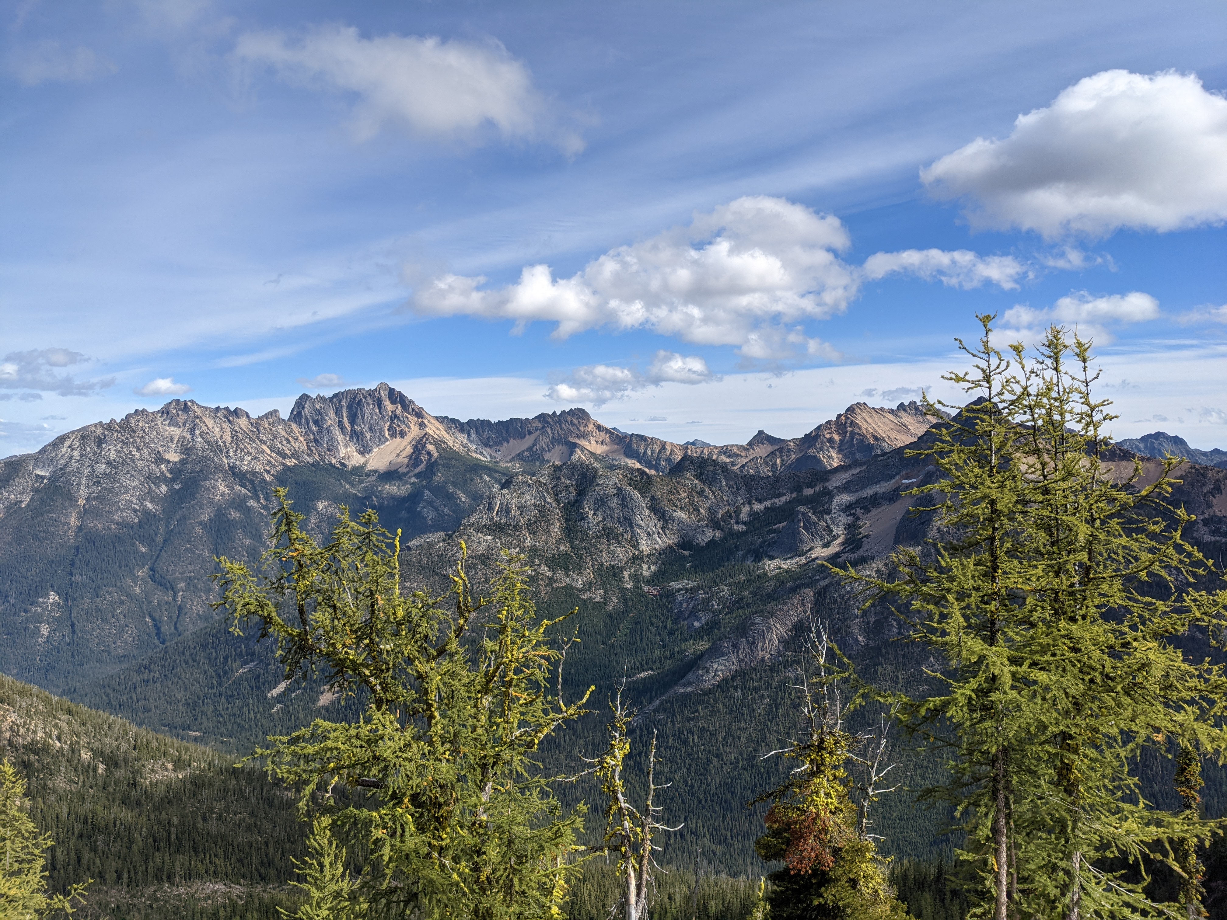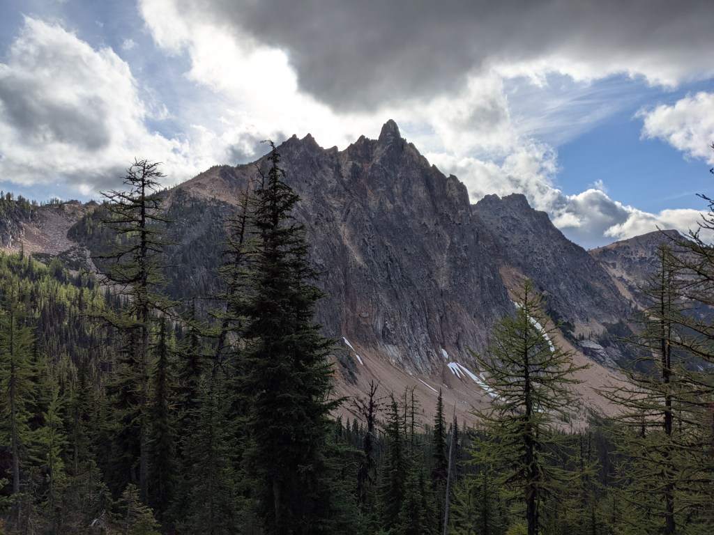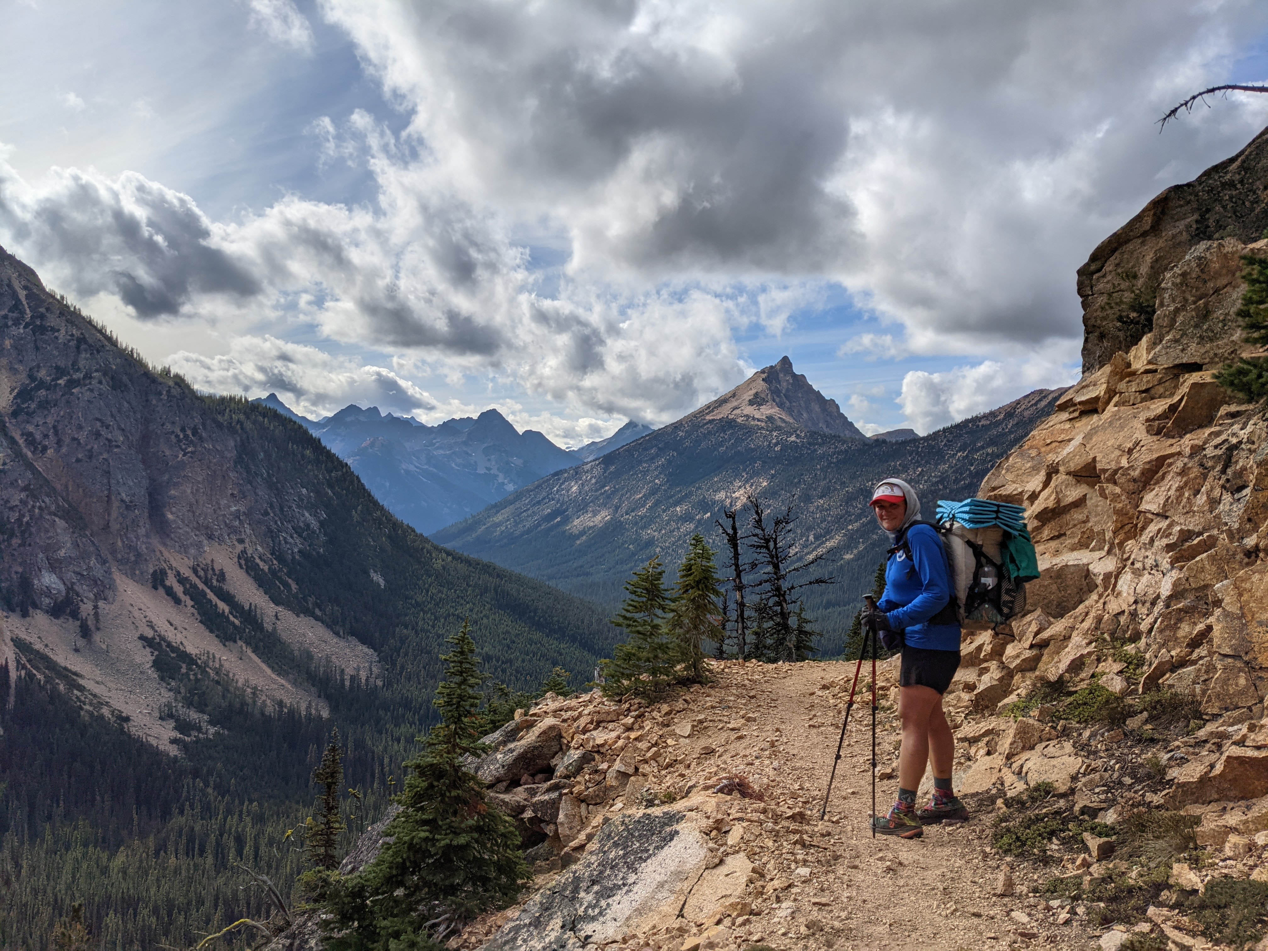 Most people had cleared out of camp before we got up, but not all. There was even a line to use the privy. A trekking pole stuck in the ground indicating it was in-use seemed to be the unspoken, but obvious sign. As we packed up, we saw Flavortown was camped here too. She must have hiked further than the rest of her group since she had gotten an earlier bus. The first push was up to the highway at Rainy Pass. Narrator passed us, but we caught up to her just before the road. The morning had been cold and damp from yesterday’s rain, but the sun was shining at the road. We sat in front of the trailhead sign, eating a snack, and warming up. Magnet, Sunshine, and Flavortown eventually showed up. We wished Magnet a happy birthday and then she started thumbing for rides. With 4 female hikers, it didn’t take long for a guy in a Prius to stop for them. Piled in and seemingly excited to get to town, they took off for Mazama. We continued across the road and up to the next trailhead. Before we got there though, we were greeted with trail magic from Germanator (’18) and his mom. Another hiker said there were hot drinks so we were quickly sold on stopping for a cup of coffee and to chat. The trail angels were great hosts with a huge spread of food and drinks. Being this close to the finish, none of us expected there to be anymore magic, but here it was. It really can turn your day around. After round 2 of snacks, we actually started hiking again. We needed to finish the climb and eat lunch yet. So up we went to the top of Cutthroat Pass. Incredible views and a nice spot to eat lunch, it was worth the effort. It was windy and cold, however, so we didn’t stay long. We started the descent to camp, but didn’t reach the river until about 7:30. It was getting dark and we had to make do with the worst site we’ve used all trail. The group that was already here helped us find it though, and not wanting to look anymore, we made it work. Let’s hope the weather is in our favor tonight because this pitch is awful. About 3 miles before camp, we came up on another bear. It seemed smaller, but then we saw a cub nearby and realized it was a mama bear. We yelled, it dropped down off the trail into some brush, but the two walked parallel to the trail for a while before we could pass safely. Gotta be extra cautious with mother bears. That makes 7 bears for us so far.