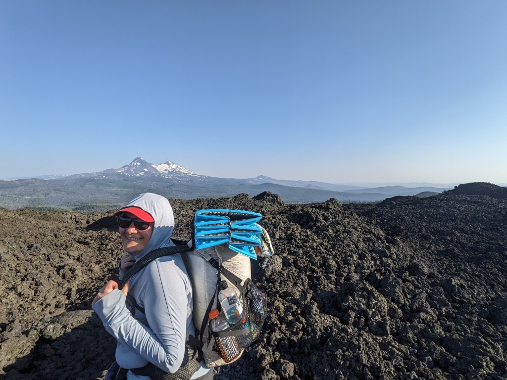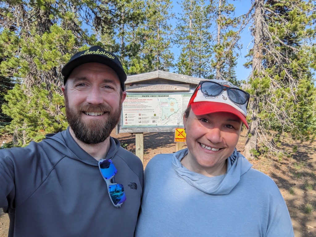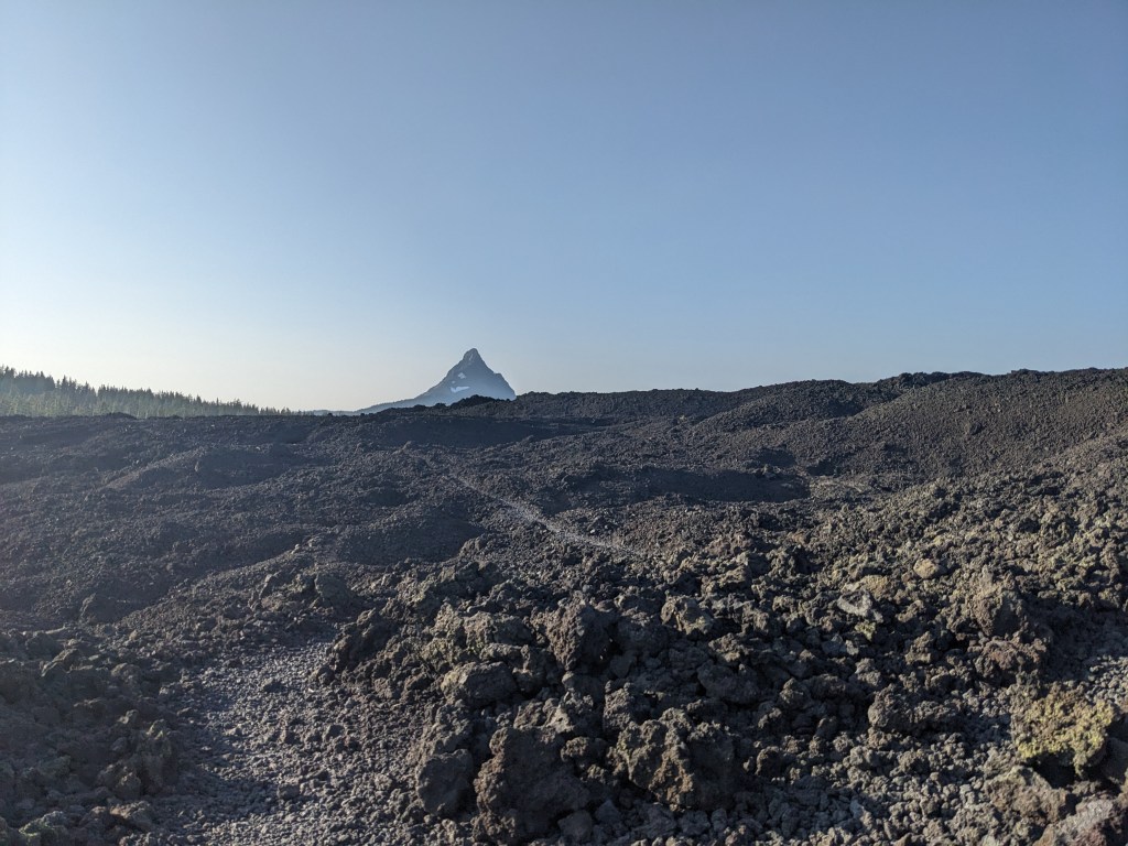 Up at 6, showered, went down to the buffet for breakfast, checked out and then made our way over to the train. A couple hours later we got off in Portland. We first walked to Safeway to get a couple things we had forgotten, and grabbed Chipotle on the way back to Union Station. Since Alaska doesn’t have Chipotle, this was a nice treat. We ate on a bench in the shade outside, which provided some good people-watching. We then boarded a bus for the ride to Sisters. It was fun riding up the road seeing familiar mountains and the intersection with the PCT. The bus dropped us at the Chevron, we made a pit stop inside the c-store and then walked over to where Highway 242 heads out of town. We walked along for about 10 minutes with far fewer cars passing than we hoped. However, we did get a hitch from a local guy that took us all the way to the trailhead near Dee Wright Observatory. We thanked him and then walked over to the trail sign to take some pictures. With our restart of the trail fully documented, we started walking. The trail winds up and through lava rocks, which provides great, unobstructed views (since there’s rarely a tree in the way). To the South we had North and Middle Sister mountains, plus The Husband a bit to the West. Ahead to the North we had Mt. Washington and Mt. Jefferson. We passed four people today, 2 day hikers heading back to the trailhead, a guy setting up his tent about 3 miles in where there was a patch of trees that were still alive, and a tent about a quarter mile before we stopped. This section is all burn area and the next section north of Santiam was closed our first year due to fire. I assume most hikers from our year haven’t done that section, unless they ignored the fire closure and hiked it anyway. The lava rocks, despite being mostly crazy, moon-like terrain, has swaths of trees towards the edges. Most of which were burnt. We are camped in one of the few clear areas and we are using some new attachments for the tent that let us pitch it without a rain fly on top. This makes our tent just a mesh bivy of sorts. It’s really nice to be able to stare up at the stars.