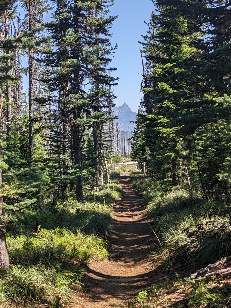 Rough day! Last night we rediscovered that one of the zippers in the tent needs replaced (rookie mistake #1, should have addressed that after our ’21 hike), and Marie’s pillow won’t hold air (rookie mistake #2, should have put a permanent fix instead of the tenacious tape that’s been on it since our ’21 hike). We also had to be strict with water since we hadn’t brought enough with us (rookie mistake #3, should have brought more water from the start based on our target miles and high temps). We made it work though. The zipper can work if you guide it juuuust right, a combo of the deflating pillow and some extra clothes will be fine for a night or two, and we had a questionable water source in 4 miles. Had that small pool been dry, we would have been alright stretching our water the last couple miles downhill to Big Lake Youth Camp, no big deal. The tiny pool still had water though, so we lucked out. The youth camp is extremely generous to PCT hikers! We filled our bottles and I grabbed an extra couple liters for the day. We only hung out for a bit in their PCT Hiker building, but they have 3 meals a day, laundry, showers, water, a kitchen, resupply storage, and other hiker amenities. Super cool. We met a guy named Paul, a guy named Carrot, and a lady named Whimsy. Wanting to keep lightening our packs, we opted to head back out and eat the food we were carrying instead of eating their lunch. We hiked out, found the pond at which we were hoping to eat lunch, found the mosquitos, and then found out that Marie’s water filter has threads that don’t match the threads on the pouch that she brought (rookie mistake #4, should have tested the new filter on that pouch, not just the one in the box). My filter works fine, so I collected water for both of us. The mosquitos were hungry, so we hiked a little further until we found a flat spot in the shade that we could setup the tent and eat lunch in peace. Continuing on, while hopping over blowdowns in this dry, burn area, I developed a nosebleed. I stuffed some toilet paper in my nostril and we started walking again. Shortly after, Marie was dealing with skin chafe as we approached the highway leading into Sisters. The same one we came in on riding the bus from Portland. Rather than going 6 more miles, most of which were uphill through more dry, dusty, burned trees, we decided to go back to Sisters, reset, and start again tomorrow. Our hitch into Sisters came from a man named Matt who was driving a rental truck because his own truck had burnt to the ground over the weekend. He was a nice guy, used to take troubled kids on backpacking trips until funding dried up. I hope he eventually gets to the hike the trail, if his wife will let him.