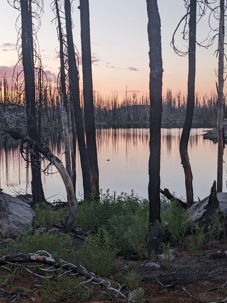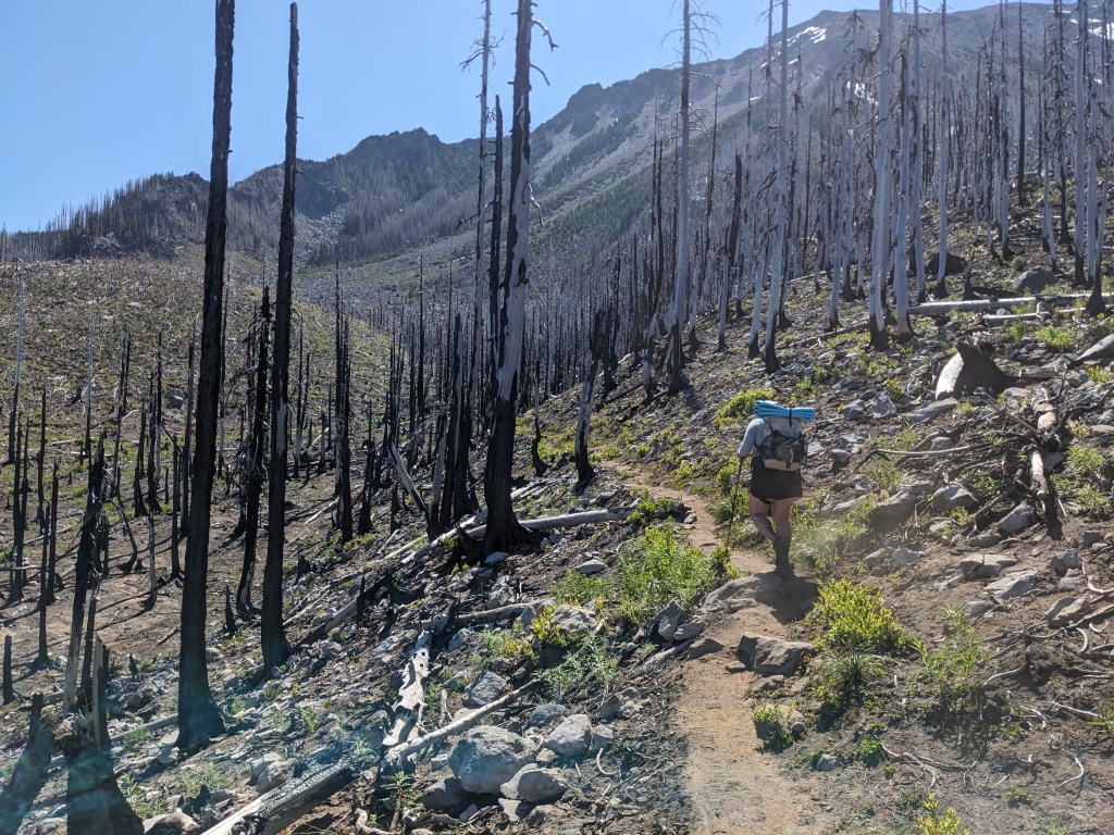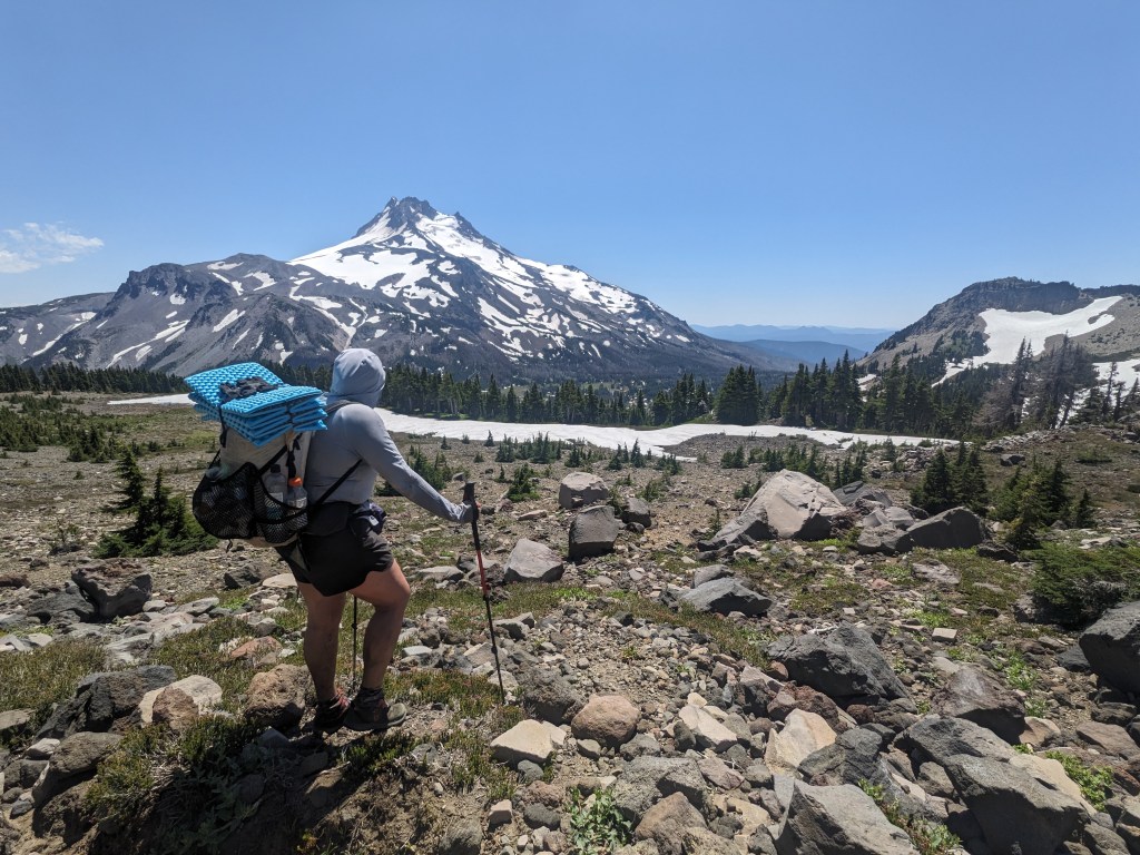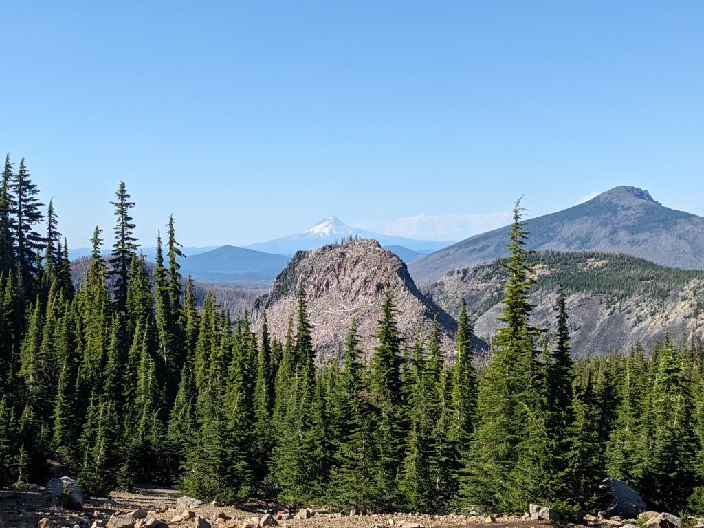 A few hikers walked passed our tent in the morning, but we were still enjoying the shade from the bushes surrounding our spot. We rolled out around 8:15 and slowly made our way up through burnt trees. Along the way we passed by a couple of guys who were cutting up blowdowns. They had both hiked the trail before and gave us suggestions for upcoming stops in Washington. We continued on until we got to Russel Creek, which required some work to cross. Most of the miles today were working around Mount Jefferson. It’s incredibly tall and a few of the weekenders we passed yesterday would have been up there climbing it. I was happy to just be taking pictures of it from below. At the top of our own climb for the day we got our first glimpse of Mount Hood. For the second day in a row we ate lunch around 3pm and then worked our way down. The snow patches have been fairly easy to navigate, and I glissaded a couple of them. The rest of our miles were through burn area until we got to Olallie Lake Resort. They have a PCT Hiker area where we were the last ones to arrive. Marie was happy to get some fish tacos from a group staying at the resort who had made too much food. Whimsy was also camped there, and Carrot too.