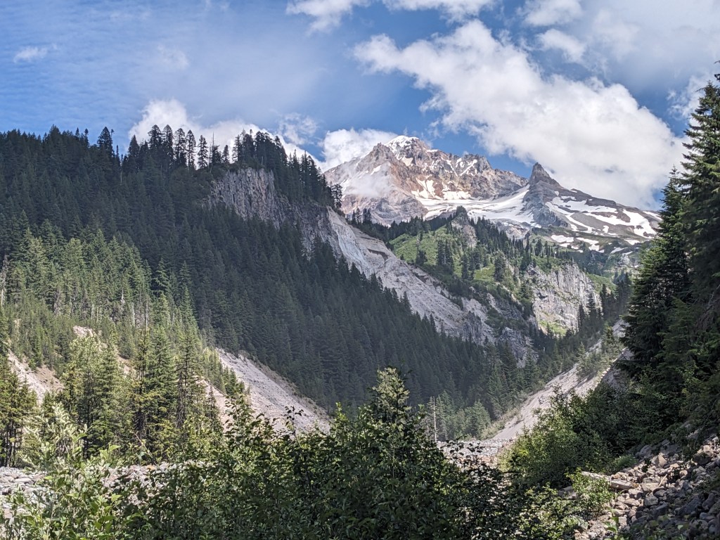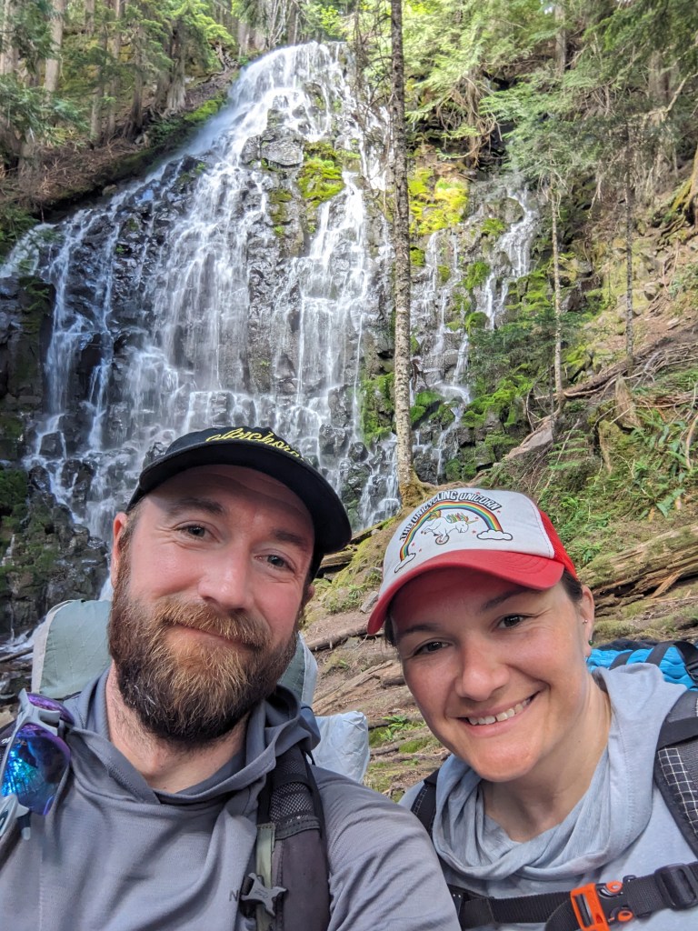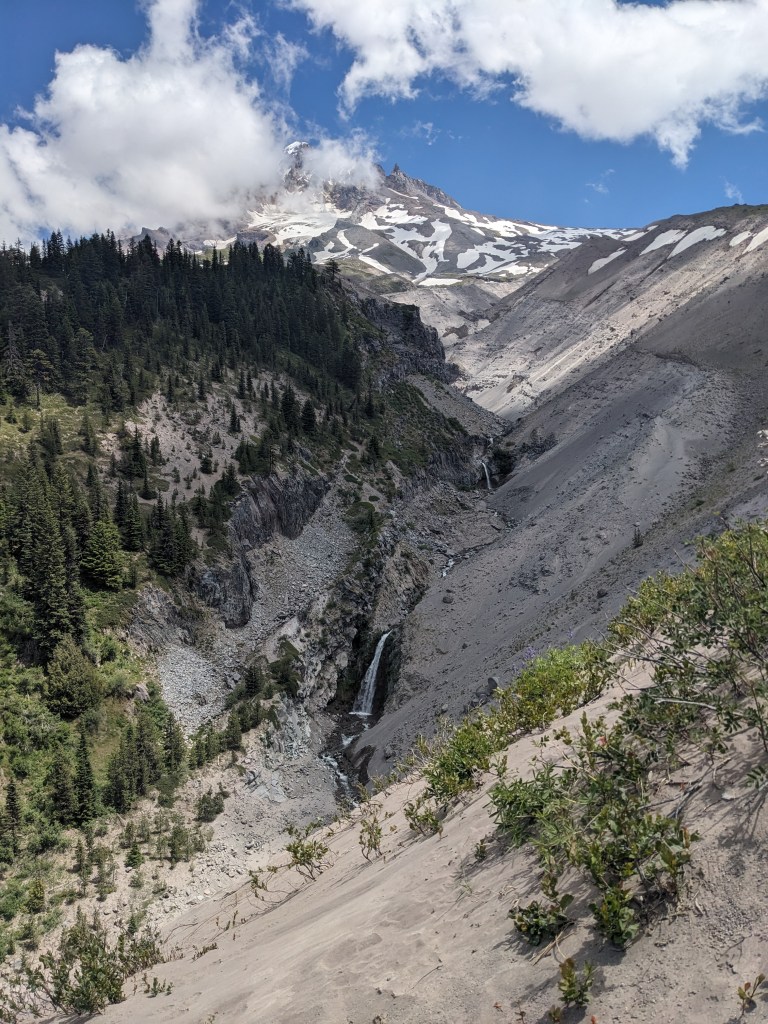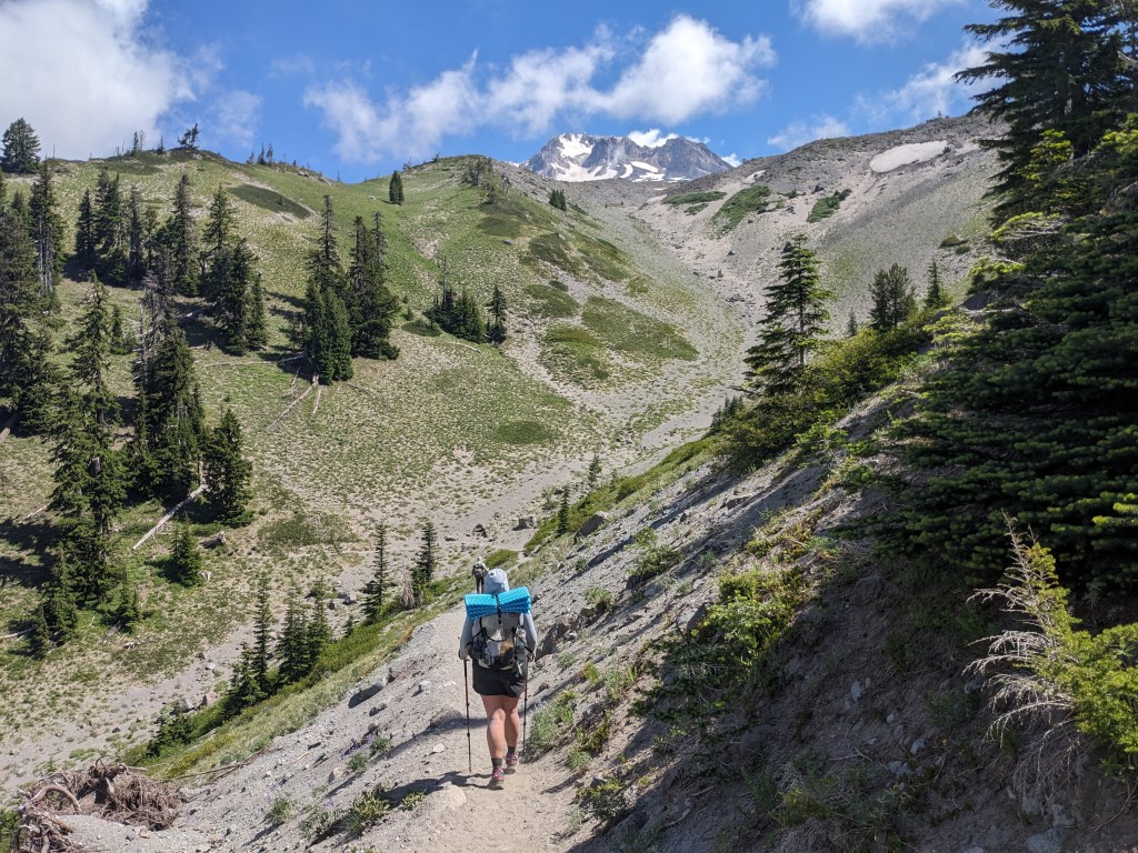 Our campsite had trees that shaded us from the morning sun, which can be annoying with this open air tent. Not complaining, just an aspect of it. The breakfast buffet was half-normal people, half-hikers. Jay was sitting with Malcolm and his friend, and Whimsy showed up eventually too. An older gentleman eyed me up and said, “You must be hiking the PCT.” Sure am! He told me he had also hiked it in 2013, but it was much different then. The snowpack in the Sierra has been a topic with nearly every hiker, and this man brought it up too. Most thru-hikers this year are skipping the Sierra and flipping down after the border. I imagine we would have done similar. I think the desert section would have been fun this year, to see snow, abundant water, and cool temperatures. Totally different than our year. After breakfast we poked around in the Lodge and then headed out. Along the way we passed two groups of PCTA volunteers doing trail maintenance. We got, what I assume are, our last views of Mt. Jefferson. It’s neat to see it so distant to the South when before it was so distant to the North. We’ve covered some hard miles this week and those views were earned. We are only about 24 miles to the Oregon-Washington border and that will close out Oregon for us (we are technically missing some miles near Ashland but whatever). Before we stopped for lunch, we leapfrogged a bit with Big Box. He was getting water right before a tricky river crossing. He chose to go through barefoot, but we decided to go upstream a bit to where it forked and cross the smaller portions. He made it across just fine, and so did we. Marie took her shoes off and crossed both portions, I managed to rockhop with dry shoes. Lunch was relaxing in the shade, the first time we have eaten lunch on trail without setting up the tent to keep mosquitos off. Our route today took us by Ramona Falls, which was beautiful. Some day hikers were standing behind the sign that said “Don’t stand here”. Idiots. The steep sections and switchbacks, mixed with the old growth forest felt very much like the section going into Dunsmuir. I guess it makes sense that over so many miles you’d get some deja vu. We rolled down to camp where Jay was already setup with a couple other hikers. He came out of his tent and chatted with us while we ate dinner. You meet a lot of people on trail and some you can quickly tell you’d get along with them in real life too. We’re planning to do about the same miles tomorrow and camp somewhere on the Eagle Creek alternate.