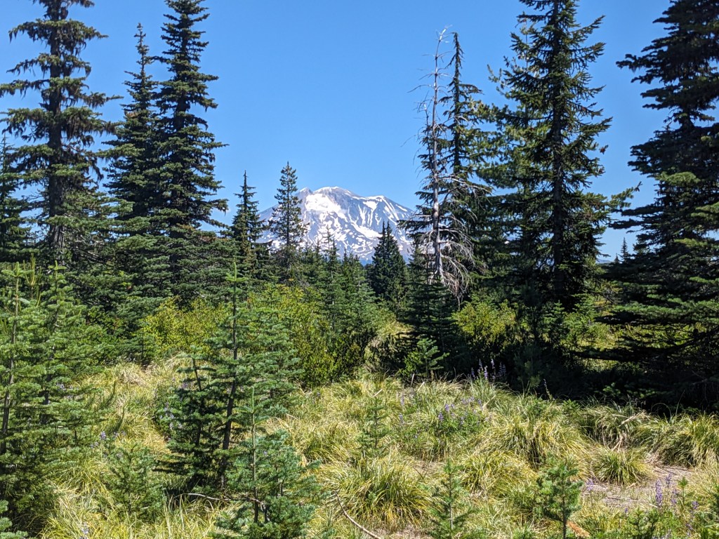 Marshmallow was gone before I got up, but Yardsale and Chickadee were still around. We talked a quick gameplan for the day to get close enough for the hike out to Trout Lake tomorrow morning. Rolling terrain today, no major climbs. 13 before lunch and then 9 after to camp. The morning was a little rough because I gambled on some water sources that turned out to be dry. As soon as we broke from lunch, Ghost walked up. He had done 42 yesterday coming out of Cascade Locks, which means about 11,000 ft of gain for the day. With 26 behind him at 2pm he still planned to hike for 6 more hours. The bugs today got bad, to where we started wearing headnets while hiking. Swatted at them all day, and occasionally applied bug spray. They only swarm when you stop moving, so we took far fewer breaks. Camp was already occupied by some day hikers. We asked if we could join them at their site, and they didn’t mind. As the evening rolled on, more and more hikers rolled in and this giant space is now nearly full. It’s a cool spot next to a river with huge trees all around. Day hikers who ignore campfire bans are idiots though. Looking forward to town tomorrow, a shower and beer awaits.