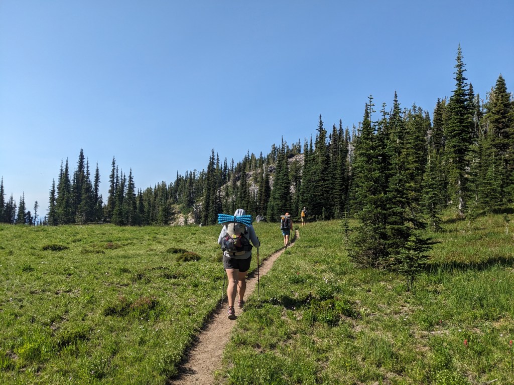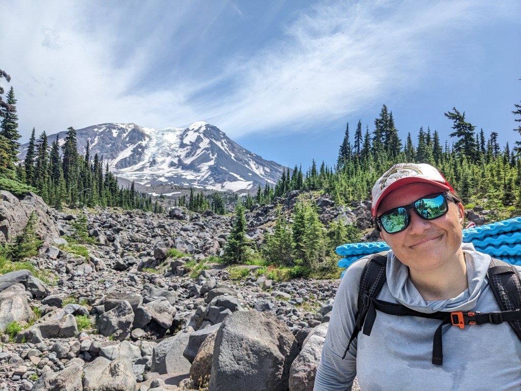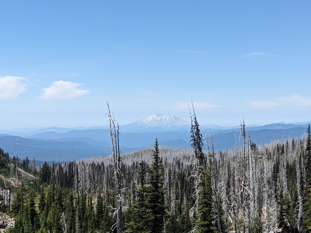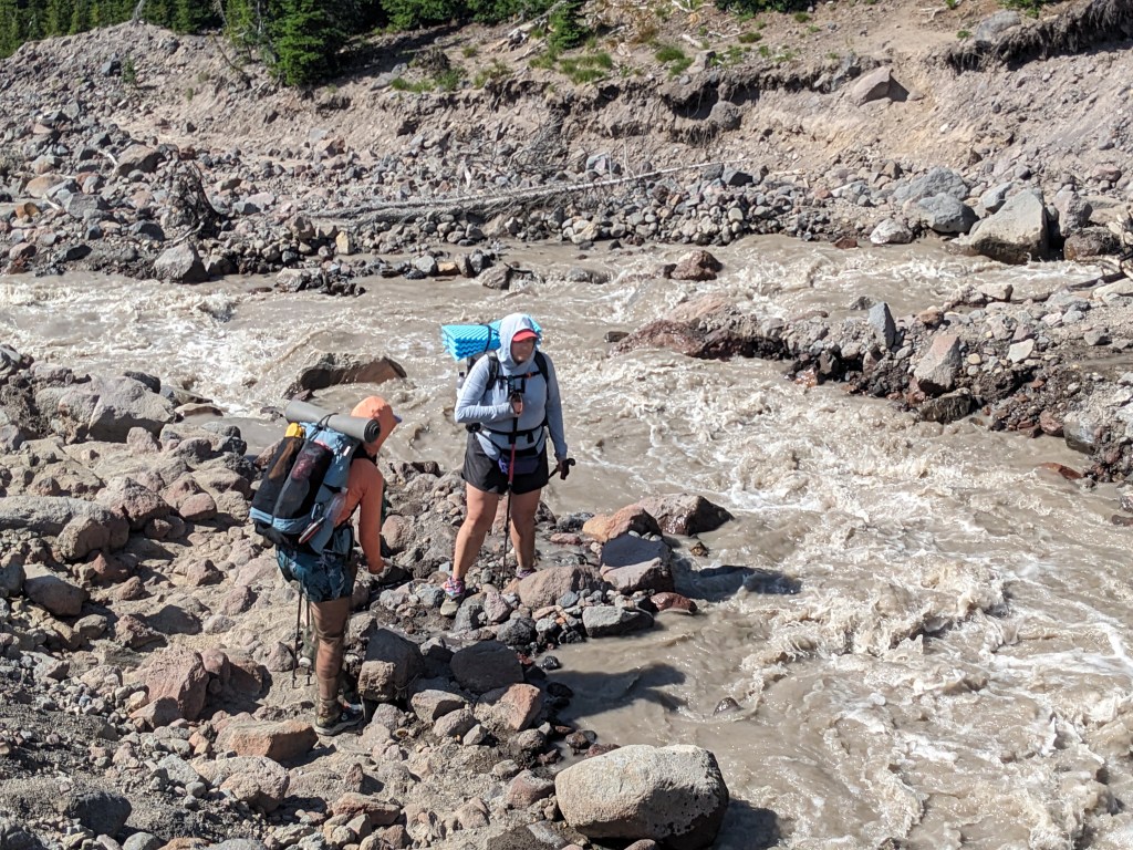 Everyone packed up and we walked over to the coffee shop, but it wasnt open yet. So we went to the cafe instead. It was full of old white dudes sipping coffee and bullshitting. Egg and bacon sandwiches were delicious, coffee too. We quickly finished up knowing we had to catch the 8:00 shuttle back to the trailhead. Dennis was our driver, a local guy, very nice and personable. When we got to the trailhead there were about dozen other hikers hoping to go into town on the return shuttle. Off we went for a casual climb up to some great views of Mt. St. Helens, Mt. Adams, and Mt. Rainier. After lunch we needed to cross Adams Creek, which was a bit sketchy. Yardsale went across upstream on some logs, then Marie started downstream in her socks in the water. The current was fast and glacial silt made it murky. Chickadee started over in her camp shoes and worked her way across, then Marie did too. I went up to where Yardsale crossed and did the same thing. The logs were wet and narrow, and I dunked my shoe in the process of getting onto them. But I made it over and we all regrouped. Cruisey downhills to camp. Ate dinner with Yardsale and Chickadee at Lava Spring.