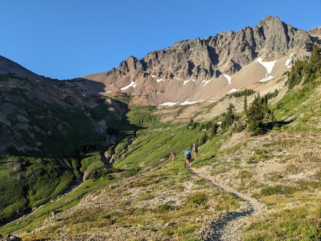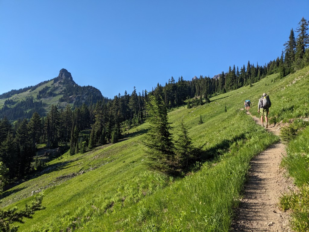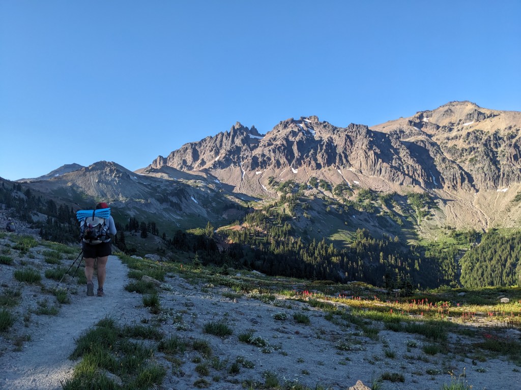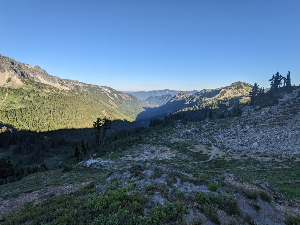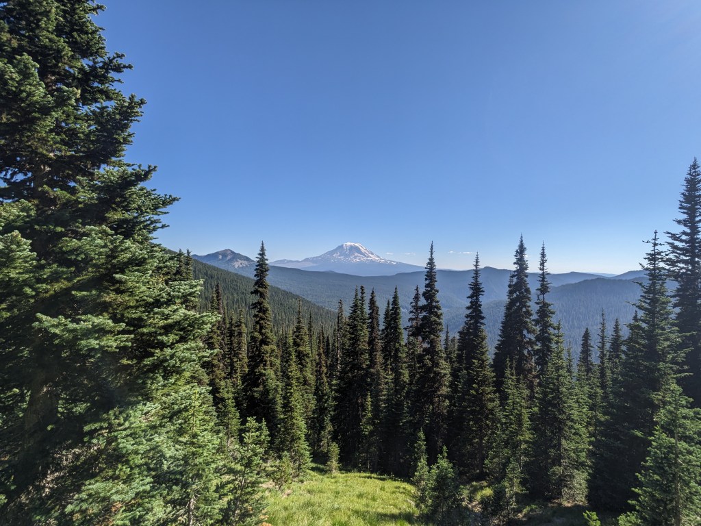 My quilt had droplets of condensation on it when I woke up, but laying it in a tree where the sun could hit it dried it right up. No one was in a hurry to get walking, but we eventually rolled out around 8:45. The first few miles were cruisey and rolly, and the mosquitos were always there with us. We had been warned by several SOBOers and they were not lying. Collecting water is the worst of it, you’re helpless! In the evening we made it up to Cispus Pass. It was one of my favorite sections of trail last time we came through and it remains that way. The approach trail has incredible views of Adams, when you gain the ridge you get this incredible valley, then the pass itself and coming down the other side into another massive valley. Just beautiful. You walk all the way around, waterfalls along the way. We are only doing part of the northern side of the pass today. Our campsite is shared with a trio of weekenders, but they don’t seem to mind that we’re here; our spots are fairly isolated from them. The view from this campsite is top notch.