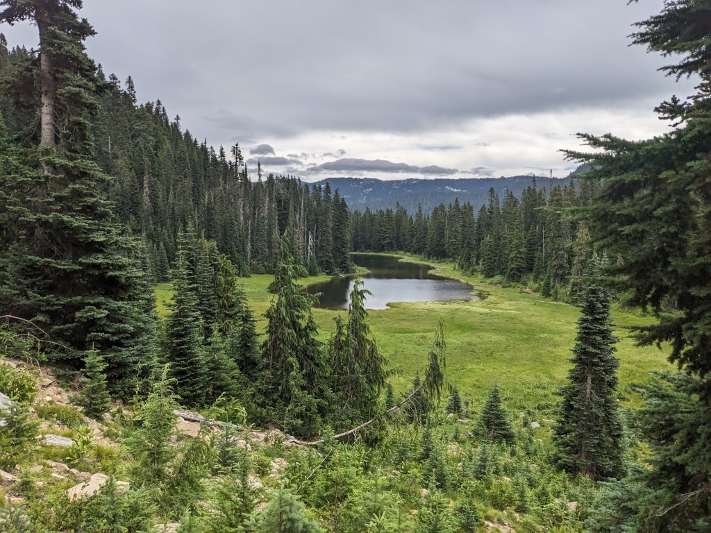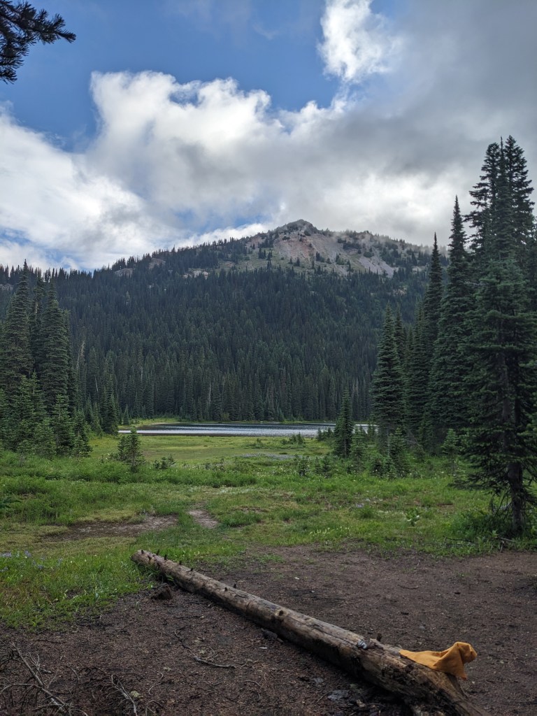 The first few miles were easy, but 10 minutes or so into the climb for the day, it started lightly raining. We stopped to yardsale our stuff on the side of the trail so we could get our rain gear to the top of our packs and the rest of our stuff into a plastic bag/pack liner. We only had to walk a few more miles before lunch, and it stopped raining for the half hour that we stopped. The rest of the afternoon was drizzly as we dropped down to Dewey Lake. Yardsale and Chickadee made it to camp and already had their tent set up when we rolled in. We got ours pitched and then immediately changed into dry clothes. Dinner was beef ramen, a Costco granola bar, a Clif bar, and a Lenny & Larry cookie. Rain makes me focus on just getting the miles in so we can get to camp, and in the process I tend to skip water and snacks. Playing catch up by eating a bunch was nice though and it helped me warm up.