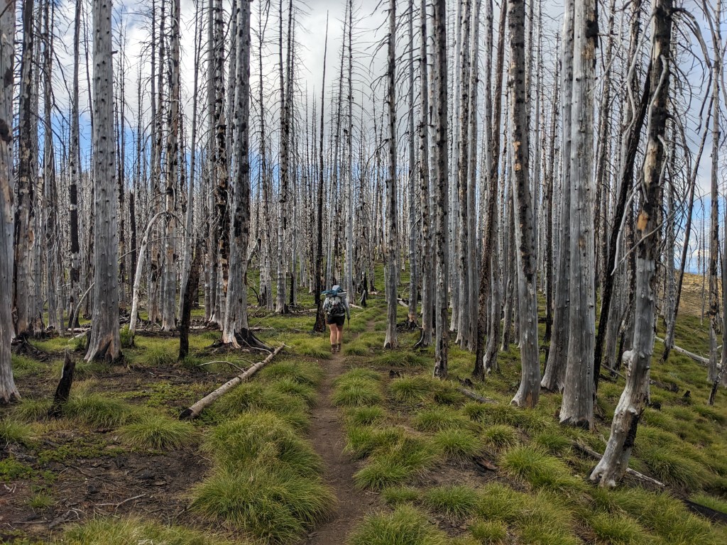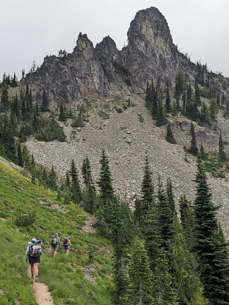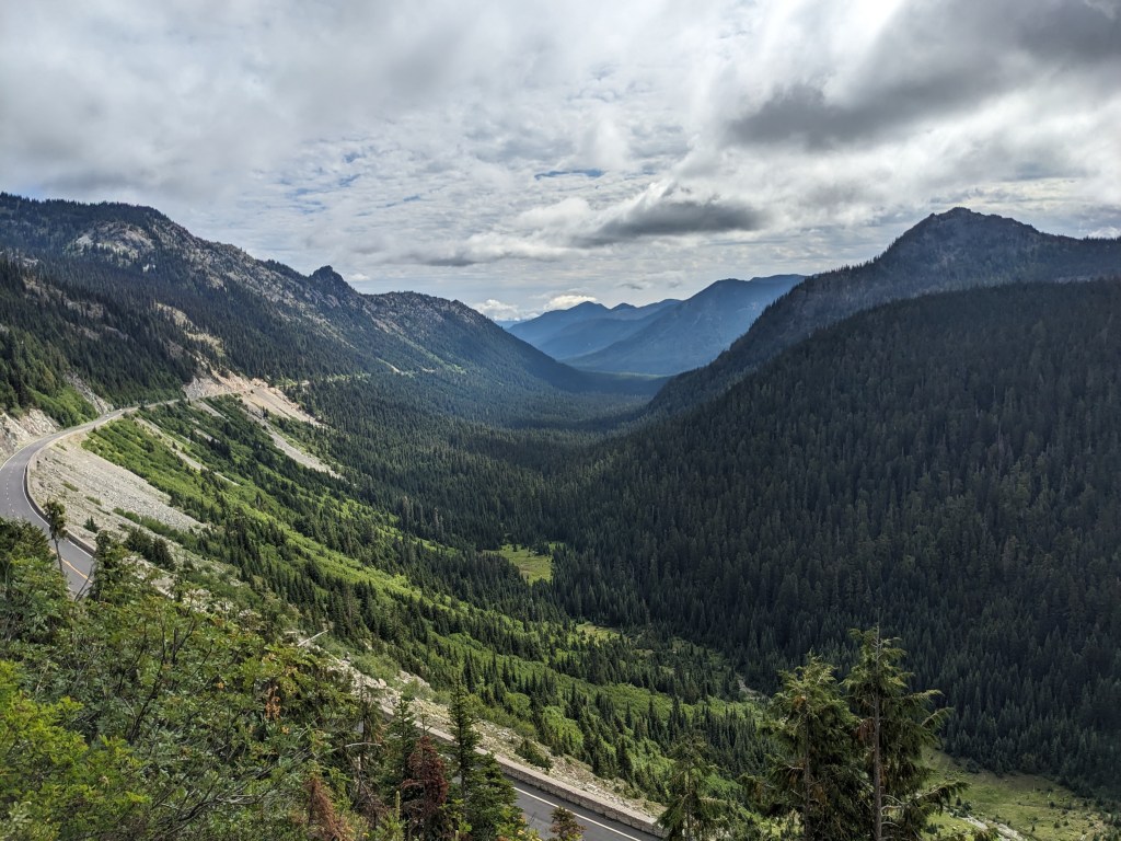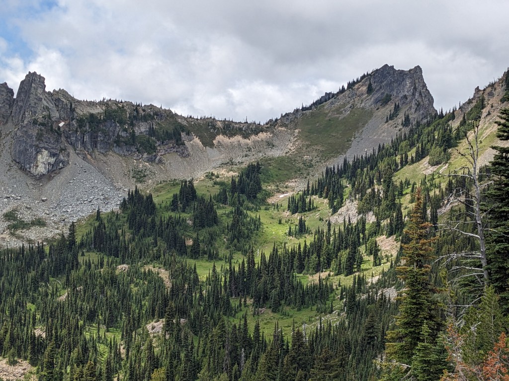 The night went on without any more rain. We both got up to pee at one point and so I got out of the tent first. When I got out there I could see eyes reflecting back, a deer. When we got back to the tent, I learned that she knew there was something walking around outside, but didn’t bother to tell me before I got up. We made our way down to Chinook Pass, lots of dayhikers as we got near the parking lot. The miles today were cold and in a cloud, but mild ups and downs throughout. No real rain, but we had jackets on for the wind. Camp is kinda windy, damp, and cold. PNW weather.