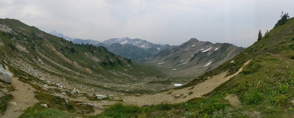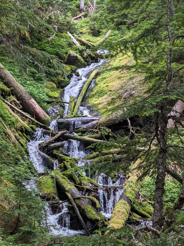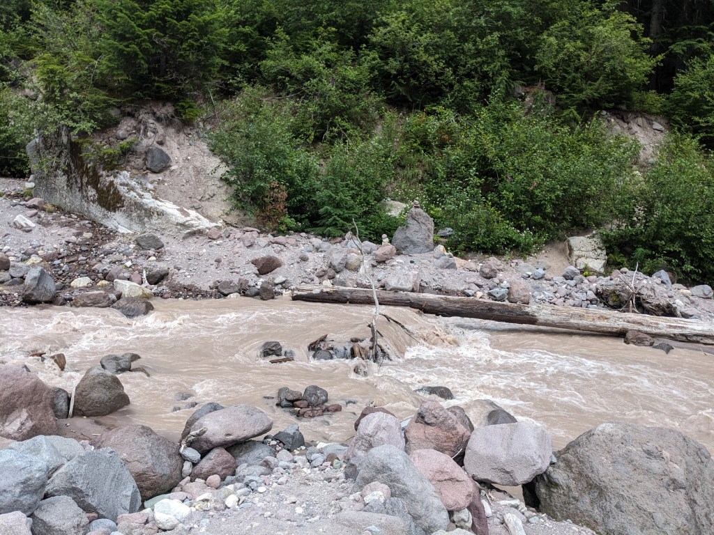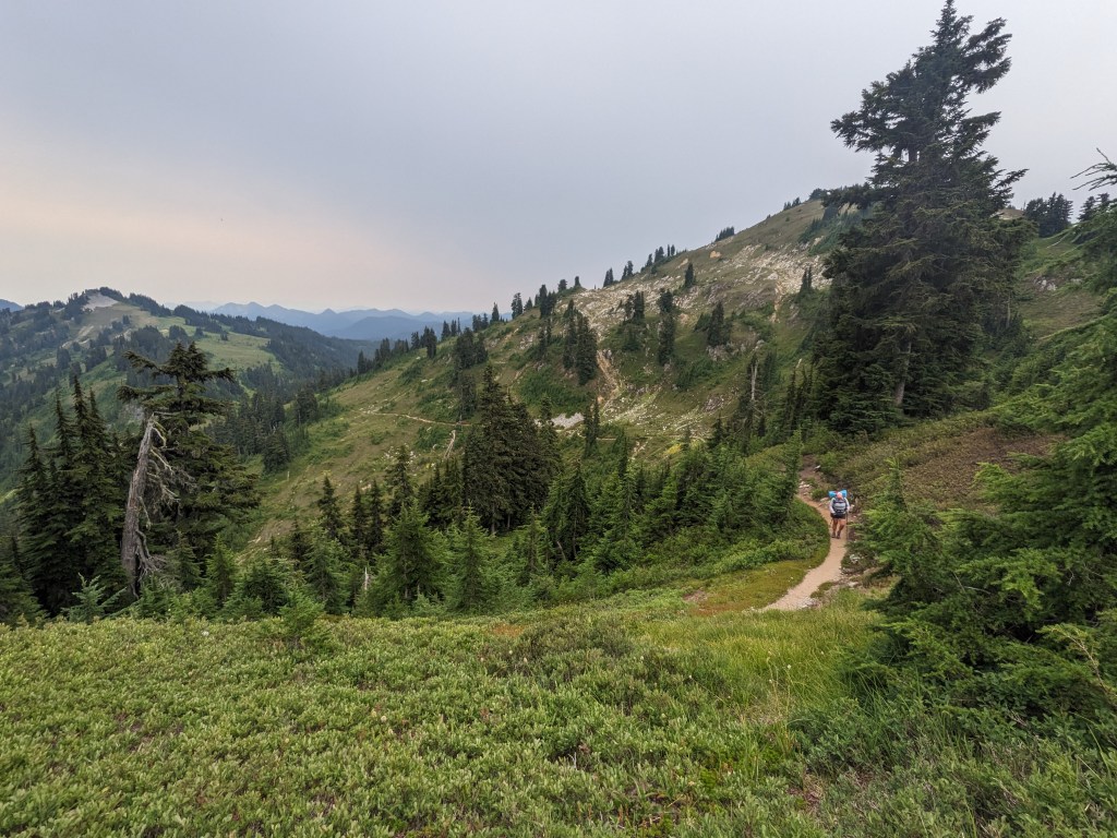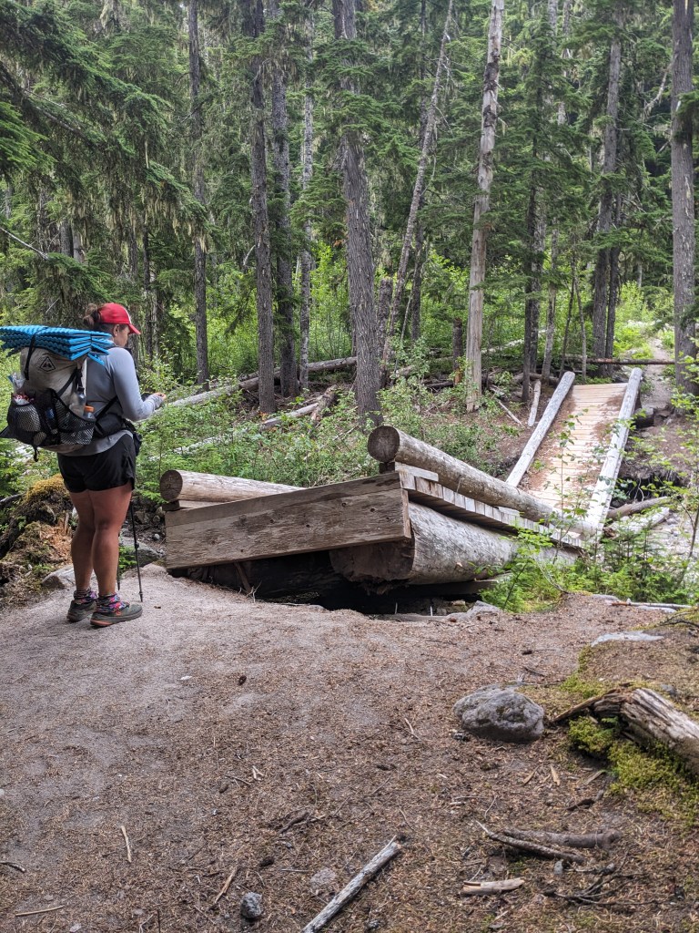 Wind kept us up a good portion of the night, it was ripping through the bowl we were in. We had trees on two sides, but the other two were a bit exposed. It shiftes directions around 3am, which is when we both smelled smoke. We hopped out to check for any visible fires, but saw none. In the morning, everything had a layer of dirt on it from what the wind kicked up. Everything has a grit to it. About 45 minutes after we got started walking, I was leading us downhill and behind me I hear a misstep and “Oh shit!”. I turned around and saw Marie tumbling over the side of the trail, downhill. Oh shit, indeed! I ran over as quick as I could, still wearing my pack. She was up against a tree about 5 feet downhill, on her back, with some of her gear thrown around. I dropped my pack, carefully stepped down to her, and helped her get her pack off. She was stable and seemingly unharmed, just obviously shaken. We got her back on the trail and put a couple band-aids on the small cut she had on her knee. If that happened on some of the traverses we did today, it would have been over. Scary moment for us on trail. We carried on, making our way toward Glacier Peak. We passed a group of trail runners that asked if we were thru-hikers, which we said yes. They said, “Great! There’s trail magic at White Pass!” Awesome. First trail magic this trip, plus it’s just up ahead, and it’s way out in the middle of nowhere in the place you would least expect it. Very excited, we made our way up and sure enough, a hiker named Sol was there with N/A beer, Oreos, Fritos, cookies, and watermelon slices. It was awesome and a huge boost to our day. She was very nice and personable and we chatted for awhile about trail stuff before moving on. Most of the day we hiked in a mild level of smoke (compared with what we hiked through in NorCal, this was nothing). We couldn’t see the fire, but it was burning one ridge over according to the posted notice. There’s a lot of chatter (mainly Far out comments and SoBos) that the next miles will be rough, with overgrowth and blowdowns being the issue. We ran into a bit of that in the last mile or two before Kennedy Creek. It was basically pushing yourself through leaves and branches, while a stream ran underneath you and every so often you have to climb over something. Slow going and tough. Then we have to cross Kennedy Creek, raging at this time of day, and there aren’t any good rock hops or downed logs for getting across. I went barefoot and rolled up my pants as far as I could. Marie just took her shoes off. Marie went first, and I followed a foot behind. She made it with careful steps across the creek. On the other side, we got our shoes back on and walked another half mile uphill to camp.