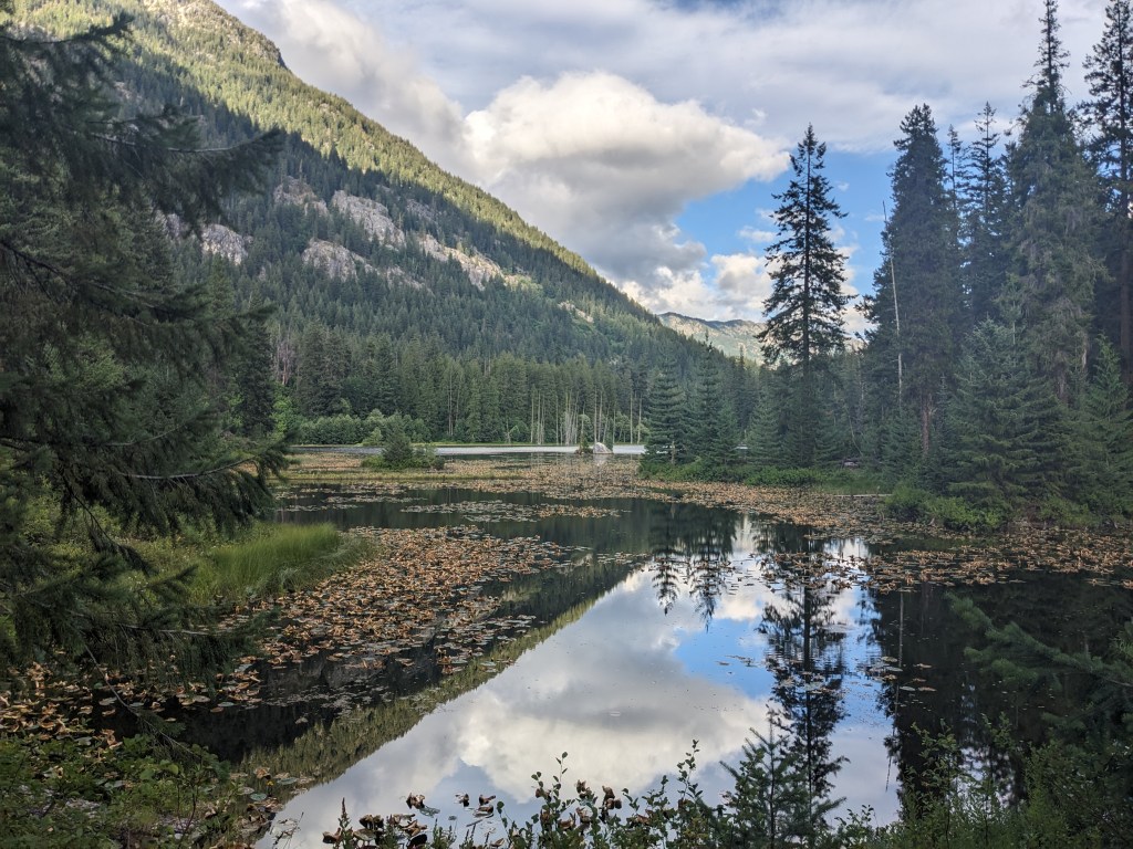 The laundry and showers didn’t open until 9, so we had no rush to get out of the tent. Eventually we made our way down from the group campsite to start our town chores. Not many hikers here so we didn’t have to wait in line and got done with it all fairly quickly. We picked up our resupply boxes and repacked our food. We definitely shipped more food than we’ll need so we trimmed it down and put the extras in the hiker box. From the hiker area, you can see upriver to where the trail is. It looked like it was raining over there, so we stayed in town and waited for the 6pm shuttle back. It was nice to be off our feet and be able to get snacks and beer from the general store throughout the afternoon. The bus took us back upriver and we breezed through the 5 miles to camp. We were the last ones to arrive, and there seems to be a group of guys on vacation camping here who are clearly drunk and being loud. Hiker midnight is 9/sunset. If you need a headlamp then you need to be quiet. And if you use a headlamp, try not to shine it on people’s tents. Use the red light mode when you can. Simple stuff.