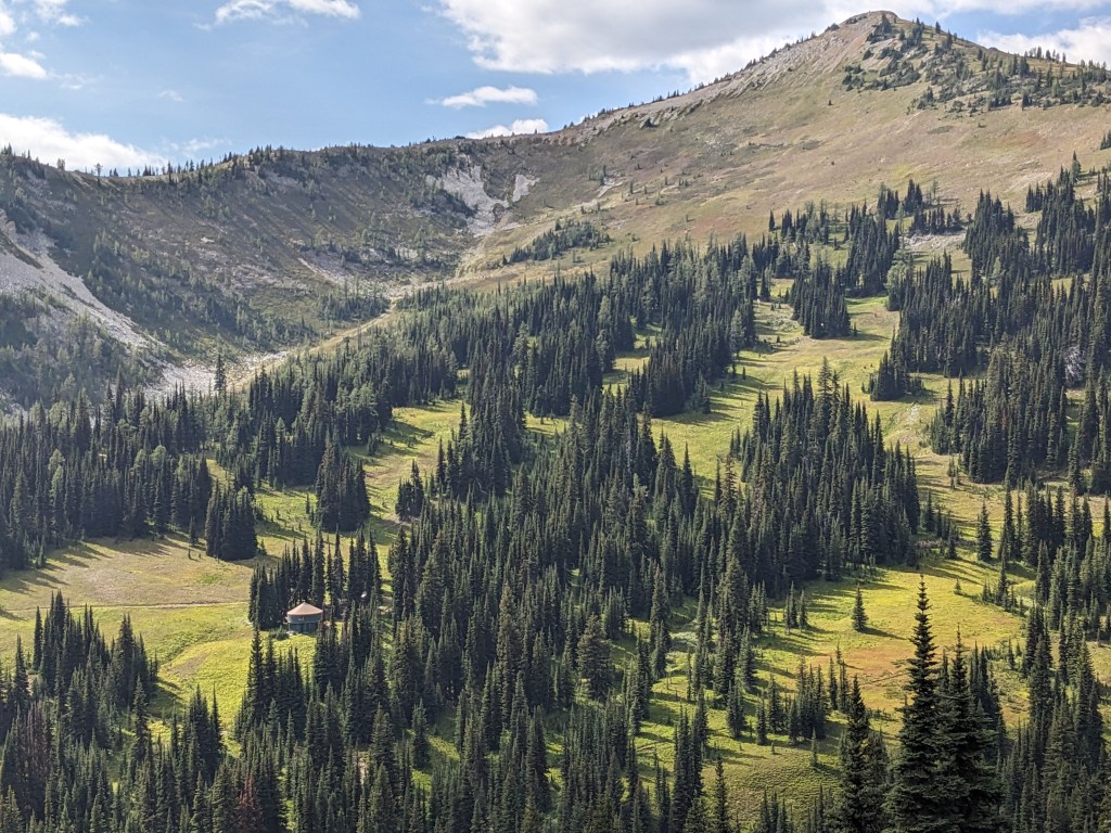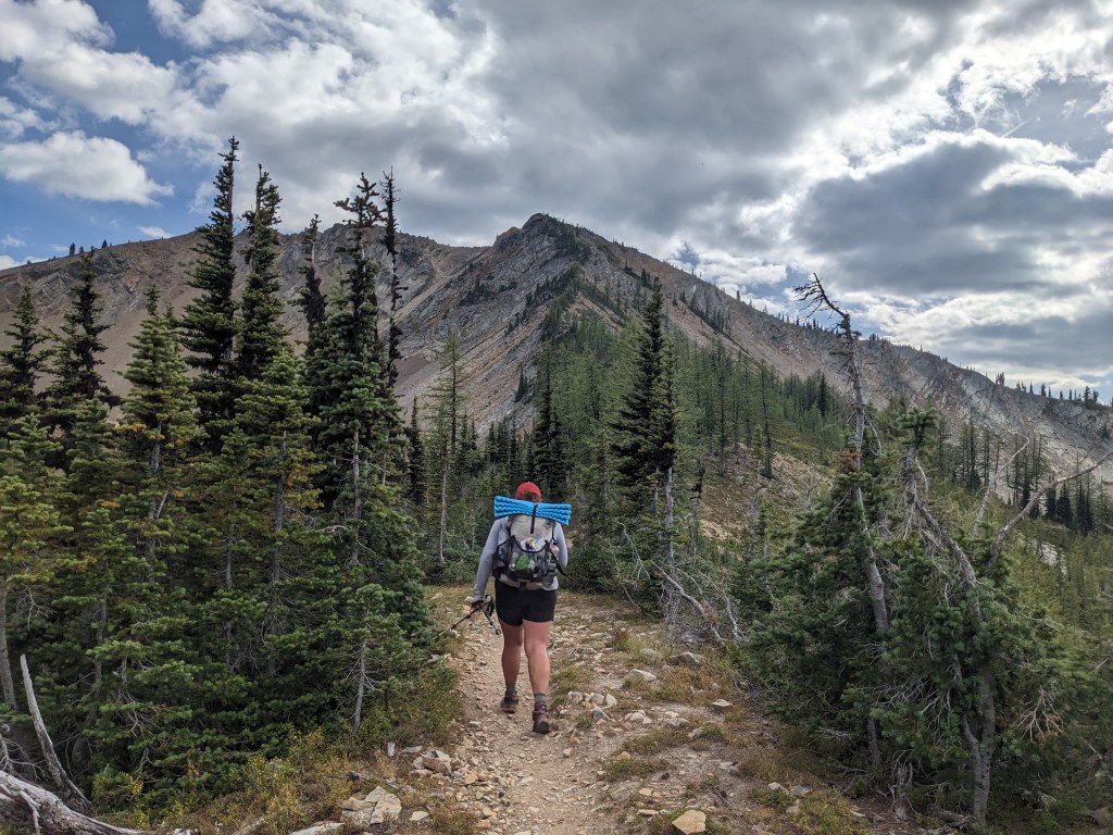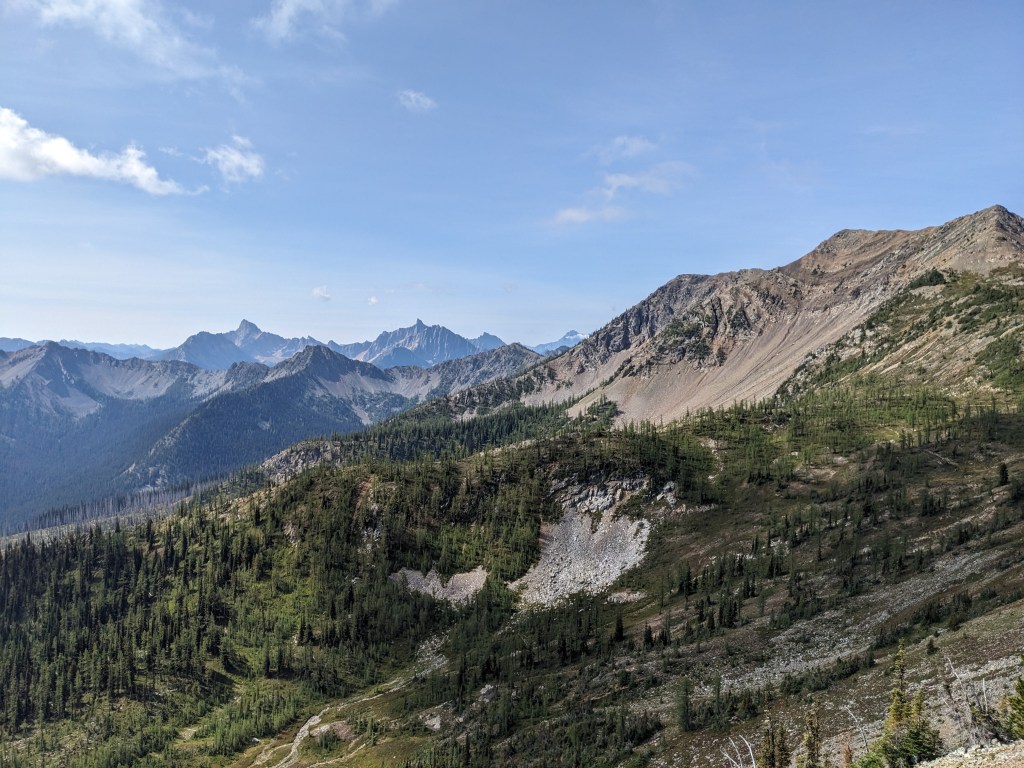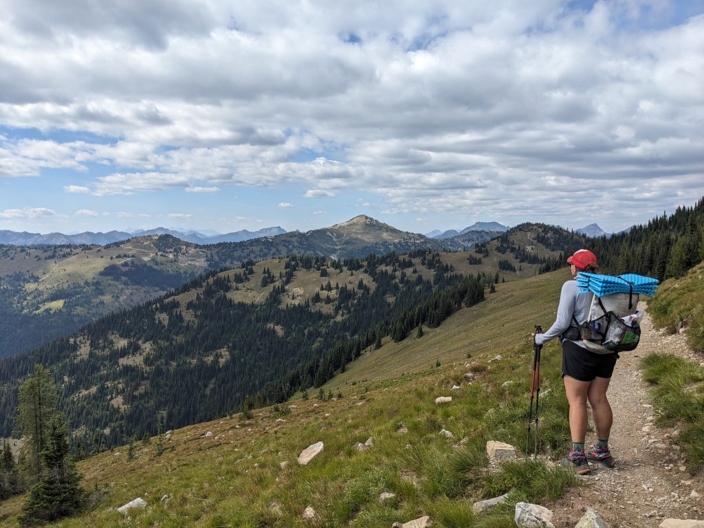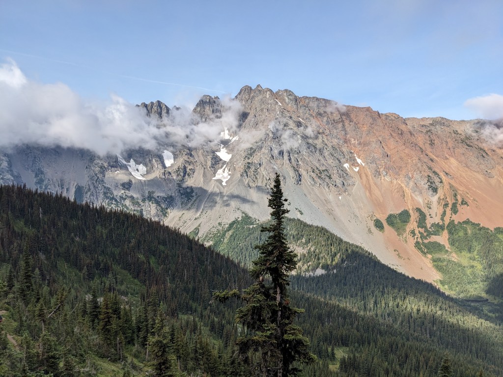 Luckily, no deer last night. We continued the climb up to Harts Pass in the morning. The clouds around Azurite Peak rolled around, so each switchback gave a new view of the mountain. A long ridge walk over to the parking lot at Harts Pass. We had hoped to meet up with Yardsale, Chickadee, and Raiden at Harts Pass, and sure enough, they were there! We caught up real quick as they tried to hitch a ride into Mazama. A car pulled over, but instead of giving a ride, gave trail magic. We all got beer, chips, and candy. It was quite a treat. The gang eventually got a ride down the mountain, but we hung out for a bit longer with all of the other hikers who had gathered. A couple Czech hikers passed around a Gatorade bottle of whiskey to the group. We eventually left the group and signed the trail register. Checked the hiker box for any last minute goodies, and then started hiking again. We still needed to eat lunch so we grabbed water at the next stream and then stopped in a shaded flat spot. The views all around were great the rest of the day. We weaved around on a ridge eventually stopping just before Shaw Creek. There’s another deer near camp and it’s even more comfortable being around humans as last night’s deer.