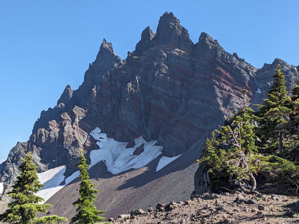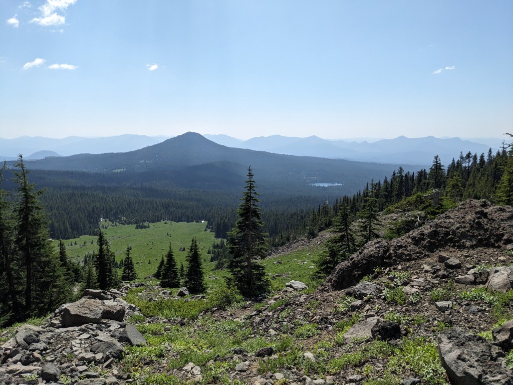 12 miles We used our town stay to get our issues more or less fixed. We got to Hike-n-Peaks in the morning to get a new pillow for Marie. We struck out on the other items, but they weren’t as vital so we are continuing on without. Two hitches on the way back to trail, the first from a guy that works at one of the summer camps in the area (but not BLYC), and the second from a couple in a van headed to Oregon Country Fair. All 3 were nice people and a big help to get up the highway and back to the trailhead. It was around 12:30 when we got moving, feeling ready but knowing the sun was working against us. It was a hot, dusty climb, but scenic and relatively easy. Later in the day we were passed by Bag Bowl who was moving fast. The views in this section were great circling around Three Finger Jack mountain. It’s neat to see it from three sides over the course of the day. The last few hours were tiring and slow because of the large amount of blown down trees. It also left few options for camping, and the spot we have I’m still nervous about. The wind is stronger than I’d like, but I’m hoping it dies down overnight and nothing falls on top of us.