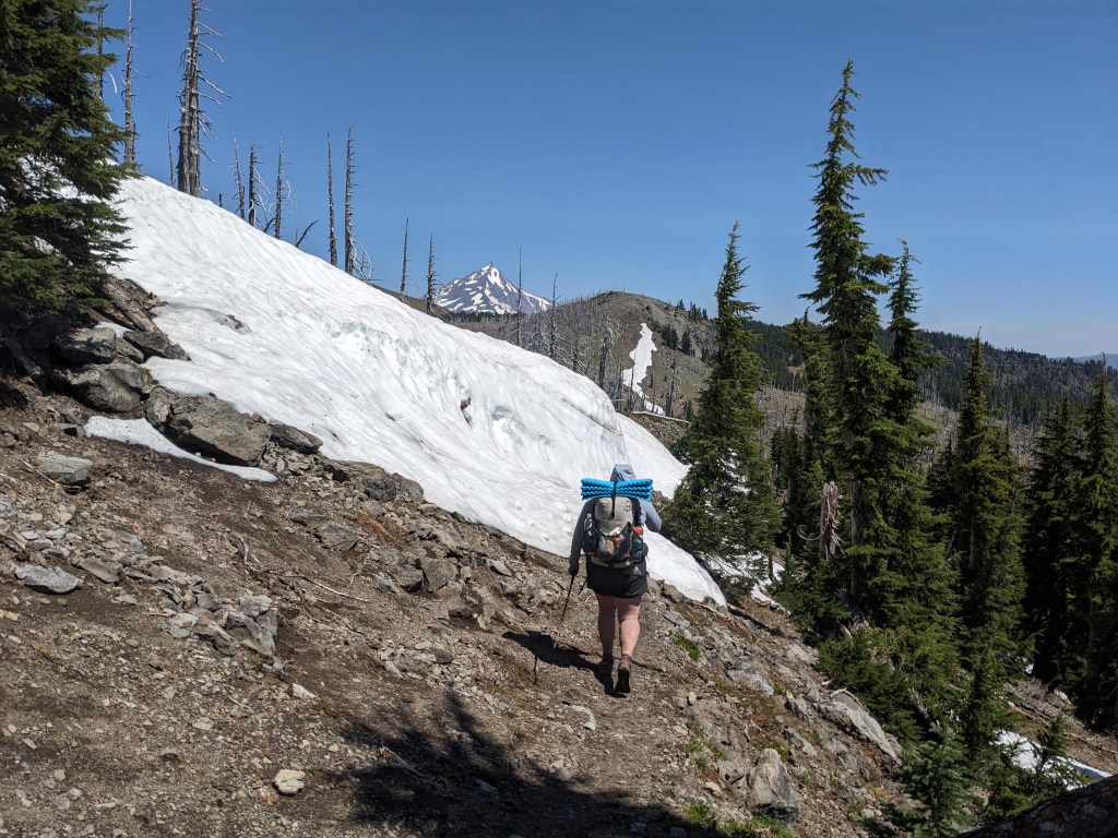 16 miles The start of our day was spent navigating more blowdown. Three hikers heading SOBO passed us almost as soon as we had started walking. We exchanged info about what trail conditions to expect for each other and then carried on. They said more snow patches to traverse and we said more blowdowns. They were right, and we spent a fair amount of time walking on snow throughout the day. Our first water source was Rockpile Lake, and we hung out there for awhile. We both got in to rinse off and cool down. Another hiker, Storytime (Storyteller?), joined us for most of that time. She is an outdoor guide for teens, ski instructor, generally a bad ass. She gave us cookies since she had too much food and was getting off trail in a few days. We also have too much food, but accepted the cookies since they were homemade from her mom. We told her how we were passed by Bag Bowl yesterday and she got excited. They had hiked together in SoCal and she was going to try to catch up to him even though he’s an extremely fast hiker. We all eventually packed up and started wandering through half-trail/half-snow. And some blowdowns thrown in for fun. If you’re not climbing over a tree, you’re trying to kick steps and maintain footing over snow patches. We stopped for a late lunch at Shale Lake where there were some weekenders enjoying the permit-required spots near the lake. One guy hung a bear bag, which got us talking about our storage technique, which is to just sleep with it. With some food and water put down, we cruised through the last 5 miles, mostly downhill, to our campsite near Milk Creek. I don’t have hiker hunger yet, so I had to force myself to eat even a few things. I have way too much food at this point. A climb awaits us in the morning so hoping for a good night of sleep.